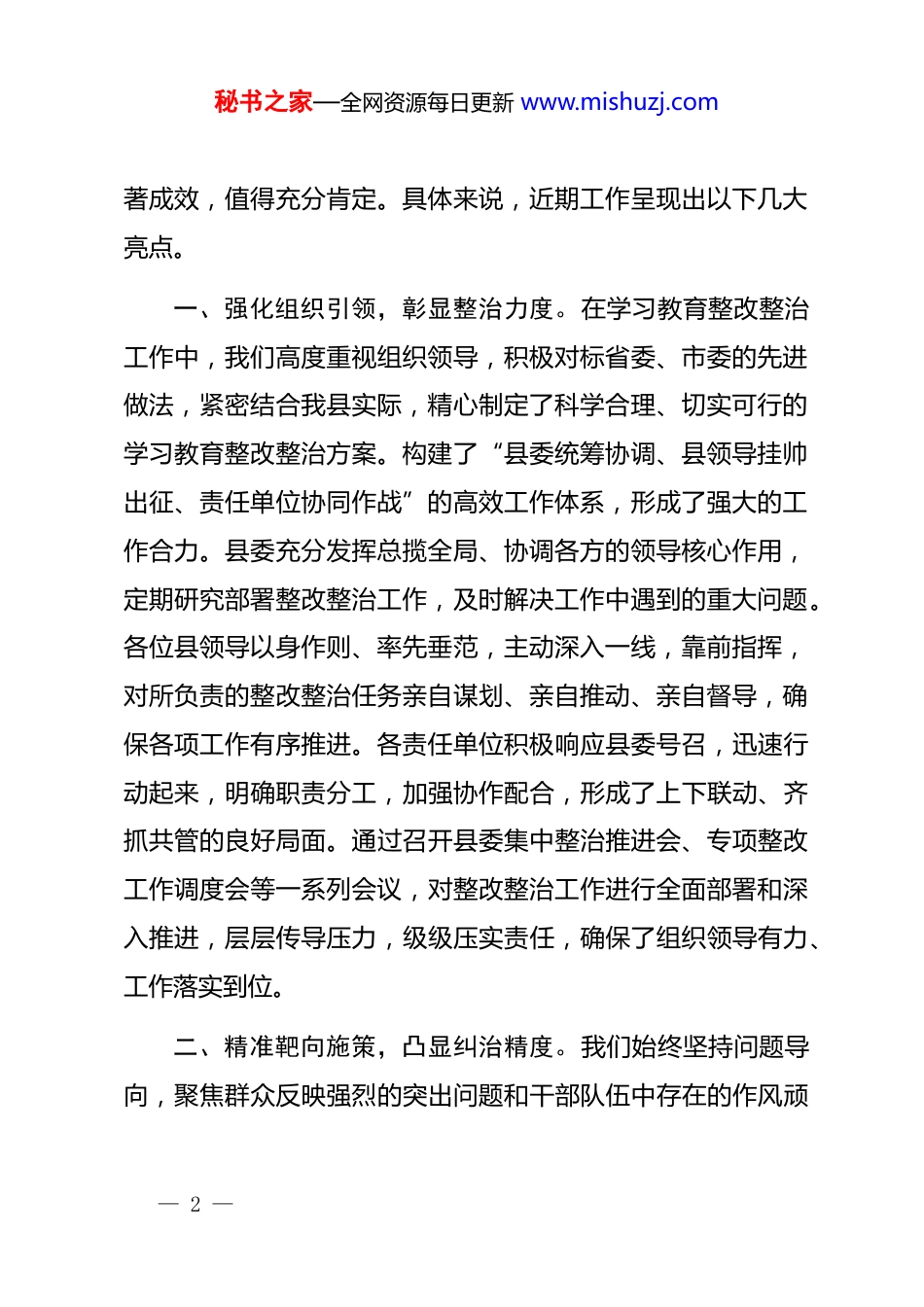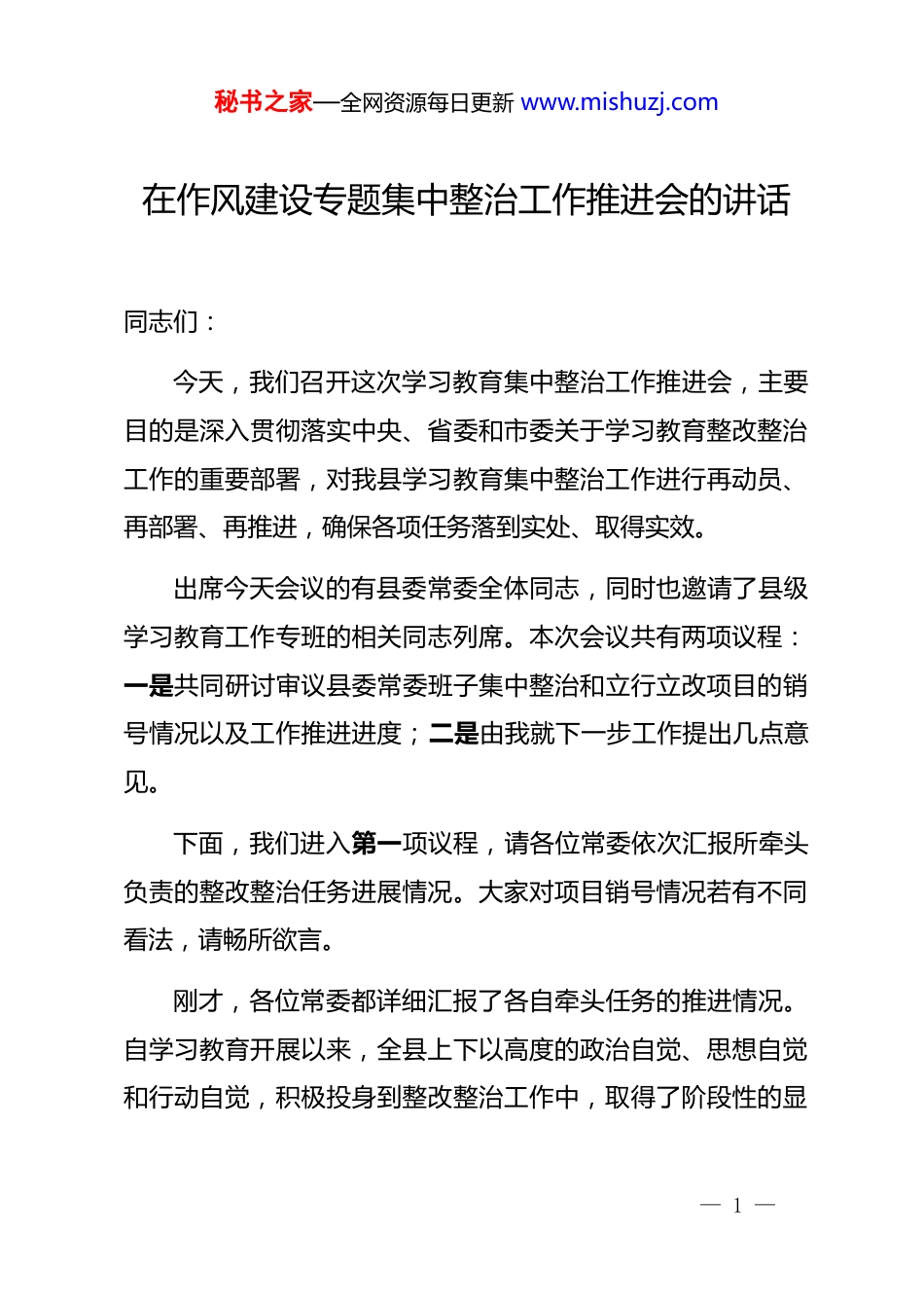 秘书之家—全网资源每日更新 www.mishuzj.com在作风建设专题集中整治工作推进会的讲话同志们:今天,我们召开这次学习教育集中整治工作推进会,主要目的是深入贯彻落实中央、省委和市委关于学习教育整改整治工作的重要部署,对我县学习教育集中整治工作进行再动员、再部署、再推进,确保各项任务落到实处、取得实效。出席今天会议的有县委常委全体同志,同时也邀请了县级学习教育工作专班的相关同志列席。本次会议共有两项议程:一是共同研讨审议县委常委班子集中整治和立行立改项目的销号情况以及工作推进进度;二是由我就下一步工作提出几点意见。下面,我们进入第一项议程,请各位常委依次汇报所牵头负责的整改整治任务进展情况。大家对项目销号情况若有不同看法,请畅所欲言。刚才,各位常委都详细汇报了各自牵头任务的推进情况。自学习教育开展以来,全县上下以高度的政治自觉、思想自觉和行动自觉,积极投身到整改整治工作中,取得了阶段性的显— 1 —秘书之家—全网资源每日更新 www.mishuzj.com著成效,值得充分肯定。具体来说,近期工作呈现出以下几大亮点。一、强化组织引领,彰显整治力度。在学习教育整改整治工作中,我们高度重视组织领导,积极对标省委、市委的先进做法,紧密结合我县实际,精心制定了科学合理、切实可行的学习教育整改整治方案。构建了“县委统筹协调、县领导挂帅出征、责任单位协同作战”的高效工作体系,形成了强大的工作合力。县委充分发挥总揽全局、协调各方的领导核心作用,定期研究部署整改整治工作,及时解决工作中遇到的重大问题。各位县领导以身作则、率先垂范,主动深入一线,靠前指挥,对所负责的整改整治任务亲自谋划、亲自推动、亲自督导,确保各项工作有序推进。各责任单位积极响应县委号召,迅速行动起来,明确职责分工,加强协作配合,形成了上下联动、齐抓共管的良好局面。通过召开县委集中整治推进会、专项整改工作调度会等一系列会议,对整改整治工作进行全面部署和深入推进,层层传导压力,级级压实责任,确保了组织领导有力、工作落实到位。二、精准靶向施策,凸显纠治精度。我们始终坚持问题导向,聚焦群众反映强烈的突出问题和干部队伍中存在的作风顽— 2 —秘书之家—全网资源每日更新 www.mishuzj.com疾,进行了全面深入的排查和梳理。共梳理出 xx 个重点问题,涵盖了干部不作为、慢作为、乱作为等多个方面。针对这些问题,我们深入剖析问题根源,找准问题症结,制定了精准有效的整改措施。对于能够立即整改的问题,我们明确了整改责任人、整改措施和整改时限,实行销号管理,确保问题整改到位、不反弹。对于需要长期整改的问题,我们制定了详细的整治方案,明确了整治目标、工作重点和具体举措,建立了台账,实行跟踪管理,定期对整改情况进行检查和评估,确保问题得到有效解决。在整改过程中,我们坚决杜绝形式主义,注重实际效果,以实实在在的整改成效取信于民。三、聚焦群众需求,体现服务温度。学习教育整改整治工作的最终目的是为了更好地服务群众、造福群众。我们始终把群众的利益放在首位,坚持以人民为中心的发展思想,聚焦群众的操心事、烦心事、揪心事,积极主动地为群众办实事、解难题。在整改整治过程中,我们广泛听取群众意见,深入了解群众需求,及时回应群众关切。通过开展“我为群众办实事”实践活动,组织*员干部深入基层、深入群众,走访调研,了解群众的实际困难和问题,并积极协调解决。针对群众反映的就业、教育、医疗、住房等方面的问题,我们加大了工作力度,— 3 —秘书之家—全网资源每日更新 www.mishuzj.com出台了一系列惠民政策和措施,努力提高群众的获得感、幸福感和安全感。同时,我们还注重加强与群众的沟通交流,及时向群众反馈整改整治工作进展情况,让群众感受到我们的真心实意和工作成效,赢得了群众的广泛支持和认可。四、注重长效机制,拓展整治深度。整改整治工作不仅要解决当前存在的问题,更要建立健全长效机制,防止问题反弹回潮。我们在抓好问题整改的同时,注重总结经验教训,深入分析问题产生的深层次原因,从制度层面入手,建立健全长效机制,不断巩固和拓展...