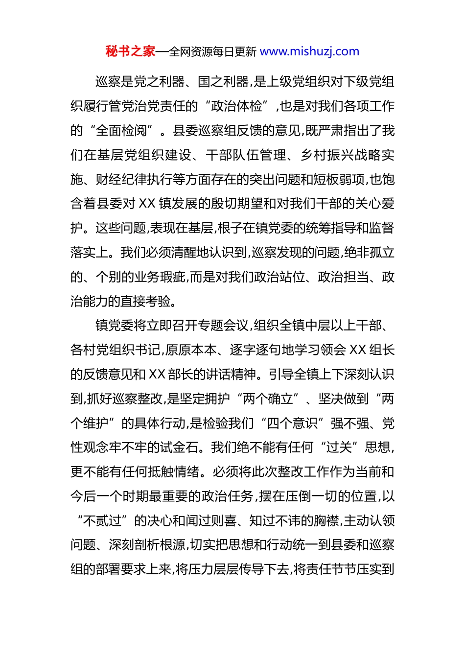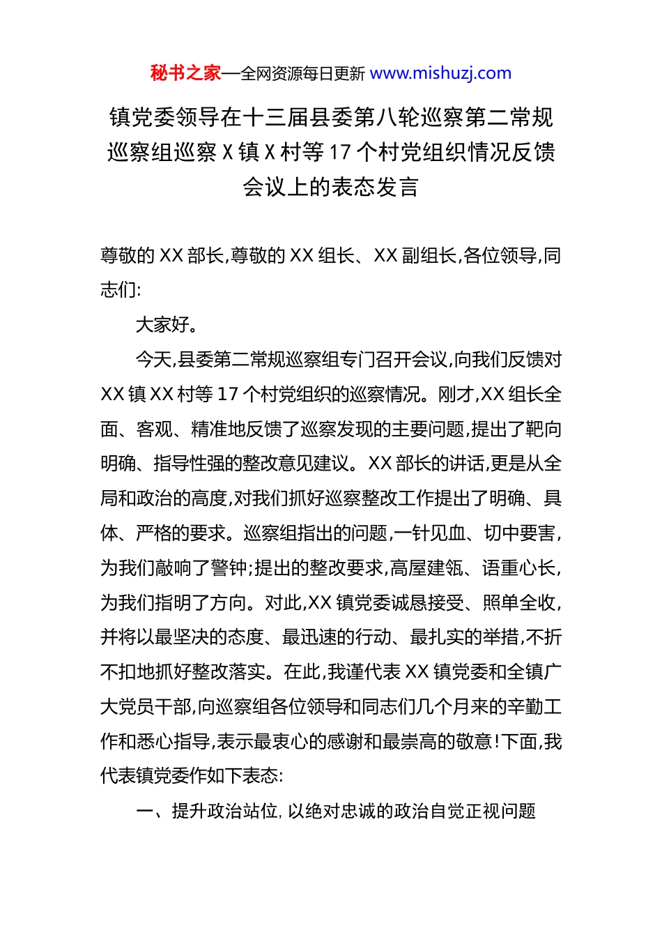 秘书之家—全网资源每日更新 www.mishuzj.com镇党委领导在十三届县委第八轮巡察第二常规巡察组巡察 X 镇 X 村等 17 个村党组织情况反馈会议上的表态发言 尊敬的 XX 部长,尊敬的 XX 组长、XX 副组长,各位领导,同志们:大家好。今天,县委第二常规巡察组专门召开会议,向我们反馈对XX 镇 XX 村等 17 个村党组织的巡察情况。刚才,XX 组长全面、客观、精准地反馈了巡察发现的主要问题,提出了靶向明确、指导性强的整改意见建议。XX 部长的讲话,更是从全局和政治的高度,对我们抓好巡察整改工作提出了明确、具体、严格的要求。巡察组指出的问题,一针见血、切中要害,为我们敲响了警钟;提出的整改要求,高屋建瓴、语重心长,为我们指明了方向。对此,XX 镇党委诚恳接受、照单全收,并将以最坚决的态度、最迅速的行动、最扎实的举措,不折不扣地抓好整改落实。在此,我谨代表 XX 镇党委和全镇广大党员干部,向巡察组各位领导和同志们几个月来的辛勤工作和悉心指导,表示最衷心的感谢和最崇高的敬意!下面,我代表镇党委作如下表态:一、提升政治站位,以绝对忠诚的政治自觉正视问题秘书之家—全网资源每日更新 www.mishuzj.com巡察是党之利器、国之利器,是上级党组织对下级党组织履行管党治党责任的“政治体检”,也是对我们各项工作的“全面检阅”。县委巡察组反馈的意见,既严肃指出了我们在基层党组织建设、干部队伍管理、乡村振兴战略实施、财经纪律执行等方面存在的突出问题和短板弱项,也饱含着县委对 XX 镇发展的殷切期望和对我们干部的关心爱护。这些问题,表现在基层,根子在镇党委的统筹指导和监督落实上。我们必须清醒地认识到,巡察发现的问题,绝非孤立的、个别的业务瑕疵,而是对我们政治站位、政治担当、政治能力的直接考验。镇党委将立即召开专题会议,组织全镇中层以上干部、各村党组织书记,原原本本、逐字逐句地学习领会 XX 组长的反馈意见和 XX 部长的讲话精神。引导全镇上下深刻认识到,抓好巡察整改,是坚定拥护“两个确立”、坚决做到“两个维护”的具体行动,是检验我们“四个意识”强不强、党性观念牢不牢的试金石。我们绝不能有任何“过关”思想,更不能有任何抵触情绪。必须将此次整改工作作为当前和今后一个时期最重要的政治任务,摆在压倒一切的位置,以“不贰过”的决心和闻过则喜、知过不讳的胸襟,主动认领问题、深刻剖析根源,切实把思想和行动统一到县委和巡察组的部署要求上来,将压力层层传导下去,将责任节节压实到秘书之家—全网资源每日更新 www.mishuzj.com位,确保全镇上下形成“整改不落实,就是对党不忠诚”的高度共识,以刮骨疗毒的勇气和自我革命的精神,坚决彻底地完成好这项严肃的政治任务。二、强化责任担当,以坚如磐石的政治定力狠抓整改整改不力,根源在于责任虚化。巡察反馈意见指出的每一个问题,都是一份沉甸甸的政治责任。XX 镇党委将坚决扛起巡察整改的主体责任,绝不推诿、绝不敷衍。我作为镇党委书记,是巡察整改工作的第一责任人,对全镇的整改工作负总责。我将直接领导、亲自部署、全程督办,对重要工作直接协调,对重大问题直接过问,对重点环节直接督导,确保整改方向不偏、力度不减。镇党委班子其他成员将严格履行“一岗双责”,主动认领分管领域内的整改任务,加强对分管部门和联系村街的督促指导,形成“班子成员牵头、分管领导负责、相关部门联动”的整改工作格局。各被巡察村党组织书记是本村整改的直接责任人,必须坚决摒弃“等、靠、要”思想,不等不靠,立行立改,把整改责任牢牢扛在肩上、抓在手上。为确保整改工作高效有序推进,镇党委决定,立即成立由我任组长,相关班子成员任副组长,镇纪委、组织、党建、农业、财政等部门负责人为成员的“XX 镇巡察整改工作领导小组”。领导小组下设办公室,负责日常工作的统筹协调、秘书之家—全网资源每日更新 www.mishuzj.com督促检查和情况汇总。我们将以最快的速度,在深入分析问题的基础上,研究制定一份高质量、可操作的《XX 镇党委关于落实县委第二常规巡察组反馈意见的整改方案》。这份方案将不仅仅是一份文件,而是一份详尽的“作战图”和“责任书”。三、坚持问题导向,以较真碰硬的务实举措根除病...