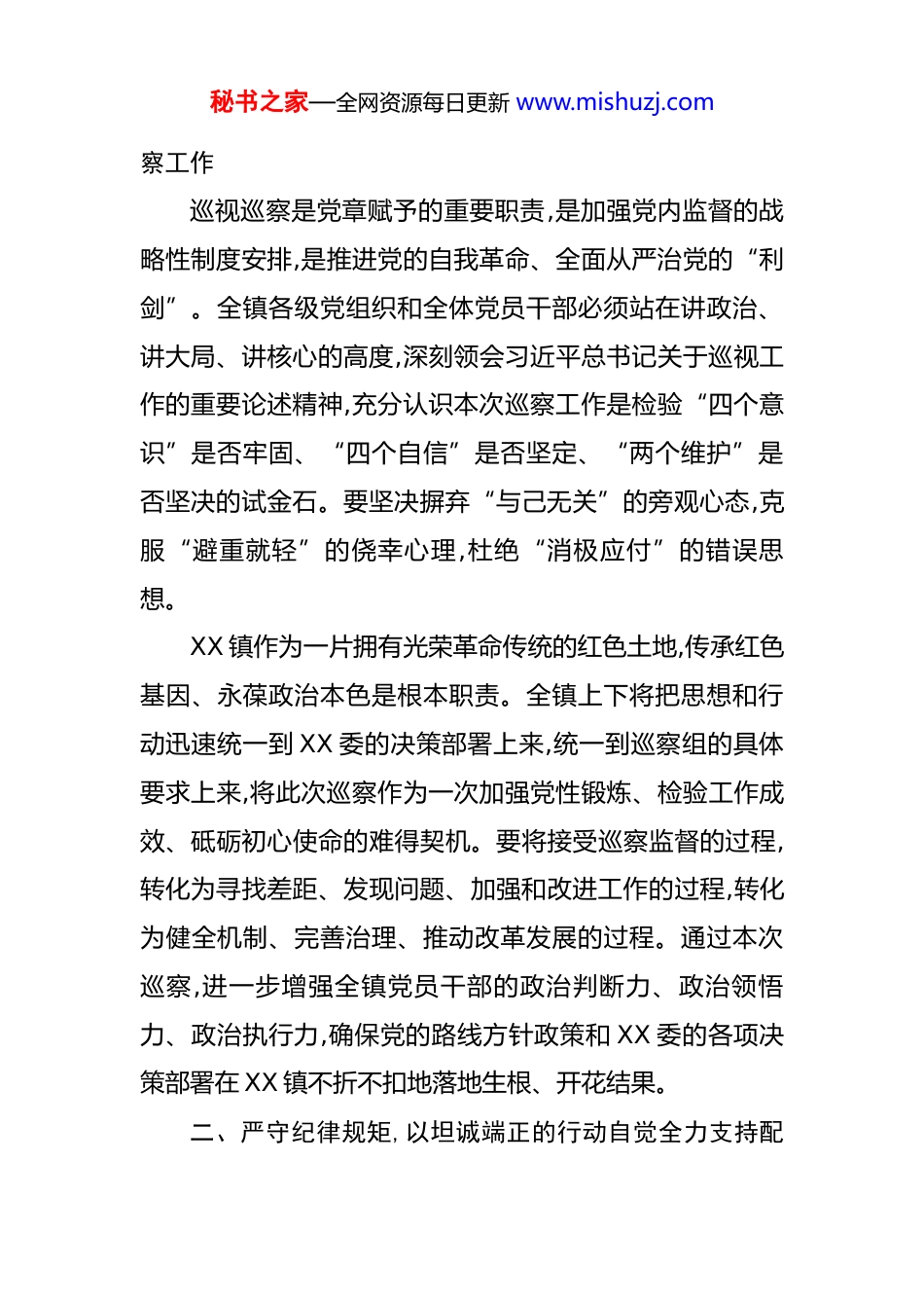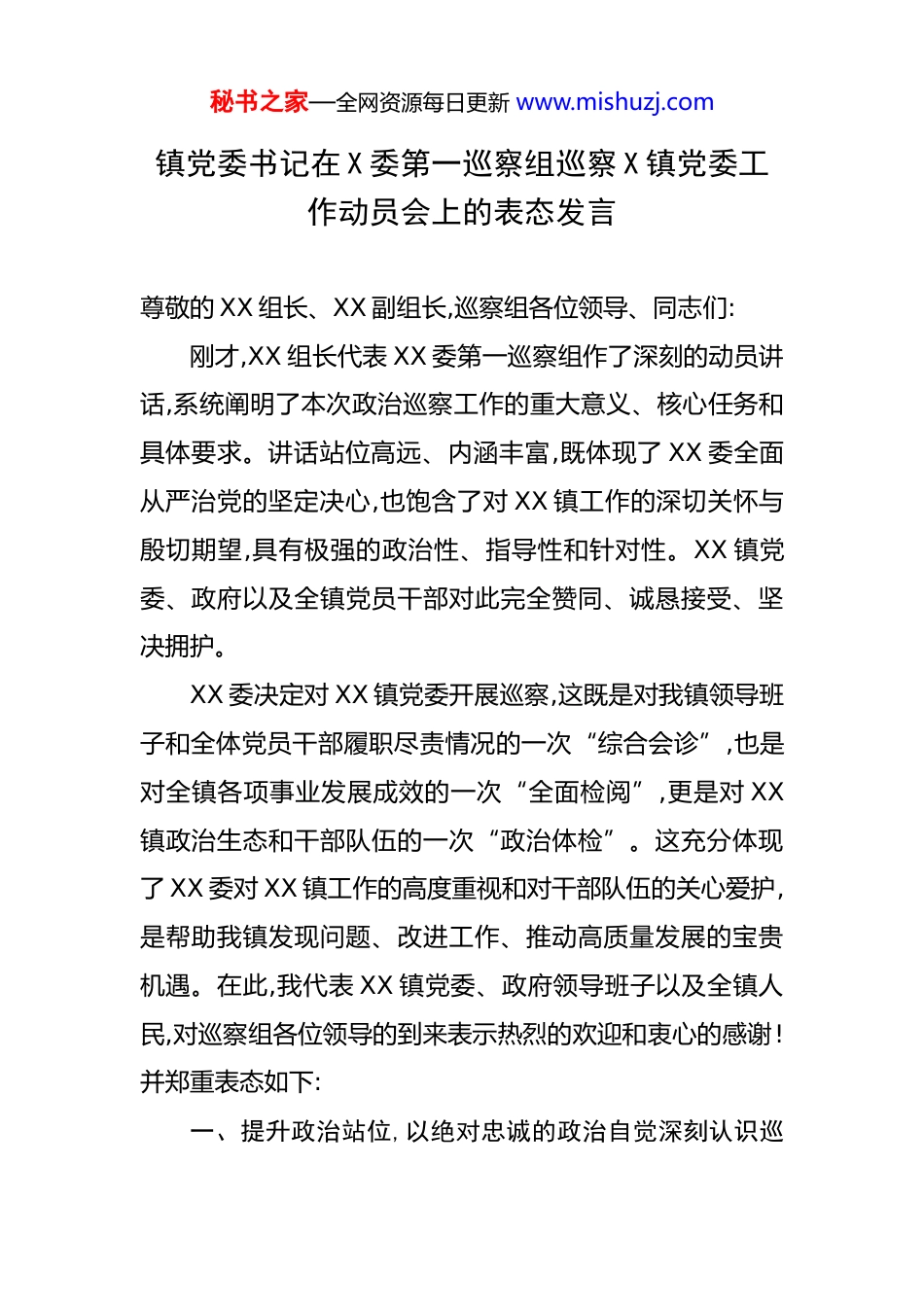 秘书之家—全网资源每日更新 www.mishuzj.com镇党委书记在 X 委第一巡察组巡察 X 镇党委工作动员会上的表态发言 尊敬的 XX 组长、XX 副组长,巡察组各位领导、同志们:刚才,XX 组长代表 XX 委第一巡察组作了深刻的动员讲话,系统阐明了本次政治巡察工作的重大意义、核心任务和具体要求。讲话站位高远、内涵丰富,既体现了 XX 委全面从严治党的坚定决心,也饱含了对 XX 镇工作的深切关怀与殷切期望,具有极强的政治性、指导性和针对性。XX 镇党委、政府以及全镇党员干部对此完全赞同、诚恳接受、坚决拥护。XX 委决定对 XX 镇党委开展巡察,这既是对我镇领导班子和全体党员干部履职尽责情况的一次“综合会诊”,也是对全镇各项事业发展成效的一次“全面检阅”,更是对 XX镇政治生态和干部队伍的一次“政治体检”。这充分体现了 XX 委对 XX 镇工作的高度重视和对干部队伍的关心爱护,是帮助我镇发现问题、改进工作、推动高质量发展的宝贵机遇。在此,我代表 XX 镇党委、政府领导班子以及全镇人民,对巡察组各位领导的到来表示热烈的欢迎和衷心的感谢!并郑重表态如下:一、提升政治站位,以绝对忠诚的政治自觉深刻认识巡秘书之家—全网资源每日更新 www.mishuzj.com察工作巡视巡察是党章赋予的重要职责,是加强党内监督的战略性制度安排,是推进党的自我革命、全面从严治党的“利剑”。全镇各级党组织和全体党员干部必须站在讲政治、讲大局、讲核心的高度,深刻领会习近平总书记关于巡视工作的重要论述精神,充分认识本次巡察工作是检验“四个意识”是否牢固、“四个自信”是否坚定、“两个维护”是否坚决的试金石。要坚决摒弃“与己无关”的旁观心态,克服“避重就轻”的侥幸心理,杜绝“消极应付”的错误思想。XX 镇作为一片拥有光荣革命传统的红色土地,传承红色基因、永葆政治本色是根本职责。全镇上下将把思想和行动迅速统一到 XX 委的决策部署上来,统一到巡察组的具体要求上来,将此次巡察作为一次加强党性锻炼、检验工作成效、砥砺初心使命的难得契机。要将接受巡察监督的过程,转化为寻找差距、发现问题、加强和改进工作的过程,转化为健全机制、完善治理、推动改革发展的过程。通过本次巡察,进一步增强全镇党员干部的政治判断力、政治领悟力、政治执行力,确保党的路线方针政策和 XX 委的各项决策部署在 XX 镇不折不扣地落地生根、开花结果。二、严守纪律规矩,以坦诚端正的行动自觉全力支持配秘书之家—全网资源每日更新 www.mishuzj.com合巡察工作支持配合巡察组开展工作,是 XX 镇党委必须履行的政治责任和应尽义务。全镇上下将把接受巡察监督作为当前一项极其重要的政治任务,以最坚决的态度、最优良的作风、最严明的纪律,全力以赴为巡察工作顺利开展创造最优环境。一是坚决服从安排。对于巡察组提出的各项工作要求,XX 镇党委将第一时间响应、第一时间落实,不讲条件、不打折扣、不搞变通。党委主要负责同志将切实履行第一责任人职责,班子成员将严格落实“一岗双责”,带头接受监督检查,确保巡察工作有力有序推进。二是主动做好保障。立即成立巡察工作联络协调组,由专人负责与巡察组的日常沟通、协调和服务工作。确保在办公条件、食宿安排、后勤服务等方面提供周到细致的保障,为巡察组高效开展工作创造一切便利条件。三是如实提供材料。坚持实事求是的原则,客观、真实、准确地向巡察组汇报工作、反映情况。无论是工作中的成绩亮点,还是存在的短板不足,都将原原本本、毫无保留地呈现。对于巡察组需要调阅的各类文件、档案、台账等资料,确保第一时间提供,绝不推诿拖延,绝不弄虚作假。全镇任何部门和个人都必须严格遵守巡察纪律,保证巡察组听到秘书之家—全网资源每日更新 www.mishuzj.com真声音、掌握实情况。四是畅通反映渠道。将通过各种有效方式,在全镇范围内公开巡察组的联系电话、电子邮箱等监督渠道,鼓励和支持广大干部群众本着对党负责、对事业负责、对同志负责的态度,客观公正地向巡察组反映问题,为巡察组全面了解XX 镇情况提供有力支持,营造开诚布公、坦诚相待的良好氛围。三、聚焦问题整改,以动真碰硬的成果导向扎实做好巡察“后半篇文章”巡察的根本...