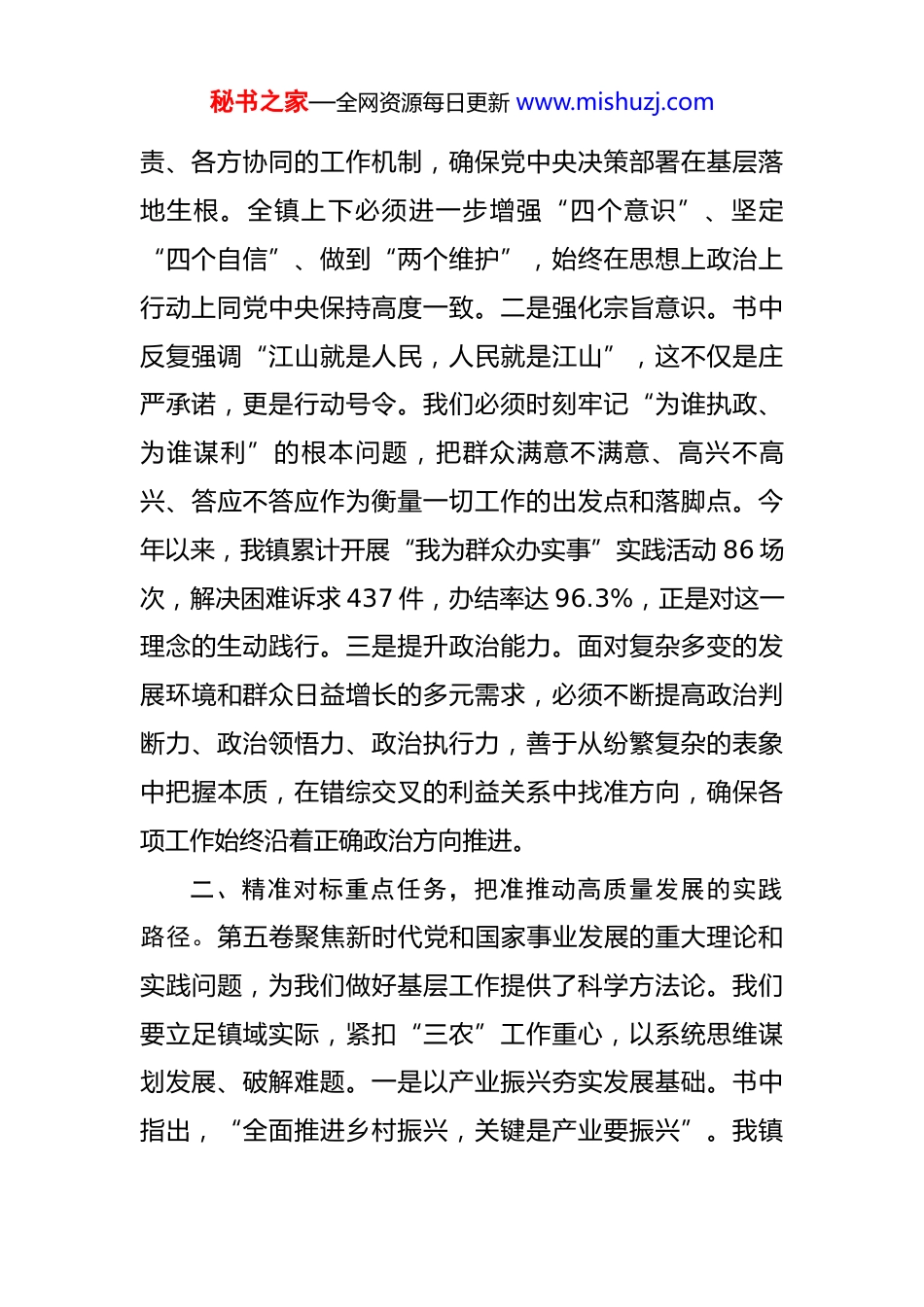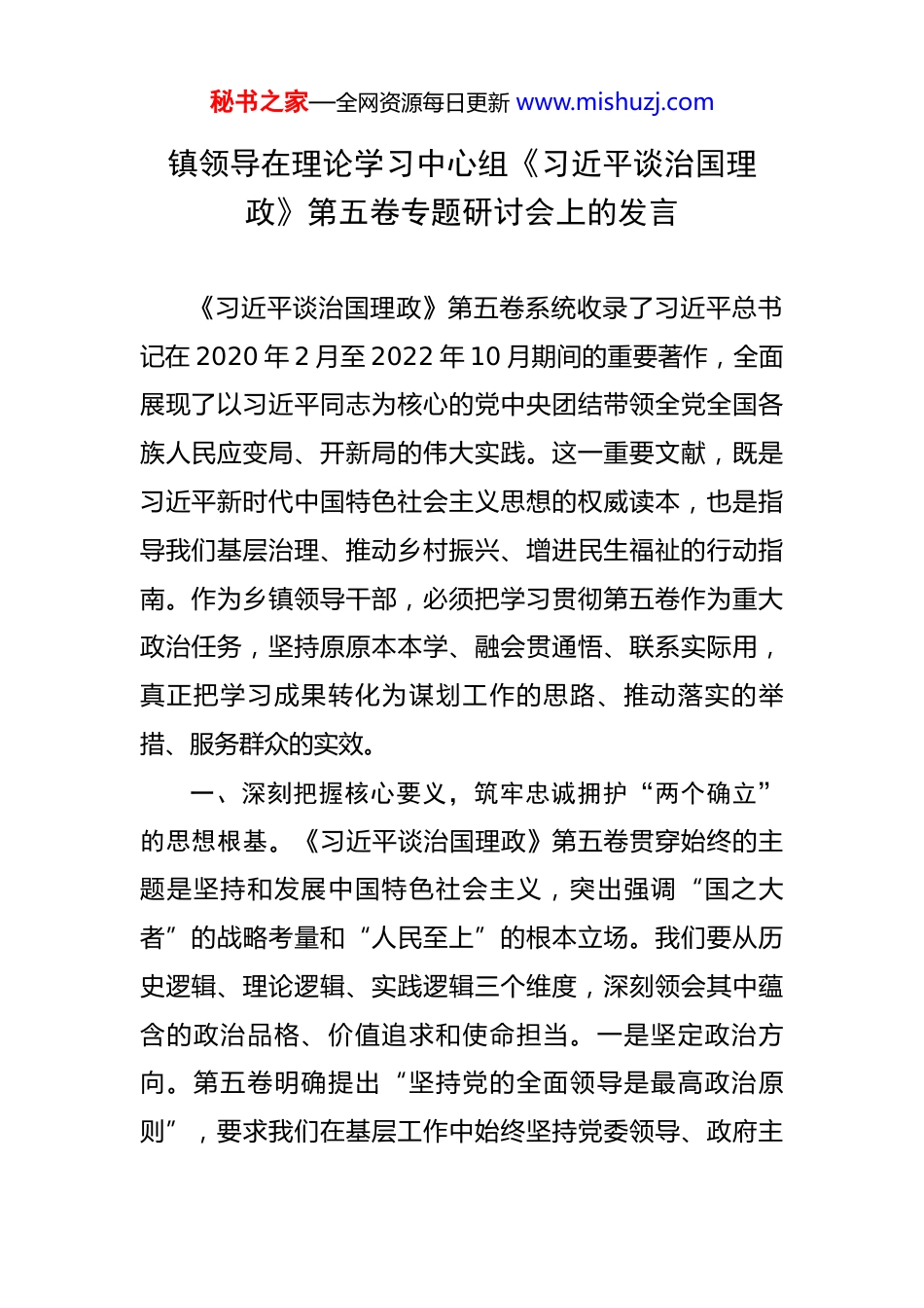秘书之家—全网资源每日更新 www.mishuzj.com镇领导在理论学习中心组《习近平谈治国理政》第五卷专题研讨会上的发言 《习近平谈治国理政》第五卷系统收录了习近平总书记在 2020 年 2 月至 2022 年 10 月期间的重要著作,全面展现了以习近平同志为核心的党中央团结带领全党全国各族人民应变局、开新局的伟大实践。这一重要文献,既是习近平新时代中国特色社会主义思想的权威读本,也是指导我们基层治理、推动乡村振兴、增进民生福祉的行动指南。作为乡镇领导干部,必须把学习贯彻第五卷作为重大政治任务,坚持原原本本学、融会贯通悟、联系实际用,真正把学习成果转化为谋划工作的思路、推动落实的举措、服务群众的实效。一、深刻把握核心要义,筑牢忠诚拥护“两个确立”的思想根基。《习近平谈治国理政》第五卷贯穿始终的主题是坚持和发展中国特色社会主义,突出强调“国之大者”的战略考量和“人民至上”的根本立场。我们要从历史逻辑、理论逻辑、实践逻辑三个维度,深刻领会其中蕴含的政治品格、价值追求和使命担当。一是坚定政治方向。第五卷明确提出“坚持党的全面领导是最高政治原则”,要求我们在基层工作中始终坚持党委领导、政府主秘书之家—全网资源每日更新 www.mishuzj.com责、各方协同的工作机制,确保党中央决策部署在基层落地生根。全镇上下必须进一步增强“四个意识”、坚定“四个自信”、做到“两个维护”,始终在思想上政治上行动上同党中央保持高度一致。二是强化宗旨意识。书中反复强调“江山就是人民,人民就是江山”,这不仅是庄严承诺,更是行动号令。我们必须时刻牢记“为谁执政、为谁谋利”的根本问题,把群众满意不满意、高兴不高兴、答应不答应作为衡量一切工作的出发点和落脚点。今年以来,我镇累计开展“我为群众办实事”实践活动 86 场次,解决困难诉求 437 件,办结率达 96.3%,正是对这一理念的生动践行。三是提升政治能力。面对复杂多变的发展环境和群众日益增长的多元需求,必须不断提高政治判断力、政治领悟力、政治执行力,善于从纷繁复杂的表象中把握本质,在错综交叉的利益关系中找准方向,确保各项工作始终沿着正确政治方向推进。二、精准对标重点任务,把准推动高质量发展的实践路径。第五卷聚焦新时代党和国家事业发展的重大理论和实践问题,为我们做好基层工作提供了科学方法论。我们要立足镇域实际,紧扣“三农”工作重心,以系统思维谋划发展、破解难题。一是以产业振兴夯实发展基础。书中指出,“全面推进乡村振兴,关键是产业要振兴”。我镇秘书之家—全网资源每日更新 www.mishuzj.com依托生态资源禀赋,大力发展绿色农业和乡村旅游,建成高标准农田 2100 亩,培育家庭农场 56 家,打造“山野人家”农旅融合品牌,带动农民人均增收达 4800 元。下一步将深化“龙头企业+合作社+农户”利益联结机制,推动农产品向精深加工延伸,实现由“种得好”向“卖得好”转变。二是以人才集聚激活内生动力。第五卷强调“聚天下英才而用之”。当前农村空心化、老龄化问题突出,亟须破解“谁来种地、谁来经营”的困局。我们创新实施“雁归工程”,建立在外能人信息库,吸引返乡创业人员 32人,创办电商工作室、民宿项目等 15 个,有效激活了乡村发展“活水”。同时加强本土人才培养,组织新型职业农民培训 12 期,参训人员超 600 人次,逐步构建起一支留得住、用得上的乡土人才队伍。三是以生态宜居绘就幸福底色。书中提出“绿水青山就是金山银山”的发展理念。我镇持续推进人居环境整治三年行动,拆除违建 180 处,清理垃圾堆点 35 处,新建垃圾分类亭 23 座,完成改厕380 户,村容村貌焕然一新。特别是结合“千万工程”经验,打造示范村 4 个,形成可复制、可推广的整治样板,让群众真切感受到“家门口的变化”。三、着力提升治理效能,打通服务群众“最后一公里”。基层治理是国家治理体系的重要基石,也是检验学秘书之家—全网资源每日更新 www.mishuzj.com习成效的关键标尺。第五卷特别强调“加强和创新社会治理”,要求我们坚持共建共治共享。一是健全组织体系。深化党建引领网格化管理,将全镇划分...