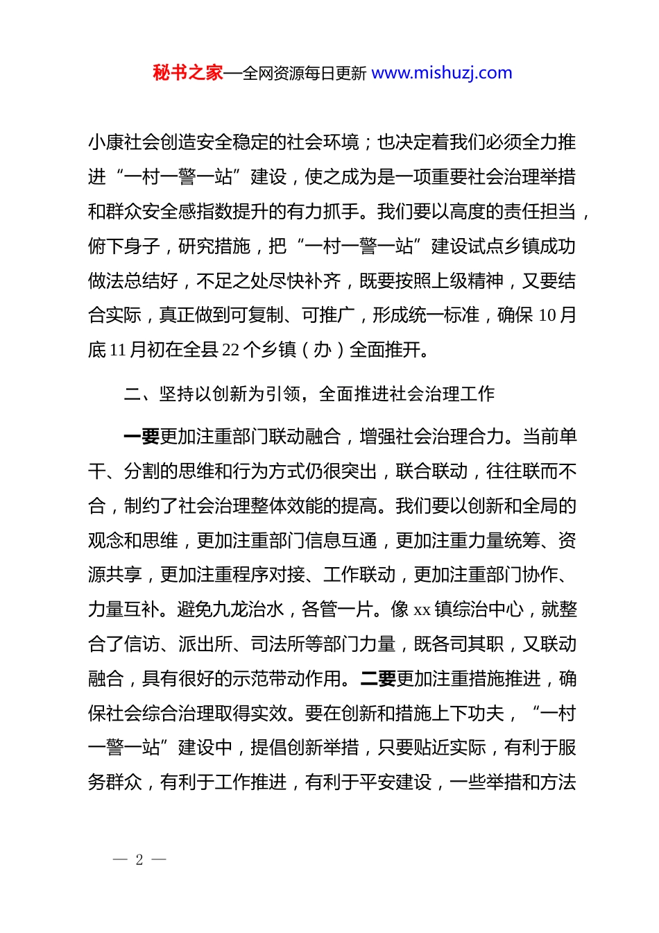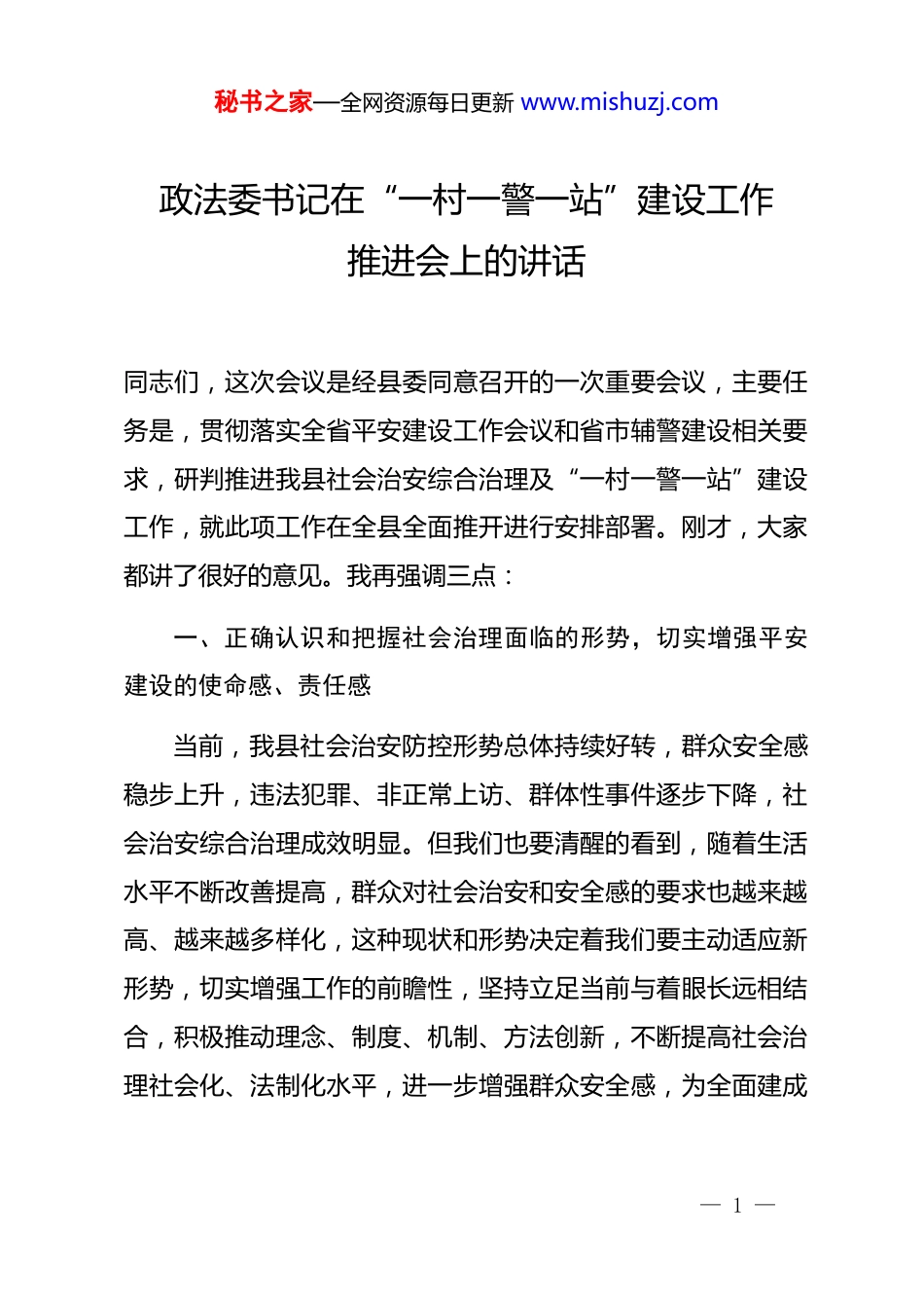 秘书之家—全网资源每日更新 www.mishuzj.com政法委书记在“一村一警一站”建设工作推进会上的讲话同志们,这次会议是经县委同意召开的一次重要会议,主要任务是,贯彻落实全省平安建设工作会议和省市辅警建设相关要求,研判推进我县社会治安综合治理及“一村一警一站”建设工作,就此项工作在全县全面推开进行安排部署。刚才,大家都讲了很好的意见。我再强调三点:一、正确认识和把握社会治理面临的形势,切实增强平安建设的使命感、责任感当前,我县社会治安防控形势总体持续好转,群众安全感稳步上升,违法犯罪、非正常上访、群体性事件逐步下降,社会治安综合治理成效明显。但我们也要清醒的看到,随着生活水平不断改善提高,群众对社会治安和安全感的要求也越来越高、越来越多样化,这种现状和形势决定着我们要主动适应新形势,切实增强工作的前瞻性,坚持立足当前与着眼长远相结合,积极推动理念、制度、机制、方法创新,不断提高社会治理社会化、法制化水平,进一步增强群众安全感,为全面建成— 1 —秘书之家—全网资源每日更新 www.mishuzj.com小康社会创造安全稳定的社会环境;也决定着我们必须全力推进“一村一警一站”建设,使之成为是一项重要社会治理举措和群众安全感指数提升的有力抓手。我们要以高度的责任担当,俯下身子,研究措施,把“一村一警一站”建设试点乡镇成功做法总结好,不足之处尽快补齐,既要按照上级精神,又要结合实际,真正做到可复制、可推广,形成统一标准,确保 10 月底 11 月初在全县 22 个乡镇(办)全面推开。二、坚持以创新为引领,全面推进社会治理工作一要更加注重部门联动融合,增强社会治理合力。当前单干、分割的思维和行为方式仍很突出,联合联动,往往联而不合,制约了社会治理整体效能的提高。我们要以创新和全局的观念和思维,更加注重部门信息互通,更加注重力量统筹、资源共享,更加注重程序对接、工作联动,更加注重部门协作、力量互补。避免九龙治水,各管一片。像 xx 镇综治中心,就整合了信访、派出所、司法所等部门力量,既各司其职,又联动融合,具有很好的示范带动作用。二要更加注重措施推进,确保社会综合治理取得实效。要在创新和措施上下功夫,“一村一警一站”建设中,提倡创新举措,只要贴近实际,有利于服务群众,有利于工作推进,有利于平安建设,一些举措和方法— 2 —秘书之家—全网资源每日更新 www.mishuzj.com可以不拘一格,可以尝试创新。比如创新资源整合,相关联部门合署办公,既能节约资源,又不让群众多跑“冤枉路”。再如警务工作站办公设施配备,可以采用实施以奖代补,以激励先进,鞭策落后。三要更加注重方式方法,确保民生工程更好服务于民。“一村一警一站”建设实际是一项民生工程建设,要注重方式方法,要与各乡镇和每个行政村实际相结合,既有规范和标准,又不能脱离实际刻意拔高,比如对辅警的各项工作要求,就要结合实际,精准定位,积极打造调解员、巡逻员、信息员、联络员和宣传员“五大员”职能,同时,要注重培训教育,使其不失职、不越位,而对于台账管理则要结合辅警自身实际,只要基本要素具备就行。三、强化各项保障,抓紧抓好“一村一警一站”建设的各项工作一是强化组织保障。县委 xx 书记、县政府 xx 县长对此项工作高度重视,几次召开专门会议安排部署此项工作;我也在各种会议上多次强调这项工作;政法委、公安局等相关部门是这项工作的具体协调指导单位,各乡镇*委政府是实施这项工作的主体。我们的工作还得到了人大、政协及群工部的大力支持,所以我们没有理由不把这项工作抓好。二是强化制度保障。目— 3 —秘书之家—全网资源每日更新 www.mishuzj.com前,试点乡镇“一村一警一站”建设已进入扫尾验收阶段,各项规章制度一定要建立健全并且规范起来,为今后工作开展提供有效的制度保障。三是强化经费保障。我们要为每位辅警建立专门档案,保障工作经费,这里我再强调一点,辅警要在村两委班子成员中产生,这是县委县政府的意见,也得到了上级领导的肯定,是切合实际的,各乡镇都要不折不扣的执行;对警务工作站配备必要的装备和相关办公设施;对...