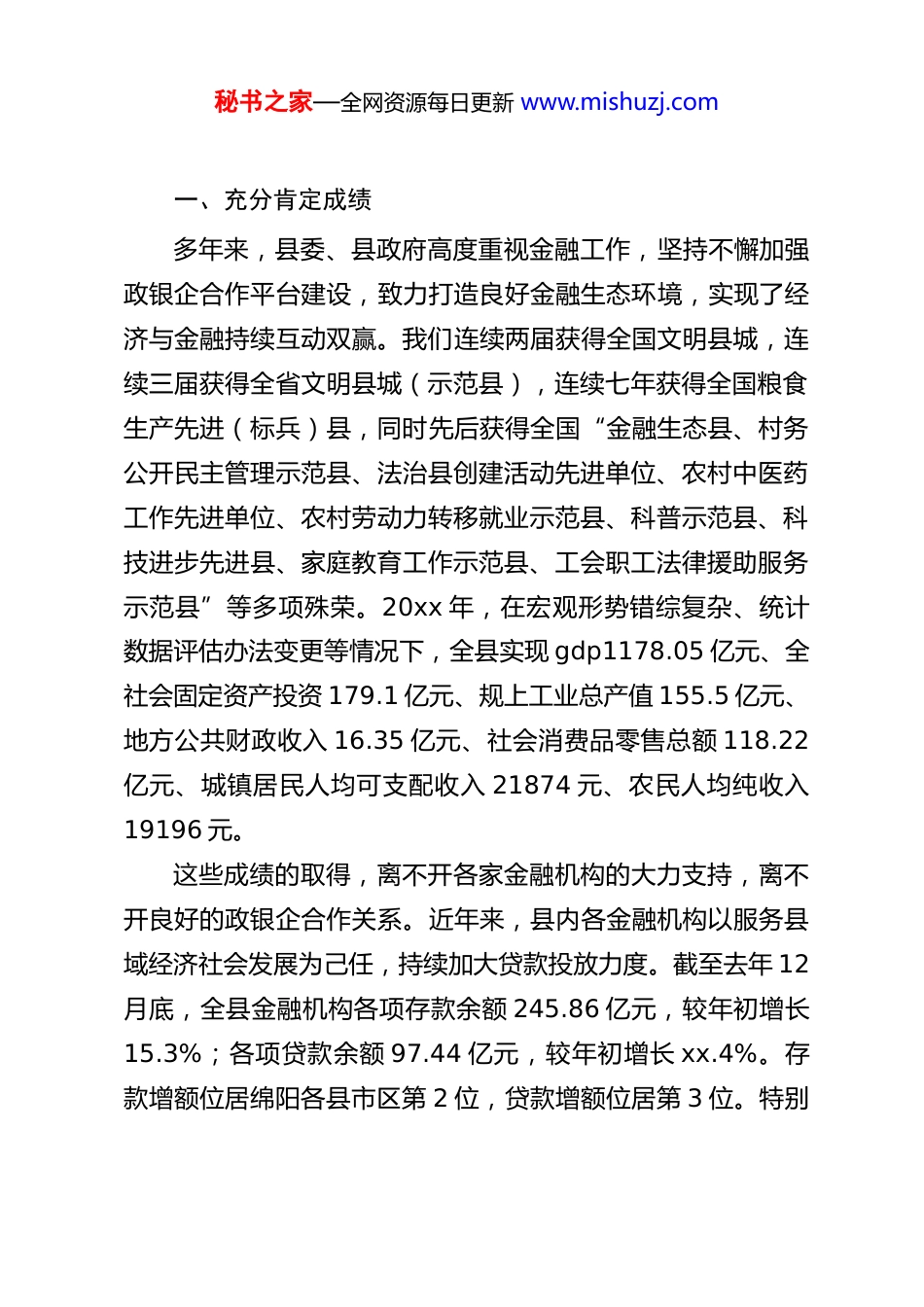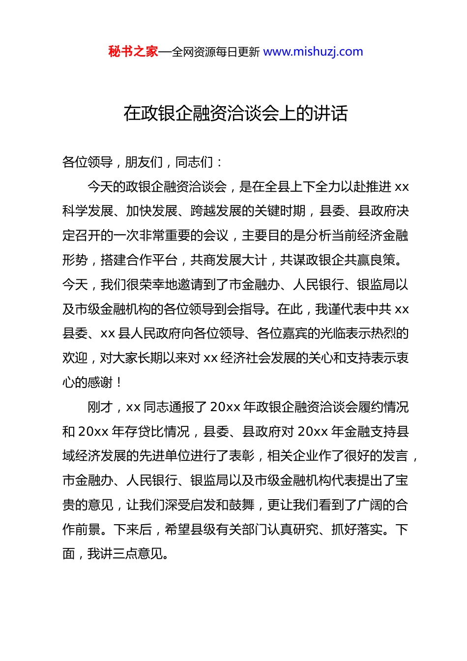 秘书之家—全网资源每日更新 www.mishuzj.com在政银企融资洽谈会上的讲话各位领导,朋友们,同志们:今天的政银企融资洽谈会,是在全县上下全力以赴推进 xx科学发展、加快发展、跨越发展的关键时期,县委、县政府决定召开的一次非常重要的会议,主要目的是分析当前经济金融形势,搭建合作平台,共商发展大计,共谋政银企共赢良策。今天,我们很荣幸地邀请到了市金融办、人民银行、银监局以及市级金融机构的各位领导到会指导。在此,我谨代表中共 xx县委、xx 县人民政府向各位领导、各位嘉宾的光临表示热烈的欢迎,对大家长期以来对 xx 经济社会发展的关心和支持表示衷心的感谢!刚才,xx 同志通报了 20xx 年政银企融资洽谈会履约情况和 20xx 年存贷比情况,县委、县政府对 20xx 年金融支持县域经济发展的先进单位进行了表彰,相关企业作了很好的发言,市金融办、人民银行、银监局以及市级金融机构代表提出了宝贵的意见,让我们深受启发和鼓舞,更让我们看到了广阔的合作前景。下来后,希望县级有关部门认真研究、抓好落实。下面,我讲三点意见。秘书之家—全网资源每日更新 www.mishuzj.com一、充分肯定成绩多年来,县委、县政府高度重视金融工作,坚持不懈加强政银企合作平台建设,致力打造良好金融生态环境,实现了经济与金融持续互动双赢。我们连续两届获得全国文明县城,连续三届获得全省文明县城(示范县),连续七年获得全国粮食生产先进(标兵)县,同时先后获得全国“金融生态县、村务公开民主管理示范县、法治县创建活动先进单位、农村中医药工作先进单位、农村劳动力转移就业示范县、科普示范县、科技进步先进县、家庭教育工作示范县、工会职工法律援助服务示范县”等多项殊荣。20xx 年,在宏观形势错综复杂、统计数据评估办法变更等情况下,全县实现 gdp1178.05 亿元、全社会固定资产投资 179.1 亿元、规上工业总产值 155.5 亿元、地方公共财政收入 16.35 亿元、社会消费品零售总额 118.22亿元、城镇居民人均可支配收入 21874 元、农民人均纯收入19196 元。这些成绩的取得,离不开各家金融机构的大力支持,离不开良好的政银企合作关系。近年来,县内各金融机构以服务县域经济社会发展为己任,持续加大贷款投放力度。截至去年 12月底,全县金融机构各项存款余额 245.86 亿元,较年初增长15.3%;各项贷款余额 97.44 亿元,较年初增长 xx.4%。存款增额位居绵阳各县市区第 2 位,贷款增额位居第 3 位。特别秘书之家—全网资源每日更新 www.mishuzj.com是,xx 农村信用联社积极服务基层发展,去年末存款余额和贷款余额分别达 82.8 亿元和 53.4 亿元,存贷比 64.51%;农发行 xx 分行利用政策优势,去年末贷款余额 5.49 亿元,存贷比达 1263.65%,为我县农业和农村经济发展提供了坚强保障;今年 1—8 月,全县金融机构各项存款、贷款余额分别增长了17.23 亿元、2.3 亿元,取得了可喜的成绩。今天会上,8 家银行业金融机构又与 76 家企业,就 87 个项目签订了协议金额31.03 亿元的贷款合作,将我县政银企合作再次推上了一个新的台阶。在此,我谨代表县委、县政府对本次成功合作、对各金融机构取得的成绩表示热烈的祝贺! 二、充分把握形势 金融促进经济,经济决定金融。经济与金融互为一体,兴衰与共。我们必须在全面分析形势中抢抓机遇、顺势而为,推动经济与金融持续良性发展。从经济形势来看,虽然宏观经济仍存下行压力,但经济社会发展基本面长期趋好,中央、省、市出台了一系列重视“三农”、加速推进“两化”互动的政策措施,特别是在支持百万人口大县发展上,我们面临系列利好政策机遇。经过近几年发展,我县无论是交通条件,还是园区平台、城镇载体、农业基础设施都有了一个大的改善,发展的基础条件达到了历史最好。只要我们积极主动地抢抓机遇对上争取,我们企业的发展、县秘书之家—全网资源每日更新 www.mishuzj.com域经济的发展就一定会有一个很好的项目资金环境。从金融形势来看,刚才,市上金融部门各位领导对金融政策这方面分析得很透彻、很到位。总体上讲,金融政策对县域经济尤其是实体经济发...