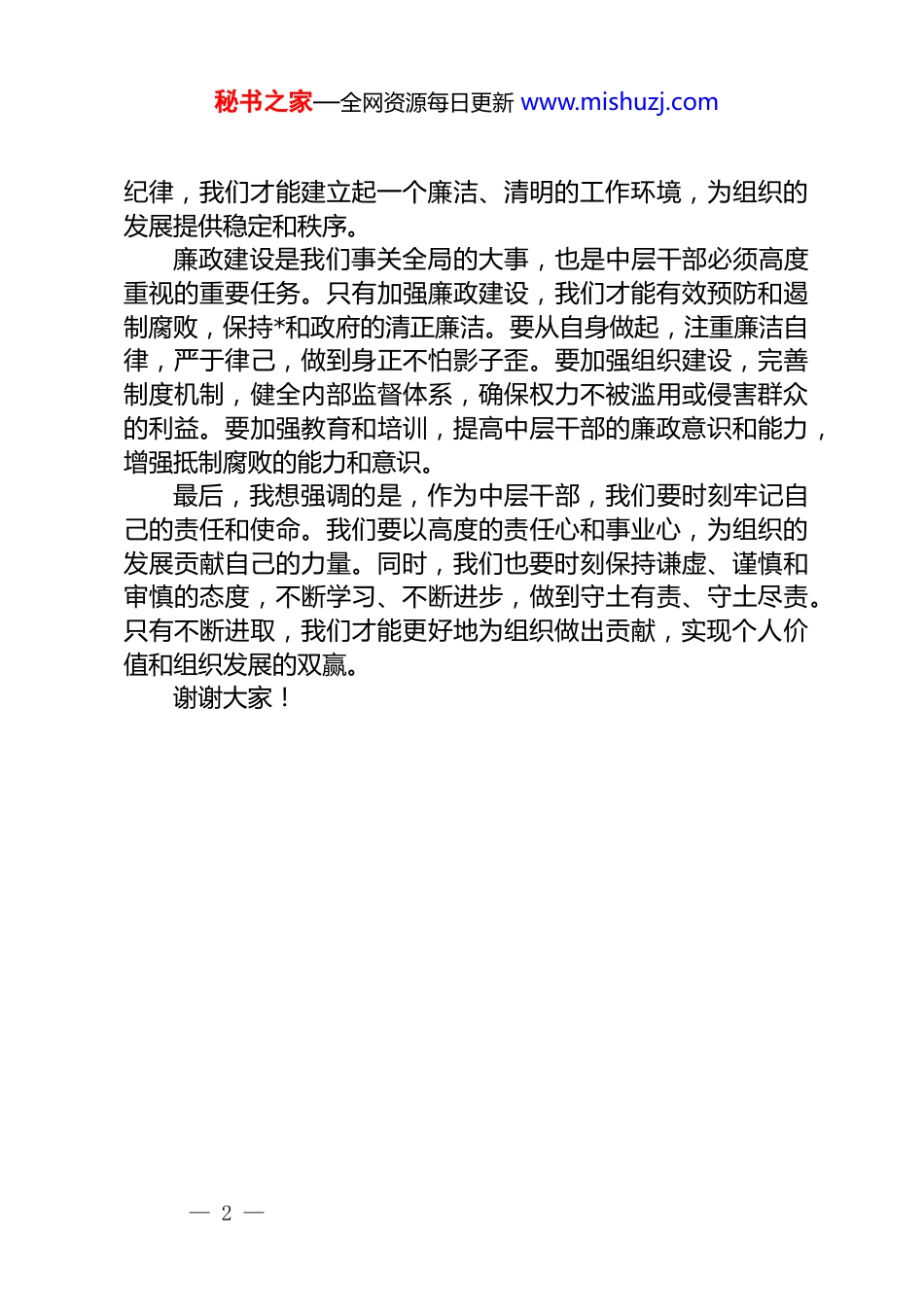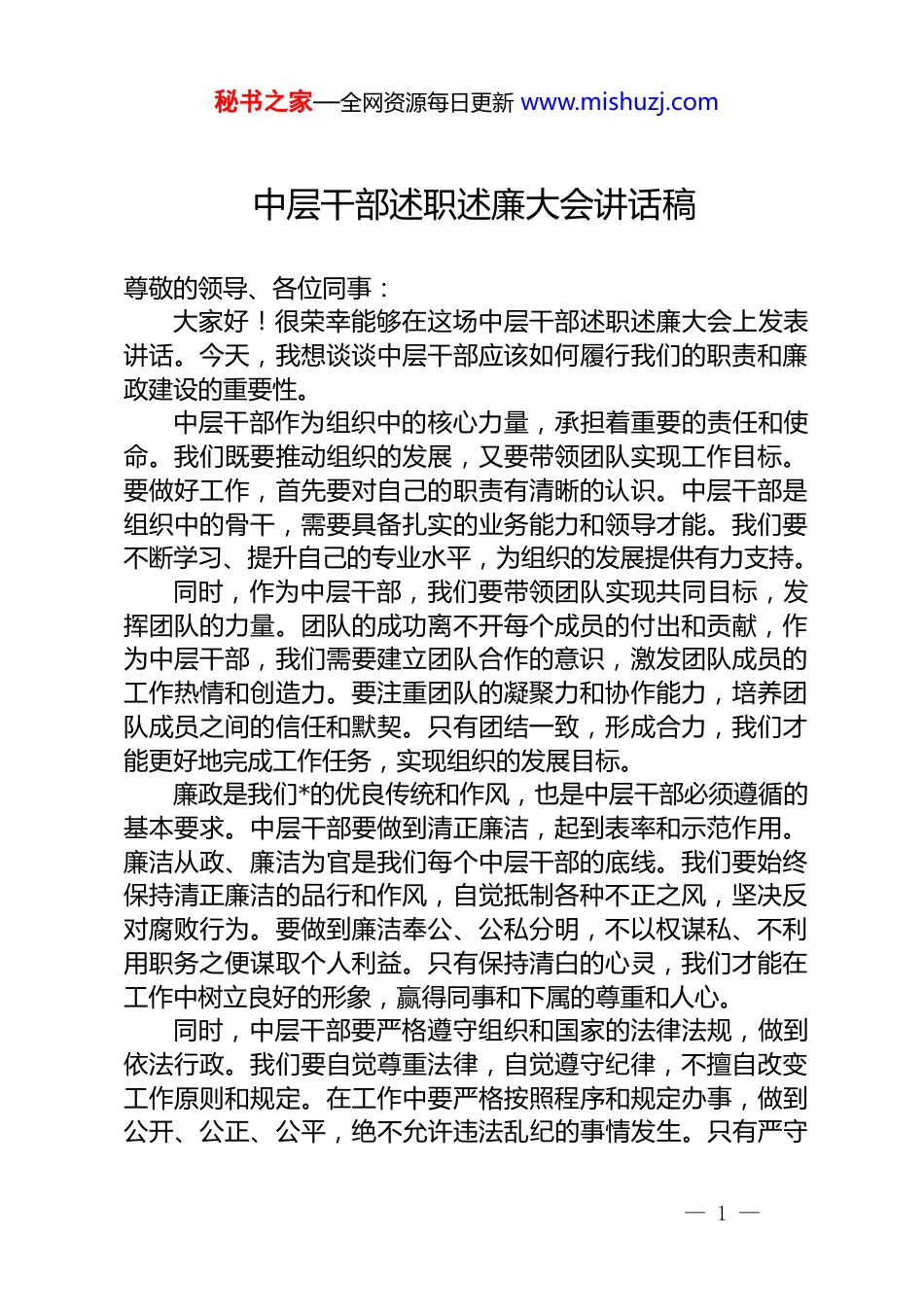 秘书之家—全网资源每日更新 www.mishuzj.com中层干部述职述廉大会讲话稿尊敬的领导、各位同事:大家好!很荣幸能够在这场中层干部述职述廉大会上发表讲话。今天,我想谈谈中层干部应该如何履行我们的职责和廉政建设的重要性。中层干部作为组织中的核心力量,承担着重要的责任和使命。我们既要推动组织的发展,又要带领团队实现工作目标。要做好工作,首先要对自己的职责有清晰的认识。中层干部是组织中的骨干,需要具备扎实的业务能力和领导才能。我们要不断学习、提升自己的专业水平,为组织的发展提供有力支持。同时,作为中层干部,我们要带领团队实现共同目标,发挥团队的力量。团队的成功离不开每个成员的付出和贡献,作为中层干部,我们需要建立团队合作的意识,激发团队成员的工作热情和创造力。要注重团队的凝聚力和协作能力,培养团队成员之间的信任和默契。只有团结一致,形成合力,我们才能更好地完成工作任务,实现组织的发展目标。廉政是我们*的优良传统和作风,也是中层干部必须遵循的基本要求。中层干部要做到清正廉洁,起到表率和示范作用。廉洁从政、廉洁为官是我们每个中层干部的底线。我们要始终保持清正廉洁的品行和作风,自觉抵制各种不正之风,坚决反对腐败行为。要做到廉洁奉公、公私分明,不以权谋私、不利用职务之便谋取个人利益。只有保持清白的心灵,我们才能在工作中树立良好的形象,赢得同事和下属的尊重和人心。同时,中层干部要严格遵守组织和国家的法律法规,做到依法行政。我们要自觉尊重法律,自觉遵守纪律,不擅自改变工作原则和规定。在工作中要严格按照程序和规定办事,做到公开、公正、公平,绝不允许违法乱纪的事情发生。只有严守— 1 —秘书之家—全网资源每日更新 www.mishuzj.com纪律,我们才能建立起一个廉洁、清明的工作环境,为组织的发展提供稳定和秩序。廉政建设是我们事关全局的大事,也是中层干部必须高度重视的重要任务。只有加强廉政建设,我们才能有效预防和遏制腐败,保持*和政府的清正廉洁。要从自身做起,注重廉洁自律,严于律己,做到身正不怕影子歪。要加强组织建设,完善制度机制,健全内部监督体系,确保权力不被滥用或侵害群众的利益。要加强教育和培训,提高中层干部的廉政意识和能力,增强抵制腐败的能力和意识。最后,我想强调的是,作为中层干部,我们要时刻牢记自己的责任和使命。我们要以高度的责任心和事业心,为组织的发展贡献自己的力量。同时,我们也要时刻保持谦虚、谨慎和审慎的态度,不断学习、不断进步,做到守土有责、守土尽责。只有不断进取,我们才能更好地为组织做出贡献,实现个人价值和组织发展的双赢。谢谢大家!— 2 —