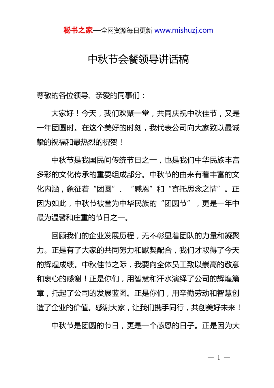 秘书之家—全网资源每日更新 www.mishuzj.com中秋节会餐领导讲话稿尊敬的各位领导、亲爱的同事们:大家好!今天,我们欢聚一堂,共同庆祝中秋佳节,又是一年团圆时。在这个美好的时刻,我代表公司向大家致以最诚挚的祝福和最热烈的祝贺!中秋节是我国民间传统节日之一,也是我们中华民族丰富多彩的文化传承的重要组成部分。中秋节的由来有着丰富的文化内涵,象征着“团圆”、“感恩”和“寄托思念之情”。正因为如此,中秋节被誉为中华民族的“团圆节”,更是一年中最为温馨和庄重的节日之一。回顾我们的企业发展历程,无不彰显着团队的力量和凝聚力。正是有了大家的共同努力和默契配合,我们才取得了今天的辉煌成绩。中秋佳节之际,我要向全体员工致以崇高的敬意和衷心的感谢!正是你们,用智慧和汗水演绎了公司的辉煌篇章,托起了公司的发展蓝图。正是你们,用辛勤劳动和智慧创造了企业的价值。感谢大家,让我们携手同行,共创美好未来!中秋节是团圆的节日,更是一个感恩的日子。正是因为大— 1 —秘书之家—全网资源每日更新 www.mishuzj.com家的默契配合和共同奋斗,我们企业才能够取得如此骄人的业绩。让我们携起手来,共度中秋,共享美好时光。在这个节日里,不论是远离故乡的置业项目部的同事,还是奔波在外的市场销售团队的同仁,抑或是加班加点工作的后勤人员,我们都要用心感恩,用努力奋进,用真挚的情感,涌动起团结协作的力量,迸发出更加强大的发展动力。在新的起点上,我们迎来了更加广阔的发展空间。当前,经济发展进入新常态,市场竞争日益激烈,对我们企业来说,机遇与挑战并存。我们必须保持高度警醒,增强危机意识,居安思危,不断加强自身建设,加快转型升级步伐,做到主动适应市场的需求变化,持续提高自身的核心竞争力。团结一心,方能应对挑战。企业是由一个个团队组成的,一个团队的凝聚力是企业走向成功的基石。无论是领导层还是普通员工,我们都应该携手合作,相互支持,同舟共济,共同为实现企业的发展目标而努力。只有紧密团结,实现心与心的契合,才能在困难面前携手共渡,战胜困难,实现更大的梦想。在这个特殊的日子,让我们不仅要感激身边人的付出,更要发扬中秋节的团圆精神,关爱每一个人的情感需求。回归家庭,与亲人团聚,让陪伴成为我们这个节日里最美的底色。同— 2 —秘书之家—全网资源每日更新 www.mishuzj.com时,也要关怀那些因工作无法与家人团聚的同事,用关怀的目光和温暖的问候,传递一份深情厚意,让他们在远离家乡的异乡中,感受到团圆的温暖。最后,我要再次感谢大家为企业发展付出的辛勤努力,感谢你们对公司的鼎力支持和配合。让我们共同为公司的发展贡献自己的力量,创造更辉煌的明天。预祝大家中秋愉快、团团圆圆,阖家幸福、事业腾飞!谢谢大家!— 3 —