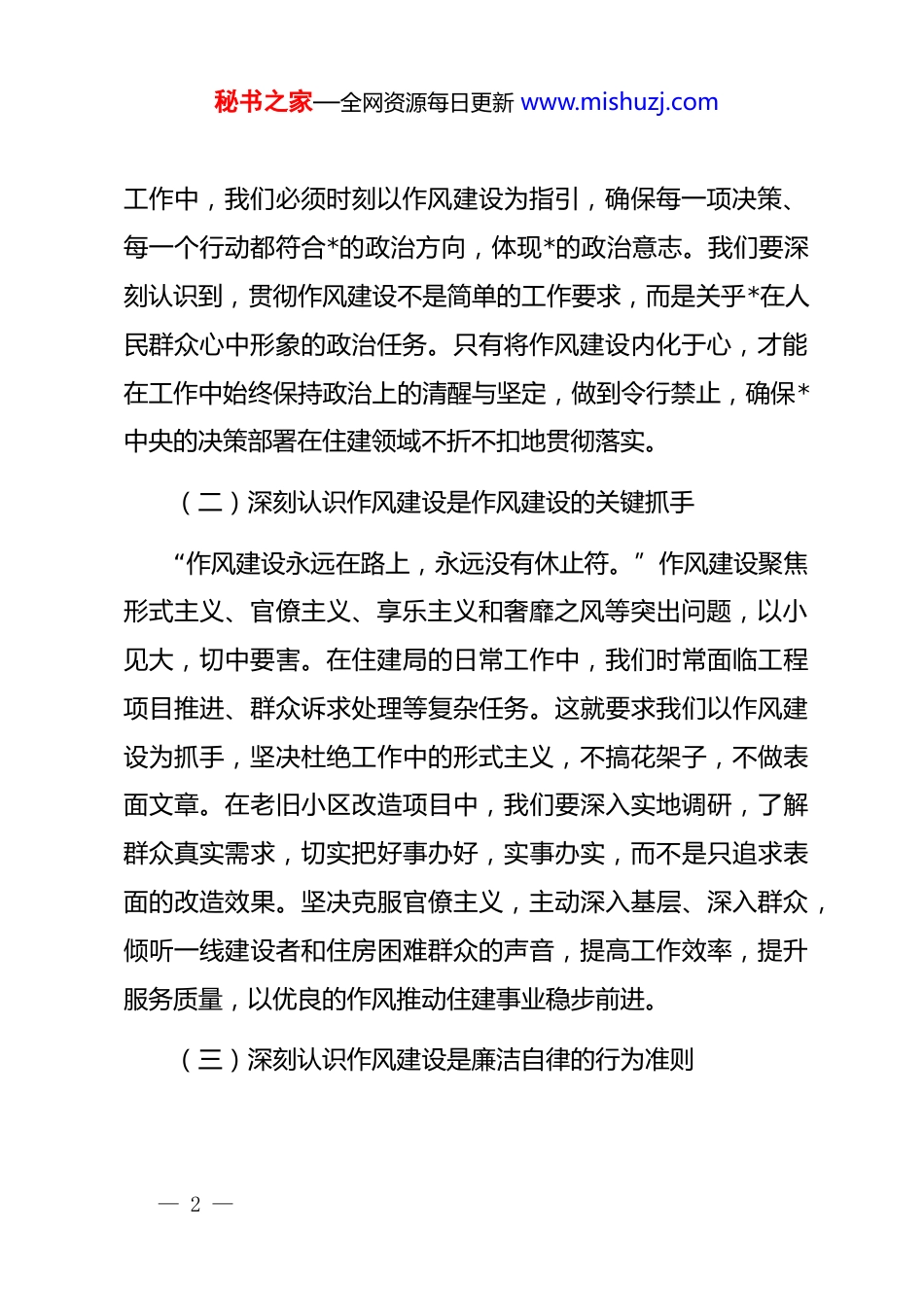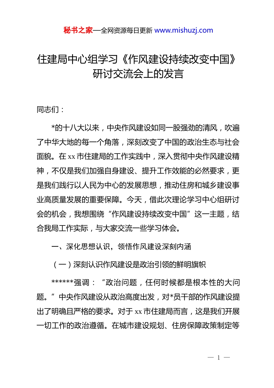 秘书之家—全网资源每日更新 www.mishuzj.com住建局中心组学习《作风建设持续改变中国》研讨交流会上的发言同志们:*的十八大以来,中央作风建设如同一股强劲的清风,吹遍了中华大地的每一个角落,深刻改变了中国的政治生态与社会面貌。在 xx 市住建局的工作实践中,深入贯彻中央作风建设精神,不仅是我们加强自身建设、提升工作效能的必然要求,更是我们践行以人民为中心的发展思想,推动住房和城乡建设事业高质量发展的重要保障。今天,借此次理论学习中心组研讨会的机会,我想围绕“作风建设持续改变中国”这一主题,结合我局工作实际,与大家交流一些学习体会。一、深化思想认识,领悟作风建设深刻内涵(一)深刻认识作风建设是政治引领的鲜明旗帜******强调:“政治问题,任何时候都是根本性的大问题。”中央作风建设从政治高度出发,对*员干部的作风建设提出了明确且严格的要求。对于 xx 市住建局而言,这是我们开展一切工作的政治遵循。在城市建设规划、住房保障政策制定等— 1 —秘书之家—全网资源每日更新 www.mishuzj.com工作中,我们必须时刻以作风建设为指引,确保每一项决策、每一个行动都符合*的政治方向,体现*的政治意志。我们要深刻认识到,贯彻作风建设不是简单的工作要求,而是关乎*在人民群众心中形象的政治任务。只有将作风建设内化于心,才能在工作中始终保持政治上的清醒与坚定,做到令行禁止,确保*中央的决策部署在住建领域不折不扣地贯彻落实。(二)深刻认识作风建设是作风建设的关键抓手“作风建设永远在路上,永远没有休止符。”作风建设聚焦形式主义、官僚主义、享乐主义和奢靡之风等突出问题,以小见大,切中要害。在住建局的日常工作中,我们时常面临工程项目推进、群众诉求处理等复杂任务。这就要求我们以作风建设为抓手,坚决杜绝工作中的形式主义,不搞花架子,不做表面文章。在老旧小区改造项目中,我们要深入实地调研,了解群众真实需求,切实把好事办好,实事办实,而不是只追求表面的改造效果。坚决克服官僚主义,主动深入基层、深入群众,倾听一线建设者和住房困难群众的声音,提高工作效率,提升服务质量,以优良的作风推动住建事业稳步前进。(三)深刻认识作风建设是廉洁自律的行为准则— 2 —秘书之家—全网资源每日更新 www.mishuzj.com“公生明,廉生威。”廉洁自律是*员干部的基本政治操守,中央作风建设为我们划定了廉洁从政的底线。住建局作为城市建设的重要职能部门,手中掌握着一定的权力,在项目招投标、行政审批等关键环节,面临着诸多廉洁风险。我们必须以作风建设为行为准则,时刻保持警醒,自觉抵制各种诱惑。严格执行廉洁纪律,规范权力运行,做到公正用权、依法用权、廉洁用权。通过加强廉政教育,完善监督机制,让每一位干部职工都清楚认识到廉洁自律的重要性,确保我们的干部队伍清正廉洁,为住建事业发展营造风清气正的良好环境。二、强化贯彻落实,推动住建工作提质增效(一)以作风建设为准则,优化工作流程,提升服务效能一是简化审批流程。深入贯彻*中央关于深化“放管服”改革的要求,以作风建设为指引,对住建局涉及的各类行政审批事项进行全面梳理。减少不必要的审批环节,压缩审批时限,提高审批效率。通过建立线上审批平台,实现部分事项的“一网通办”,让数据多跑路,群众少跑腿,切实提升企业和群众的办事体验。二是加强窗口服务建设。窗口部门是住建局面向社会的重要形象展示。严格要求窗口工作人员遵守作风建设,杜绝服务态度冷漠、推诿扯皮等现象。加强业务培训,提高工作人— 3 —秘书之家—全网资源每日更新 www.mishuzj.com员的专业素养和服务水平,确保为群众提供热情、高效、优质的服务,打造住建局良好的服务品牌。三是建立工作反馈机制。在推进各项住建工作过程中,及时收集企业、群众的反馈意见。对于工作中存在的问题,迅速整改落实,以实际行动践行作风建设,不断优化工作流程,提升服务效能,让住建工作更好地服务于全市经济社会发展大局。(二)以作风建设为指引,改进调查研究,科学谋划工作一是坚持问题导向。******指出:“调查研究是谋事之基、成事之道。”在开展住...
