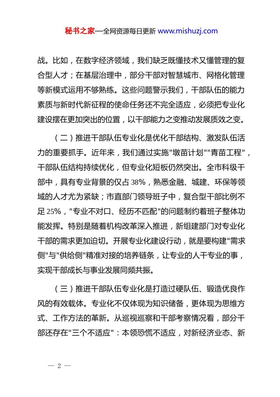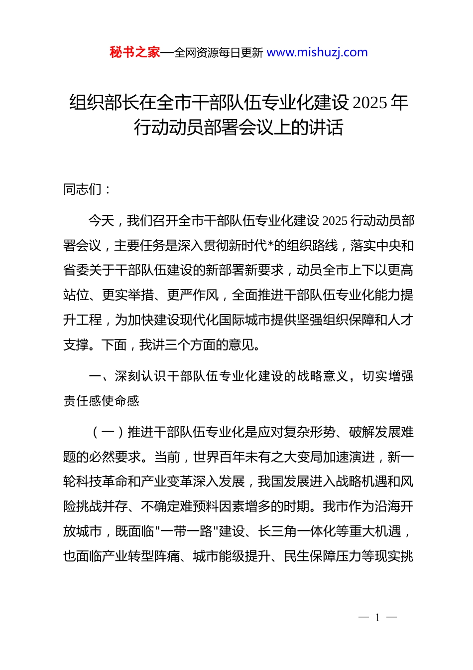 秘书之家—全网资源每日更新 www.mishuzj.com组织部长在全市干部队伍专业化建设 2025 年行动动员部署会议上的讲话同志们:今天,我们召开全市干部队伍专业化建设 2025 行动动员部署会议,主要任务是深入贯彻新时代*的组织路线,落实中央和省委关于干部队伍建设的新部署新要求,动员全市上下以更高站位、更实举措、更严作风,全面推进干部队伍专业化能力提升工程,为加快建设现代化国际城市提供坚强组织保障和人才支撑。下面,我讲三个方面的意见。一、深刻认识干部队伍专业化建设的战略意义,切实增强责任感使命感(一)推进干部队伍专业化是应对复杂形势、破解发展难题的必然要求。当前,世界百年未有之大变局加速演进,新一轮科技革命和产业变革深入发展,我国发展进入战略机遇和风险挑战并存、不确定难预料因素增多的时期。我市作为沿海开放城市,既面临"一带一路"建设、长三角一体化等重大机遇,也面临产业转型阵痛、城市能级提升、民生保障压力等现实挑— 1 —秘书之家—全网资源每日更新 www.mishuzj.com战。比如,在数字经济领域,我们缺乏既懂技术又懂管理的复合型人才;在基层治理中,部分干部对智慧城市、网格化管理等新模式运用不够熟练。这些问题警示我们,干部队伍的能力素质与新时代新征程的使命任务还不完全适应,必须把专业化建设摆在更加突出的位置,以干部能力之变推动发展质效之变。(二)推进干部队伍专业化是优化干部结构、激发队伍活力的重要抓手。近年来,我们通过实施"墩苗计划""青苗工程",干部队伍结构持续优化,但专业化短板仍然突出。全市科级干部中,具有专业背景的仅占 38%,熟悉金融、城建、环保等领域的人才尤为紧缺;市直部门领导班子中,复合型干部比例不足 25%,"专业不对口、经历不匹配"的问题制约着班子整体功能发挥。特别是随着机构改革深入推进,新组建部门对专业化干部的需求更加迫切。开展专业化建设行动,就是要构建"需求侧"与"供给侧"精准对接的培养链条,让专业的人干专业的事,实现干部成长与事业发展同频共振。(三)推进干部队伍专业化是打造过硬队伍、锻造优良作风的有效载体。专业化不仅体现为知识储备,更体现为思维方式、工作方法的革新。从巡视巡察和干部考察情况看,部分干部还存在"三个不适应":本领恐慌不适应,对新经济业态、新— 2 —秘书之家—全网资源每日更新 www.mishuzj.com产业政策研究不深;思维定势不适应,习惯用老办法解决新问题;作风漂浮不适应,调查研究浮于表面。开展专业化建设,就是要引导干部树牢专业精神、提升专业素养、锤炼专业作风,在攻坚克难中展现新担当新作为。二、准确把握干部队伍专业化建设的重点任务,着力构建全链条培养体系(一)实施"铸魂提能"工程,筑牢专业化思想根基。坚持把政治标准放在首位,建立"政治体检+专业评估"双轨机制。开展"新思想引领新征程"专题培训,每年举办数字经济、科技创新等专题研修班 20 期以上,确保干部政治能力与专业能力同步提升。实施"红色导师"计划,遴选 50 名政治过硬、经验丰富的领导干部担任导师,与年轻干部结对培养。建立干部专业素养档案,动态记录培训经历、专业资质、实践成果,作为选拔任用的重要依据。(二)实施"精准赋能"工程,构建专业化培养矩阵。聚焦产业发展需求,绘制"产业链—人才链"对接图谱,在集成电路、生物医药等重点产业领域设立 10 个干部实践基地。深化"政企互派"机制,每年选派 30 名优秀干部到头部企业、金融机构挂职锻炼。实施"专业菁英"计划,联合高校开设公共管理硕士— 3 —秘书之家—全网资源每日更新 www.mishuzj.com(mpa)定制班,5 年内培养 100 名紧缺专业硕士。建立"干部夜校"制度,每周四晚开设"产业大讲堂""治理微课堂",推动干部知识更新常态化。(三)实施"实战炼能"工程,搭建专业化成长平台。推行"揭榜挂帅"机制,围绕自贸区建设、城市更新等重大任务发布 30 个攻坚项目,让干部在实战中增长才干。建立"三跨"培养机制,每年选派 50 名干部开展跨部门、跨领域、跨层级交流,重点加强经济部门与*群部门干部双向交流。实施"一线淬火"行动,新提拔干部必须具有 2 年以上基层...