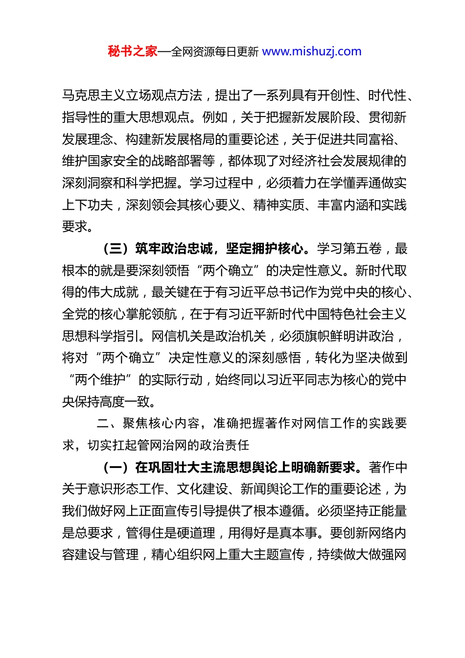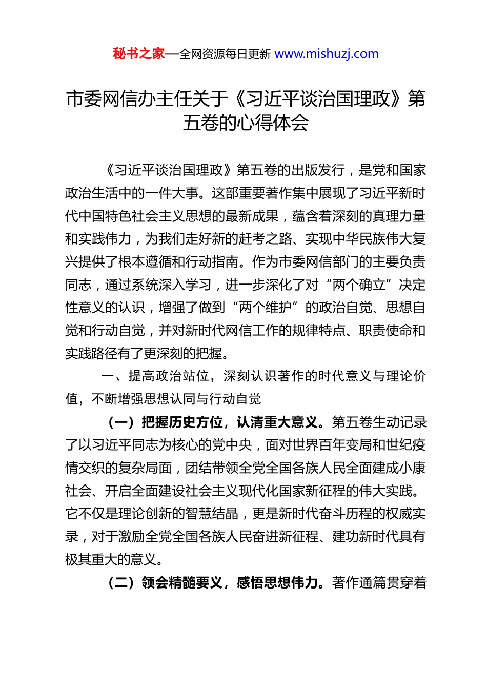 秘书之家—全网资源每日更新 www.mishuzj.com市委网信办主任关于《习近平谈治国理政》第五卷的心得体会《习近平谈治国理政》第五卷的出版发行,是党和国家政治生活中的一件大事。这部重要著作集中展现了习近平新时代中国特色社会主义思想的最新成果,蕴含着深刻的真理力量和实践伟力,为我们走好新的赶考之路、实现中华民族伟大复兴提供了根本遵循和行动指南。作为市委网信部门的主要负责同志,通过系统深入学习,进一步深化了对“两个确立”决定性意义的认识,增强了做到“两个维护”的政治自觉、思想自觉和行动自觉,并对新时代网信工作的规律特点、职责使命和实践路径有了更深刻的把握。一、提高政治站位,深刻认识著作的时代意义与理论价值,不断增强思想认同与行动自觉(一)把握历史方位,认清重大意义。第五卷生动记录了以习近平同志为核心的党中央,面对世界百年变局和世纪疫情交织的复杂局面,团结带领全党全国各族人民全面建成小康社会、开启全面建设社会主义现代化国家新征程的伟大实践。它不仅是理论创新的智慧结晶,更是新时代奋斗历程的权威实录,对于激励全党全国各族人民奋进新征程、建功新时代具有极其重大的意义。(二)领会精髓要义,感悟思想伟力。著作通篇贯穿着秘书之家—全网资源每日更新 www.mishuzj.com马克思主义立场观点方法,提出了一系列具有开创性、时代性、指导性的重大思想观点。例如,关于把握新发展阶段、贯彻新发展理念、构建新发展格局的重要论述,关于促进共同富裕、维护国家安全的战略部署等,都体现了对经济社会发展规律的深刻洞察和科学把握。学习过程中,必须着力在学懂弄通做实上下功夫,深刻领会其核心要义、精神实质、丰富内涵和实践要求。(三)筑牢政治忠诚,坚定拥护核心。学习第五卷,最根本的就是要深刻领悟“两个确立”的决定性意义。新时代取得的伟大成就,最关键在于有习近平总书记作为党中央的核心、全党的核心掌舵领航,在于有习近平新时代中国特色社会主义思想科学指引。网信机关是政治机关,必须旗帜鲜明讲政治,将对“两个确立”决定性意义的深刻感悟,转化为坚决做到“两个维护”的实际行动,始终同以习近平同志为核心的党中央保持高度一致。二、聚焦核心内容,准确把握著作对网信工作的实践要求,切实扛起管网治网的政治责任(一)在巩固壮大主流思想舆论上明确新要求。著作中关于意识形态工作、文化建设、新闻舆论工作的重要论述,为我们做好网上正面宣传引导提供了根本遵循。必须坚持正能量是总要求,管得住是硬道理,用得好是真本事。要创新网络内容建设与管理,精心组织网上重大主题宣传,持续做大做强网秘书之家—全网资源每日更新 www.mishuzj.com上正面声音,构建网上网下同心圆,使互联网这个最大变量变成事业发展的最大增量。(二)在维护国家网络与信息安全上赋予新使命。第五卷深刻阐述了总体国家安全观的丰富内涵,突出强调了网络安全在国家安全体系中的重要地位。必须牢固树立正确的网络安全观,坚持依法治网,持续完善网络综合治理体系。要严格落实网络安全工作责任制,加强关键信息基础设施安全防护,提升数据安全保障能力,坚决防范化解网络空间风险挑战,筑牢国家网络安全屏障。(三)在驱动引领高质量发展上指出新路径。著作中关于发展数字经济、建设数字中国的战略谋划,为发挥信息化驱动引领作用指明了方向。必须敏锐抓住信息化发展的历史机遇,充分发挥信息化对经济社会发展的引领作用。要大力推动数字技术与实体经济深度融合,加快发展数字经济,积极推进智慧城市和数字乡村建设,以信息化推进治理体系和治理能力现代化,为我市高质量发展赋能增效。三、坚持学以致用,全力推动学习成果转化为工作实效,奋力开创我市网信工作新局面(一)强化理论武装,提升能力本领。要把学习第五卷与学习习近平总书记最新重要讲话精神结合起来,与学习习近平总书记关于网络强国的重要思想结合起来,做到系统把握、融会贯通。要通过学习,不断提高从政治上看待和分析网信工秘书之家—全网资源每日更新 www.mishuzj.com作的能力,增强应对复杂局面、驾驭风险挑战的本领,努力成为网信工作的行家里手。(二)...