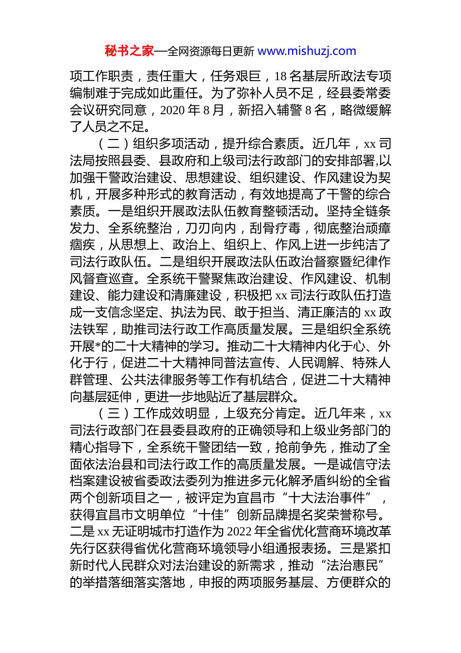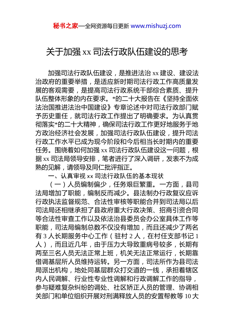 秘书之家—全网资源每日更新 www.mishuzj.com关于加强 xx 司法行政队伍建设的思考加强司法行政队伍建设,是推进法治 xx 建设、建设法治政府的重要举措,是适应新时期司法行政工作高质量发展的客观需要,是提高司法行政系统干部综合素质、提升队伍整体形象的内在要求。*的二十大报告在《坚持全面依法治国推进法治中国建设》专章论述中对司法行政部门赋予历史重任,就司法行政工作提出了明确要求。为认真贯彻落实*的二十大精神,确保司法行政工作更好地服务于地方政治经济社会发展,加强司法行政队伍建设,提升司法行政工作水平已成为现今阶段和今后相当长时期内的重要任务。围绕着如何加强 xx 司法行政队伍建设这一问题,根据 xx 司法局领导安排,笔者进行了深入调研,发表不为成熟的见解,请领导及同仁批评指正。一、认真审视 xx 司法行政队伍的基本现状(一)人员编制偏少,任务艰巨繁重。一方面,县司法局增加了职能,编制反而减少。县法制办行政复议应诉行政执法监督规范、合法性审核等职能合并到司法局以后司法局还相继承担了县政府重大行政决策、招商引资合同等合法性审查工作以及依法治县委员会办公室具体工作等职能,司法局编制总数不仅没有增加,而且还减少了两名有 3 人长期服务中心工作(驻村 2 人,在村任支部书记 1人),而且近几年,由于压力大导致重病号较多,长期有两至三名人员无法正常上班,机关无法正常运行,长期靠借调基层所人员维持运转。另一方面,司法所作为县司法局派出机构,地处同基层群众打交道的一线,承担着辖区内人民调解、行业性专业性调解和行政调解工作的指导,参与疑难复杂纠纷的调处、社区矫正人员的管理、协调相关部门和单位组织开展对刑满释放人员的安置帮教等 10 大秘书之家—全网资源每日更新 www.mishuzj.com项工作职责,责任重大,任务艰巨,18 名基层所政法专项编制难于完成如此重任。为了弥补人员不足,经县委常委会议研究同意,2020 年 8 月,新招入辅警 8 名,略微缓解了人员之不足。(二)组织多项活动,提升综合素质。近几年,xx 司法局按照县委、县政府和上级司法行政部门的安排部署,以加强干警政治建设、思想建设、组织建设、作风建设为契机,开展多种形式的教育活动,有效地提高了干警的综合素质。一是组织开展政法队伍教育整顿活动。坚持全链条发力、全系统整治,刀刃向内,刮骨疗毒,彻底整治顽瘴痼疾,从思想上、政治上、组织上、作风上进一步纯洁了司法行政队伍。二是组织开展政法队伍政治督察暨纪律作风督查巡查。全系统干警聚焦政治建设、作风建设、机制建设、能力建设和清廉建设,积极把 xx 司法行政队伍打造成一支信念坚定、执法为民、敢于担当、清正廉洁的 xx 政法铁军,助推司法行政工作高质量发展。三是组织全系统开展*的二十大精神的学习。推动二十大精神内化于心、外化于行,促进二十大精神同普法宣传、人民调解、特殊人群管理、公共法律服务等工作有机结合,促进二十大精神向基层延伸,更进一步地贴近了基层群众。(三)工作成效明显,上级充分肯定。近几年来,xx司法行政部门在县委县政府的正确领导和上级业务部门的精心指导下,全系统干警团结一致,抢前争先,推动了全面依法治县和司法行政工作的高质量发展。一是诚信守法档案建设被省委政法委列为推进多元化解矛盾纠纷的全省两个创新项目之一,被评定为宜昌市“十大法治事件”,获得宜昌市文明单位“十佳”创新品牌提名奖荣誉称号。二是 xx 无证明城市打造作为 2022 年全省优化营商环境改革先行区获得省优化营商环境领导小组通报表扬。三是紧扣新时代人民群众对法治建设的新需求,推动“法治惠民”的举措落细落实落地,申报的两项服务基层、方便群众的秘书之家—全网资源每日更新 www.mishuzj.com项目获评宜昌市十大 2022 年度“法治惠民”创新品牌项目。2021 年,长乐坪司法所被评为“全国模范司法所”;2019年和 2020 年,县司法局连续两年被评为市级文明单位,并于 2019 年被全国妇联评为“全国维护妇女儿童权益先进集体”;2021 至 2022 年连续两年被评为全县目标管理综合考评优胜单位。2022 年,被县委、...
