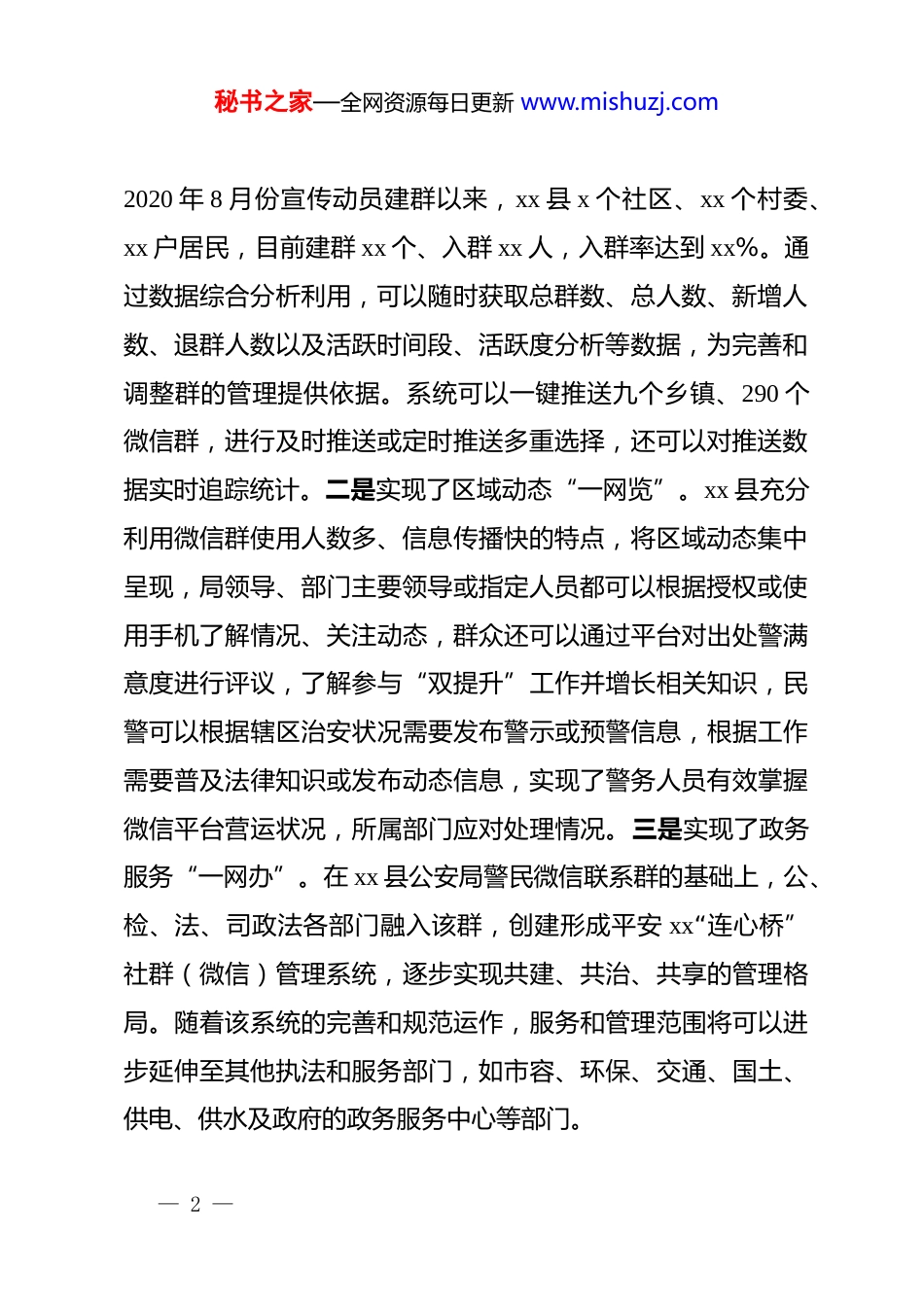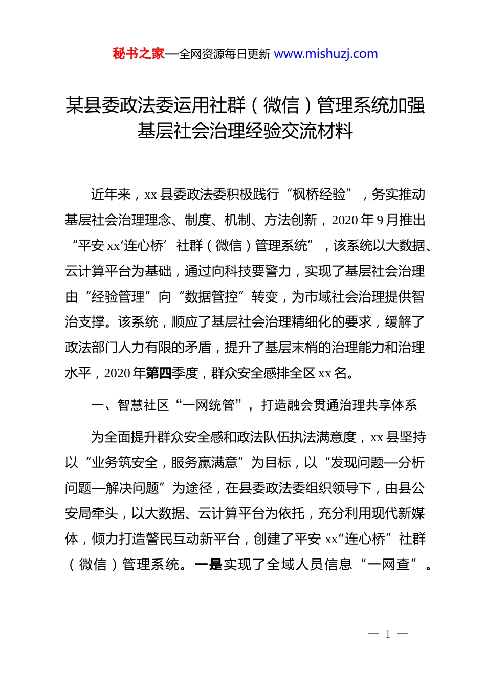 秘书之家—全网资源每日更新 www.mishuzj.com某县委政法委运用社群(微信)管理系统加强基层社会治理经验交流材料近年来,xx 县委政法委积极践行“枫桥经验”,务实推动基层社会治理理念、制度、机制、方法创新,2020 年 9 月推出“平安 xx‘连心桥’社群(微信)管理系统”,该系统以大数据、云计算平台为基础,通过向科技要警力,实现了基层社会治理由“经验管理”向“数据管控”转变,为市域社会治理提供智治支撑。该系统,顺应了基层社会治理精细化的要求,缓解了政法部门人力有限的矛盾,提升了基层末梢的治理能力和治理水平,2020 年第四季度,群众安全感排全区 xx 名。一、智慧社区“一网统管”,打造融会贯通治理共享体系为全面提升群众安全感和政法队伍执法满意度,xx 县坚持以“业务筑安全,服务赢满意”为目标,以“发现问题—分析问题—解决问题”为途径,在县委政法委组织领导下,由县公安局牵头,以大数据、云计算平台为依托,充分利用现代新媒体,倾力打造警民互动新平台,创建了平安 xx“连心桥”社群(微信)管理系统。一是实现了全域人员信息“一网查” 。— 1 —秘书之家—全网资源每日更新 www.mishuzj.com2020 年 8 月份宣传动员建群以来,xx 县 x 个社区、xx 个村委、xx 户居民,目前建群 xx 个、入群 xx 人,入群率达到 xx%。通过数据综合分析利用,可以随时获取总群数、总人数、新增人数、退群人数以及活跃时间段、活跃度分析等数据,为完善和调整群的管理提供依据。系统可以一键推送九个乡镇、290 个微信群,进行及时推送或定时推送多重选择,还可以对推送数据实时追踪统计。二是实现了区域动态“一网览”。xx 县充分利用微信群使用人数多、信息传播快的特点,将区域动态集中呈现,局领导、部门主要领导或指定人员都可以根据授权或使用手机了解情况、关注动态,群众还可以通过平台对出处警满意度进行评议,了解参与“双提升”工作并增长相关知识,民警可以根据辖区治安状况需要发布警示或预警信息,根据工作需要普及法律知识或发布动态信息,实现了警务人员有效掌握微信平台营运状况,所属部门应对处理情况。三是实现了政务服务“一网办”。在 xx 县公安局警民微信联系群的基础上,公、检、法、司政法各部门融入该群,创建形成平安 xx“连心桥”社群(微信)管理系统,逐步实现共建、共治、共享的管理格局。随着该系统的完善和规范运作,服务和管理范围将可以进步延伸至其他执法和服务部门,如市容、环保、交通、国土、供电、供水及政府的政务服务中心等部门。— 2 —秘书之家—全网资源每日更新 www.mishuzj.com二、联动管控“一呼百应”,打造精准高效风险防控体系通过向科技要警力,xx 县不断强化警民良性互动,拓展政法机关服务范围,延伸政法工作触角,积极打造“xx 政法的隐形翅膀、民警指尖上的群众工作”,切实提高了基层社会治理社会化、法治化、智能化、专业化水平,打造了精准高效的风险防控体系。一是明确了联动管控的组织领导。在 xx 县委政法委的领导下,微信群由 xx 县公安局发起创建并管理,以辖区村委或社区为单位建群,群名称统一“平安某某村(社区)警民联系微信群”。明确辖区派出所民警为群主或管理员。原则上欢迎辖区以户为单位一人以上自愿入群,通过群公告的形式明确群主或管理员的职责,明确群内可以从事和禁止的行为,明确群的功能和服务范围。二是确定了联动管控的架构职责。为加强微信群的运营管理,xx 县公安局组建了由“双提升办公室”、“110 接处警中心”和网安大队三个单位负责日常营运或管理的“平安 xx‘连心桥’社群(微信)管理智能平台”。“双提升办公室”主要关注群众提出的诉求或需要的服务是否得到及时有效回应,如遇怠慢情况则通知督促辖区派出所或相关业务部门及时回复处理;“110 接处警中心”主要关注群众反映的警情,及时接处警,及时分流警情指派有关单位或部门— 3 —秘书之家—全网资源每日更新 www.mishuzj.com出处警;网安大队负责系统后台的运营管理、信息反馈推送、每周推出《平安 xx 微情通报》(主要内容包含:宣传舆论导向、案件回访评警...