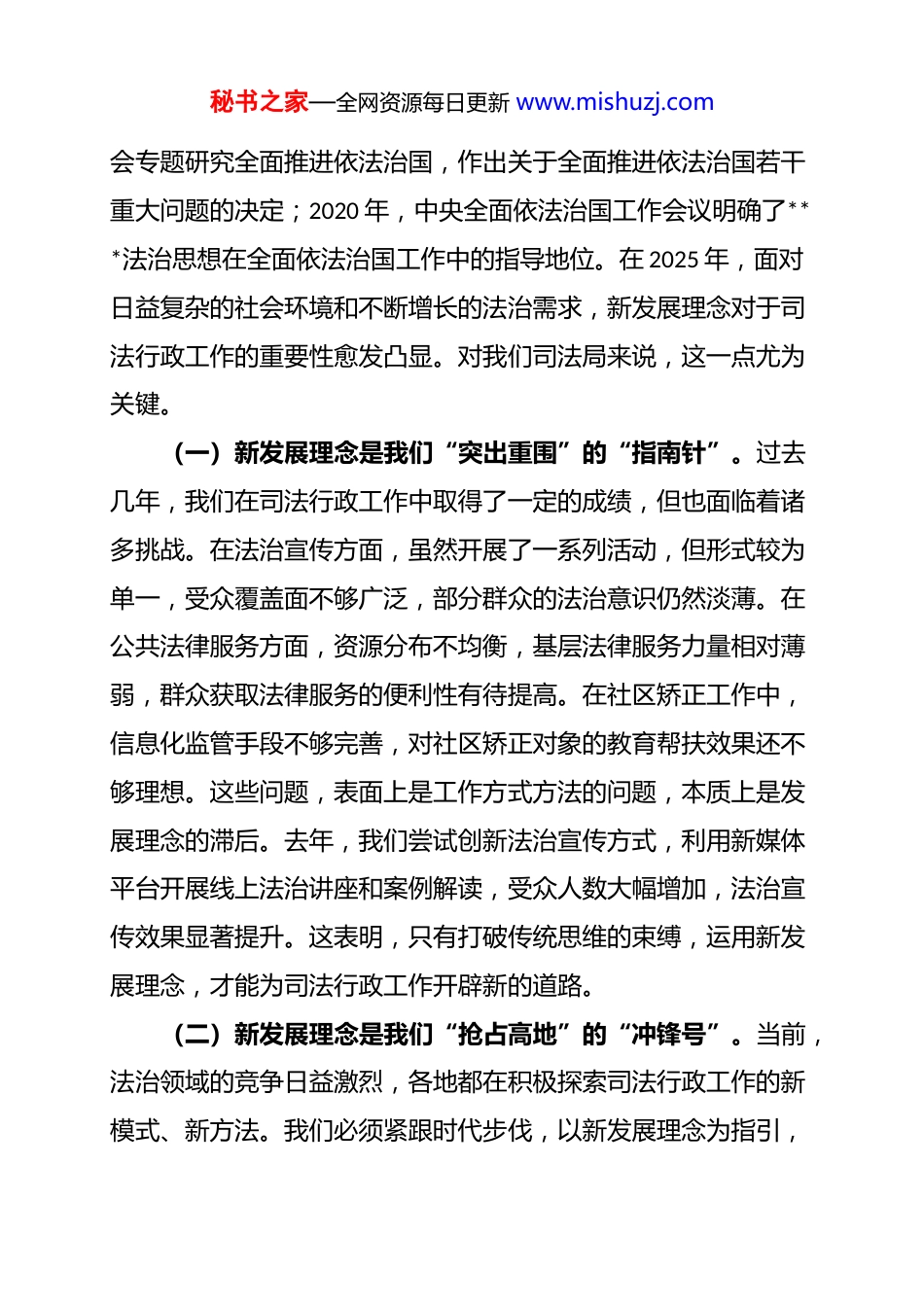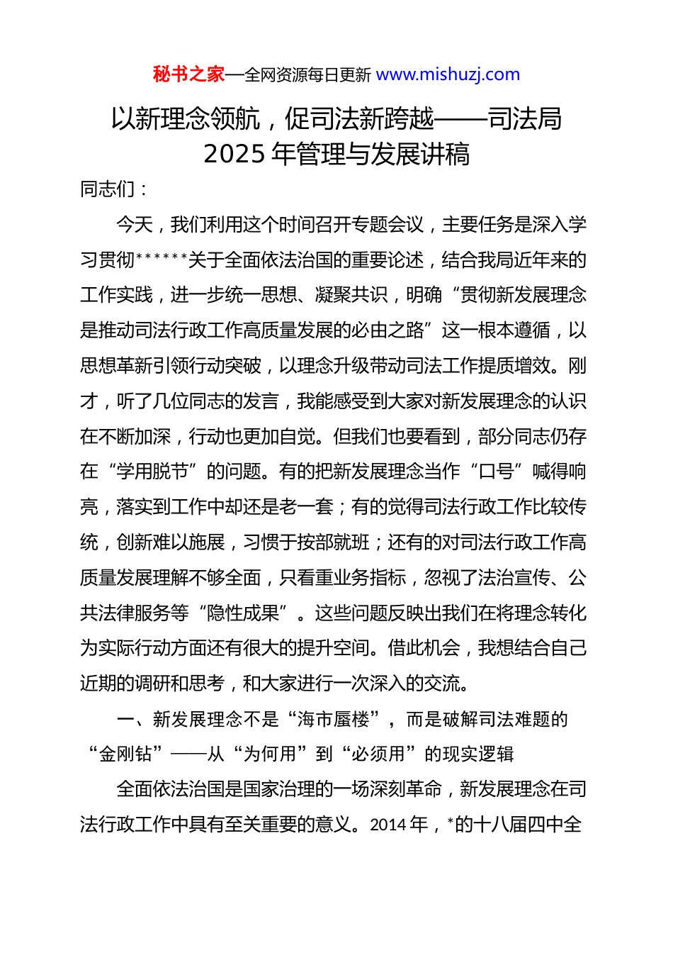 秘书之家—全网资源每日更新 www.mishuzj.com以新理念领航,促司法新跨越——司法局2025 年管理与发展讲稿同志们:今天,我们利用这个时间召开专题会议,主要任务是深入学习贯彻******关于全面依法治国的重要论述,结合我局近年来的工作实践,进一步统一思想、凝聚共识,明确“贯彻新发展理念是推动司法行政工作高质量发展的必由之路”这一根本遵循,以思想革新引领行动突破,以理念升级带动司法工作提质增效。刚才,听了几位同志的发言,我能感受到大家对新发展理念的认识在不断加深,行动也更加自觉。但我们也要看到,部分同志仍存在“学用脱节”的问题。有的把新发展理念当作“口号”喊得响亮,落实到工作中却还是老一套;有的觉得司法行政工作比较传统,创新难以施展,习惯于按部就班;还有的对司法行政工作高质量发展理解不够全面,只看重业务指标,忽视了法治宣传、公共法律服务等“隐性成果”。这些问题反映出我们在将理念转化为实际行动方面还有很大的提升空间。借此机会,我想结合自己近期的调研和思考,和大家进行一次深入的交流。一、新发展理念不是“海市蜃楼”,而是破解司法难题的“金刚钻”——从“为何用”到“必须用”的现实逻辑全面依法治国是国家治理的一场深刻革命,新发展理念在司法行政工作中具有至关重要的意义。2014 年,*的十八届四中全秘书之家—全网资源每日更新 www.mishuzj.com会专题研究全面推进依法治国,作出关于全面推进依法治国若干重大问题的决定;2020 年,中央全面依法治国工作会议明确了***法治思想在全面依法治国工作中的指导地位。在 2025 年,面对日益复杂的社会环境和不断增长的法治需求,新发展理念对于司法行政工作的重要性愈发凸显。对我们司法局来说,这一点尤为关键。(一)新发展理念是我们“突出重围”的“指南针”。过去几年,我们在司法行政工作中取得了一定的成绩,但也面临着诸多挑战。在法治宣传方面,虽然开展了一系列活动,但形式较为单一,受众覆盖面不够广泛,部分群众的法治意识仍然淡薄。在公共法律服务方面,资源分布不均衡,基层法律服务力量相对薄弱,群众获取法律服务的便利性有待提高。在社区矫正工作中,信息化监管手段不够完善,对社区矫正对象的教育帮扶效果还不够理想。这些问题,表面上是工作方式方法的问题,本质上是发展理念的滞后。去年,我们尝试创新法治宣传方式,利用新媒体平台开展线上法治讲座和案例解读,受众人数大幅增加,法治宣传效果显著提升。这表明,只有打破传统思维的束缚,运用新发展理念,才能为司法行政工作开辟新的道路。(二)新发展理念是我们“抢占高地”的“冲锋号”。当前,法治领域的竞争日益激烈,各地都在积极探索司法行政工作的新模式、新方法。我们必须紧跟时代步伐,以新发展理念为指引,秘书之家—全网资源每日更新 www.mishuzj.com抢占法治建设的制高点。比如,在智慧司法建设方面,一些先进地区已经取得了显著成效,通过大数据、人工智能等技术手段,实现了司法行政工作的智能化、高效化。我们虽然在这方面起步较晚,但不能甘居人后。今年,我们计划与科技企业合作,开发“智慧司法服务平台”,整合法治宣传、法律援助、社区矫正等多项功能,为群众提供一站式、便捷化的法律服务。这一举措将有助于提升我们的司法行政工作水平,增强在法治领域的竞争力。(三)新发展理念是我们“行稳致远”的“定盘星”。司法行政工作的最终目标是保障人民群众的合法权益,维护社会公平正义。新发展理念强调以人民为中心,这与我们的工作宗旨高度契合。去年,我们在处理一起法律援助案件时,由于工作不够细致,导致当事人的合法权益未能得到充分保障,引发了当事人的不满。这件事让我们深刻认识到,如果我们的工作不能满足人民群众的需求,不能体现公平正义,那么司法行政工作就失去了意义。今年,我们将进一步加强公共法律服务体系建设,扩大法律援助覆盖面,提高法律服务质量,让人民群众在每一项法律制度、每一个执法决定、每一宗司法案件中都感受到公平正义。同时,我们还将加强对社区矫正对象的教育帮扶,帮助他们重新融入社会,减少重新犯罪的可能性,维护社会的和谐稳...