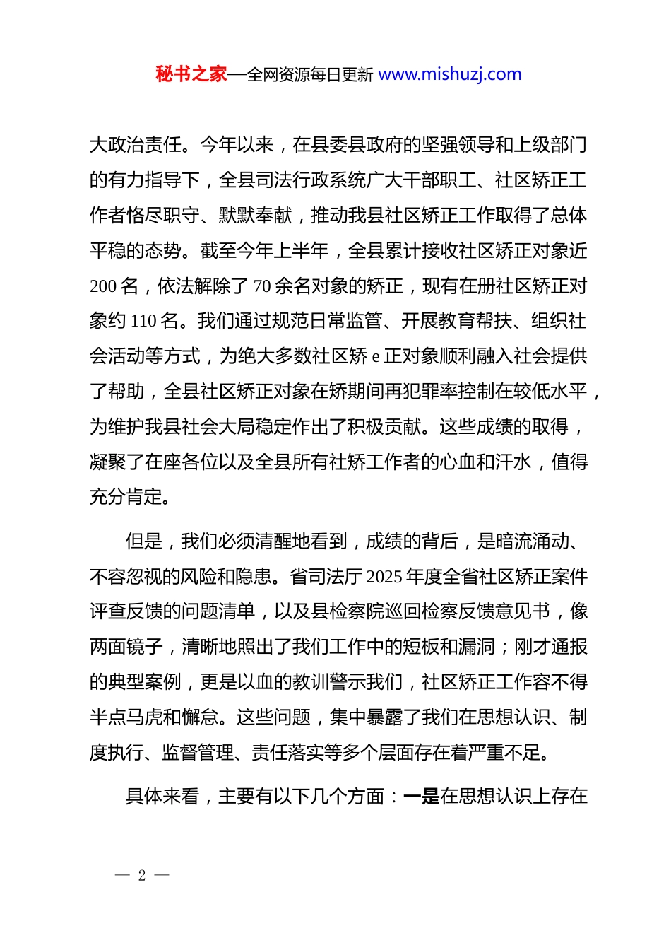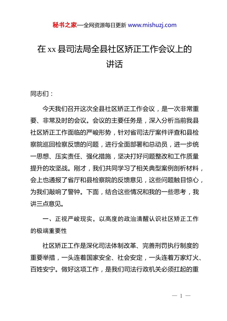秘书之家—全网资源每日更新 www.mishuzj.com在 xx 县司法局全县社区矫正工作会议上的讲话同志们:今天我们召开这次全县社区矫正工作会议,是一次非常重要、非常及时的会议。会议的主要任务是,深入分析当前我县社区矫正工作面临的严峻形势,针对省司法厅案件评查和县检察院巡回检察反馈的问题,进行全面部署和总动员,进一步统一思想、压实责任、强化措施,坚决打好问题整改和工作质量提升的攻坚战。刚才,我们共同学习了相关典型案例剖析材料,会上也通报了省厅和县检察院的反馈意见,这些问题触目惊心,为我们敲响了警钟。下面,结合这些情况和我的一些思考,我讲三点意见。一、正视严峻现实,以高度的政治清醒认识社区矫正工作的极端重要性社区矫正工作是深化司法体制改革、完善刑罚执行制度的重要举措,一头连着国家安全、社会安定,一头连着万家灯火、百姓安宁。做好这项工作,是我们司法行政机关必须扛起的重— 1 —秘书之家—全网资源每日更新 www.mishuzj.com大政治责任。今年以来,在县委县政府的坚强领导和上级部门的有力指导下,全县司法行政系统广大干部职工、社区矫正工作者恪尽职守、默默奉献,推动我县社区矫正工作取得了总体平稳的态势。截至今年上半年,全县累计接收社区矫正对象近200 名,依法解除了 70 余名对象的矫正,现有在册社区矫正对象约 110 名。我们通过规范日常监管、开展教育帮扶、组织社会活动等方式,为绝大多数社区矫 e 正对象顺利融入社会提供了帮助,全县社区矫正对象在矫期间再犯罪率控制在较低水平,为维护我县社会大局稳定作出了积极贡献。这些成绩的取得,凝聚了在座各位以及全县所有社矫工作者的心血和汗水,值得充分肯定。但是,我们必须清醒地看到,成绩的背后,是暗流涌动、不容忽视的风险和隐患。省司法厅 2025 年度全省社区矫正案件评查反馈的问题清单,以及县检察院巡回检察反馈意见书,像两面镜子,清晰地照出了我们工作中的短板和漏洞;刚才通报的典型案例,更是以血的教训警示我们,社区矫正工作容不得半点马虎和懈怠。这些问题,集中暴露了我们在思想认识、制度执行、监督管理、责任落实等多个层面存在着严重不足。具体来看,主要有以下几个方面:一是在思想认识上存在— 2 —秘书之家—全网资源每日更新 www.mishuzj.com“温差”。部分同志,包括一些单位的负责同志,对社区矫正工作的艰巨性、复杂性和高风险性认识不足,未能从维护国家政治安全和社会稳定的高度来审视这项工作,存在“重接收、轻监管、弱教育”的倾向,麻痹思想、松懈情绪时有滋生。二是在执法规范上存在“偏差”。案件评查和巡回检察反馈的问题,很多都出在程序上。比如,调查评估报告要素不全、流于形式;接收宣告程序不严肃、不规范;日常监管记录不及时、不完整;审批权限不清、越权审批等问题屡有发生。这些看似是“小节”的问题,实际上反映了我们法治意识不强、规矩意识淡薄,是执法不严、司法不公的直接体现。三是在监督管理上存在“落差”。对社区矫正对象的监管措施未能完全落地落实,有的定位核查不及时,有的请销假制度执行不严,对一些有脱管、漏管风险的重点人员,未能做到精准管控、有效预警。智慧矫正平台的作用没有得到充分发挥,技术手段与传统方法结合不够紧密,人防、物防、技防体系存在明显短板。四是在教育帮扶上存在“温差”。教育帮扶工作满足于“大水漫灌”,搞“一刀切”,缺乏针对性和实效性。个别化矫正方案制定不科学,心理疏导、就业指导、技能培训等措施跟不上,没有真正触及矫正对象的思想灵魂深处,导致教育矫正效果大打折扣。— 3 —秘书之家—全网资源每日更新 www.mishuzj.com同志们,问题是时代的声音,也是我们前进的动力。这些问题的产生,根源在于我们一些同志的政治站位不高、责任心不强、业务能力不足、工作作风不实。我们必须以刀刃向内的勇气,对这些问题进行一次彻底的“大扫除”,刮骨疗毒、猛药去疴。如果对这些问题视而不见、听之任之,小问题就会演变成大问题,小管涌就可能溃决成大堤坝,一旦发生社区矫正对象脱管、漏管甚至重新犯罪的恶性事件,不仅会给社会稳定带来冲击,更会使我...