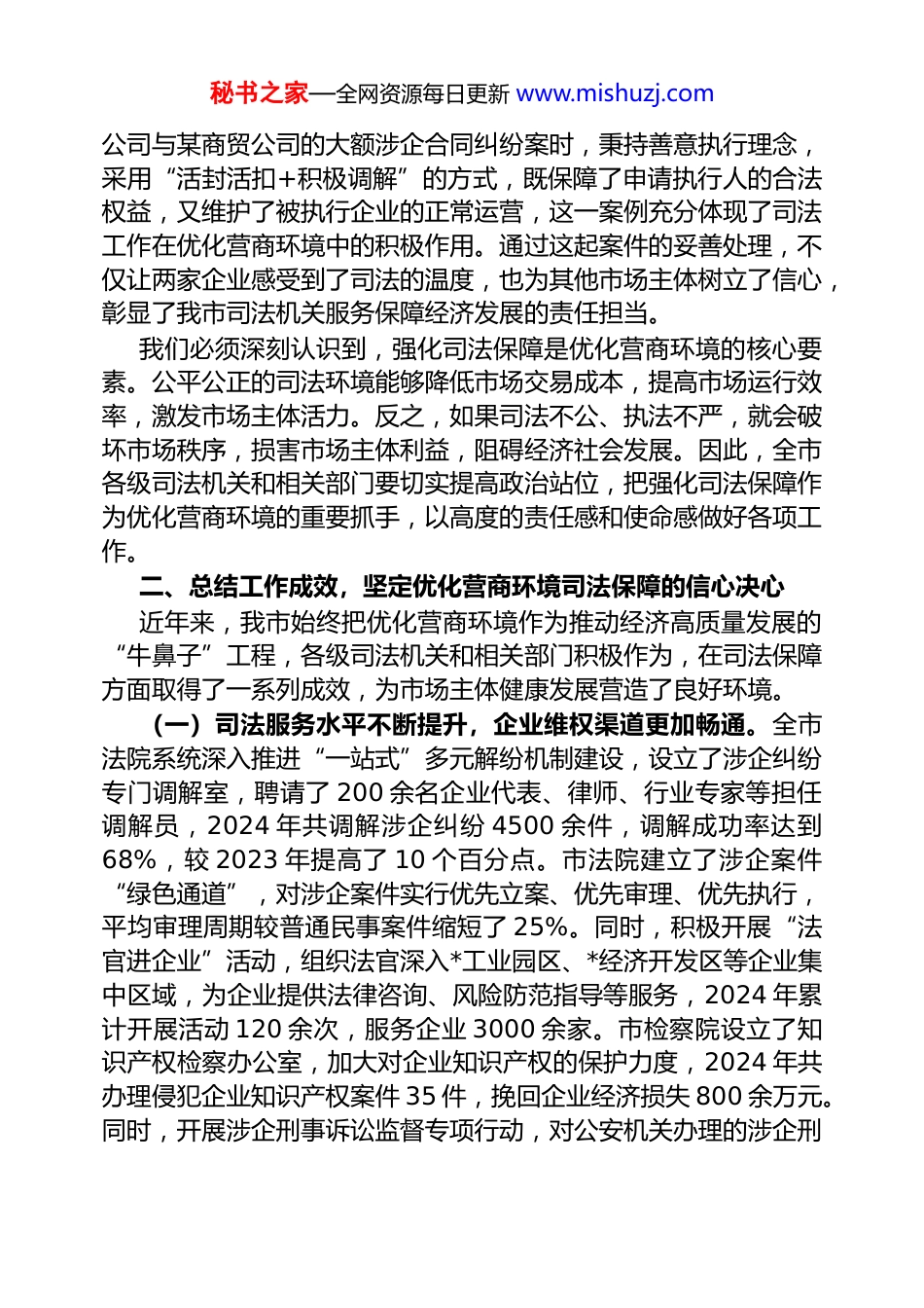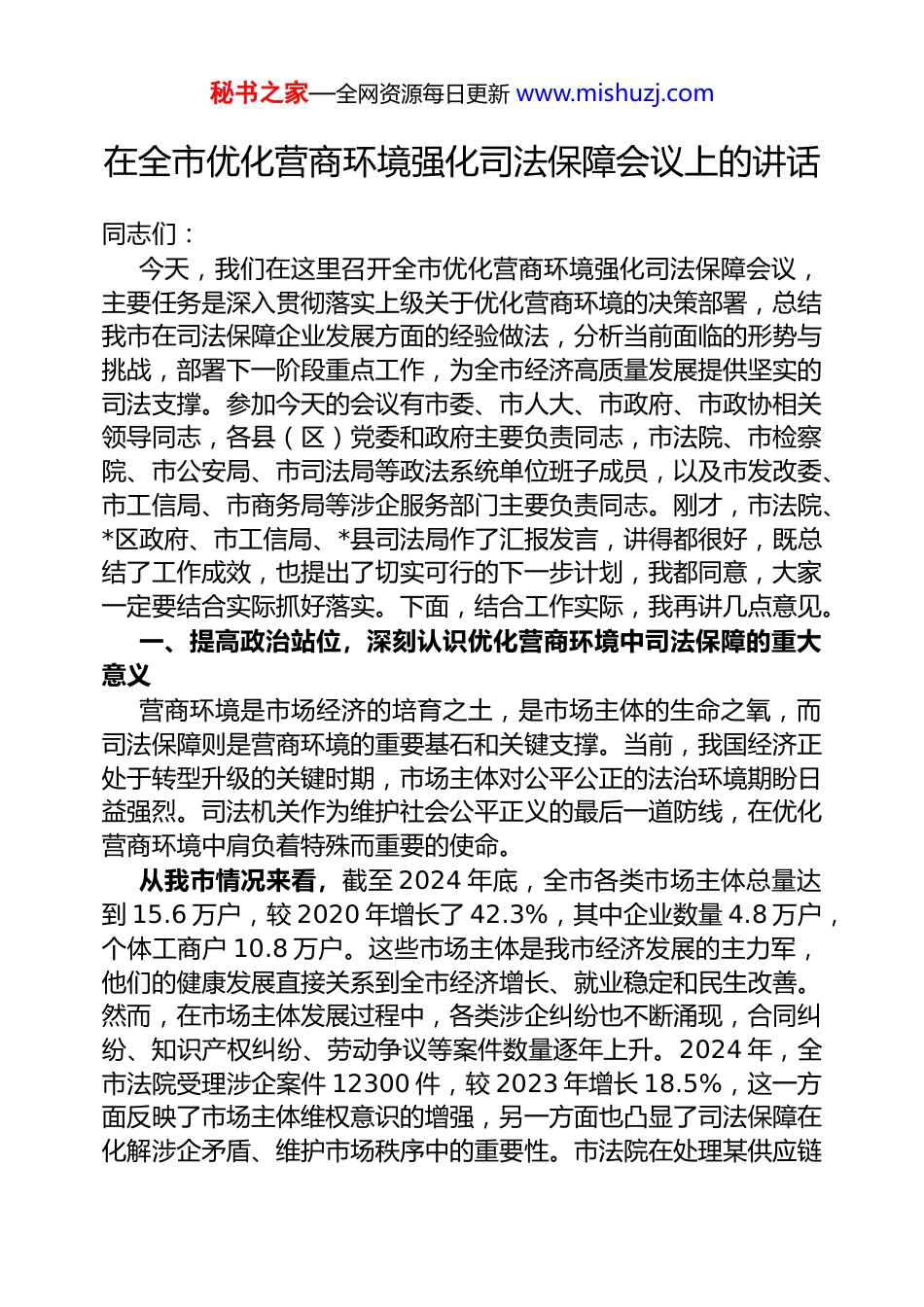 秘书之家—全网资源每日更新 www.mishuzj.com在全市优化营商环境强化司法保障会议上的讲话同志们:今天,我们在这里召开全市优化营商环境强化司法保障会议,主要任务是深入贯彻落实上级关于优化营商环境的决策部署,总结我市在司法保障企业发展方面的经验做法,分析当前面临的形势与挑战,部署下一阶段重点工作,为全市经济高质量发展提供坚实的司法支撑。参加今天的会议有市委、市人大、市政府、市政协相关领导同志,各县(区)党委和政府主要负责同志,市法院、市检察院、市公安局、市司法局等政法系统单位班子成员,以及市发改委、市工信局、市商务局等涉企服务部门主要负责同志。刚才,市法院、*区政府、市工信局、*县司法局作了汇报发言,讲得都很好,既总结了工作成效,也提出了切实可行的下一步计划,我都同意,大家一定要结合实际抓好落实。下面,结合工作实际,我再讲几点意见。一、提高政治站位,深刻认识优化营商环境中司法保障的重大意义营商环境是市场经济的培育之土,是市场主体的生命之氧,而司法保障则是营商环境的重要基石和关键支撑。当前,我国经济正处于转型升级的关键时期,市场主体对公平公正的法治环境期盼日益强烈。司法机关作为维护社会公平正义的最后一道防线,在优化营商环境中肩负着特殊而重要的使命。从我市情况来看,截至 2024 年底,全市各类市场主体总量达到 15.6 万户,较 2020 年增长了 42.3%,其中企业数量 4.8 万户,个体工商户 10.8 万户。这些市场主体是我市经济发展的主力军,他们的健康发展直接关系到全市经济增长、就业稳定和民生改善。然而,在市场主体发展过程中,各类涉企纠纷也不断涌现,合同纠纷、知识产权纠纷、劳动争议等案件数量逐年上升。2024 年,全市法院受理涉企案件 12300 件,较 2023 年增长 18.5%,这一方面反映了市场主体维权意识的增强,另一方面也凸显了司法保障在化解涉企矛盾、维护市场秩序中的重要性。市法院在处理某供应链秘书之家—全网资源每日更新 www.mishuzj.com公司与某商贸公司的大额涉企合同纠纷案时,秉持善意执行理念,采用“活封活扣+积极调解”的方式,既保障了申请执行人的合法权益,又维护了被执行企业的正常运营,这一案例充分体现了司法工作在优化营商环境中的积极作用。通过这起案件的妥善处理,不仅让两家企业感受到了司法的温度,也为其他市场主体树立了信心,彰显了我市司法机关服务保障经济发展的责任担当。我们必须深刻认识到,强化司法保障是优化营商环境的核心要素。公平公正的司法环境能够降低市场交易成本,提高市场运行效率,激发市场主体活力。反之,如果司法不公、执法不严,就会破坏市场秩序,损害市场主体利益,阻碍经济社会发展。因此,全市各级司法机关和相关部门要切实提高政治站位,把强化司法保障作为优化营商环境的重要抓手,以高度的责任感和使命感做好各项工作。二、总结工作成效,坚定优化营商环境司法保障的信心决心近年来,我市始终把优化营商环境作为推动经济高质量发展的“牛鼻子”工程,各级司法机关和相关部门积极作为,在司法保障方面取得了一系列成效,为市场主体健康发展营造了良好环境。(一)司法服务水平不断提升,企业维权渠道更加畅通。全市法院系统深入推进“一站式”多元解纷机制建设,设立了涉企纠纷专门调解室,聘请了 200 余名企业代表、律师、行业专家等担任调解员,2024 年共调解涉企纠纷 4500 余件,调解成功率达到68%,较 2023 年提高了 10 个百分点。市法院建立了涉企案件“绿色通道”,对涉企案件实行优先立案、优先审理、优先执行,平均审理周期较普通民事案件缩短了 25%。同时,积极开展“法官进企业”活动,组织法官深入*工业园区、*经济开发区等企业集中区域,为企业提供法律咨询、风险防范指导等服务,2024 年累计开展活动 120 余次,服务企业 3000 余家。市检察院设立了知识产权检察办公室,加大对企业知识产权的保护力度,2024 年共办理侵犯企业知识产权案件 35 件,挽回企业经济损失 800 余万元。同时,开展涉企刑事诉讼监督专项行动,对公安机关办理的涉企刑秘书之家—全网资源每日更新 www....