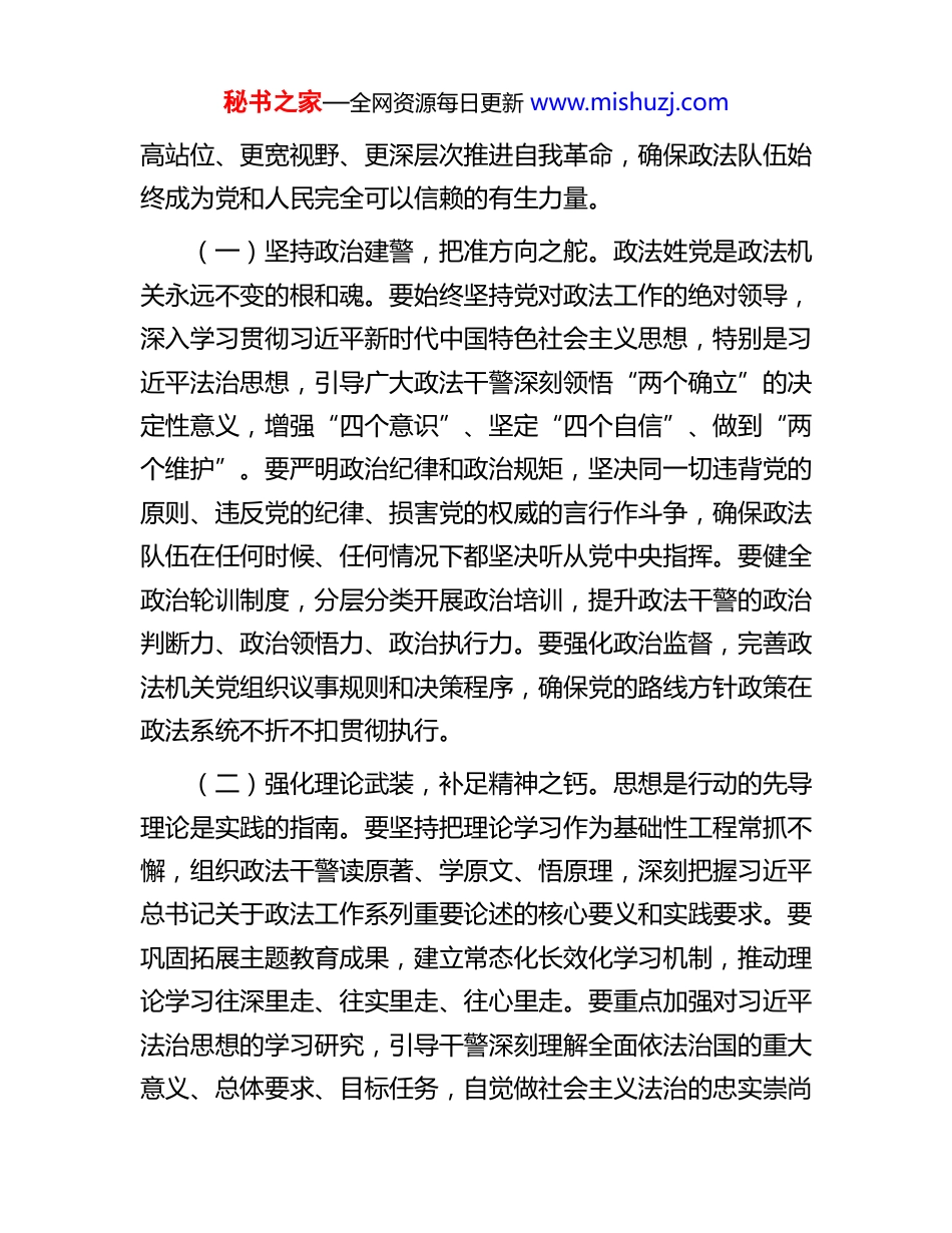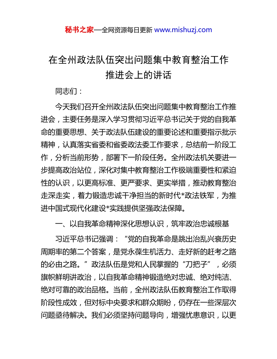 秘书之家—全网资源每日更新 www.mishuzj.com在全州政法队伍突出问题集中教育整治工作推进会上的讲话同志们:今天我们召开全州政法队伍突出问题集中教育整治工作推进会,主要任务是深入学习贯彻习近平总书记关于党的自我革命的重要思想、关于政法队伍建设的重要论述和重要指示批示精神,认真落实省委和省委政法委工作要求,总结前一阶段工作,分析当前形势,部署下一阶段任务。全州政法机关要进一步提高政治站位,深化对集中教育整治工作极端重要性和紧迫性的认识,以更高标准、更严要求、更实举措,推动教育整治走深走实,着力锻造忠诚干净担当的新时代*政法铁军,为推进中国式现代化建设*实践提供坚强政法保障。一、以自我革命精神深化思想认识,筑牢政治忠诚根基习近平总书记强调:“党的自我革命是跳出治乱兴衰历史周期率的第二个答案,是党永葆生机活力、走好新的赶考之路的必由之路。”政法队伍是党和人民掌握的“刀把子”,必须旗帜鲜明讲政治,以自我革命精神锻造绝对忠诚、绝对纯洁、绝对可靠的政治品格。当前,全州政法队伍教育整治工作取得阶段性成效,但对标中央要求和群众期盼,仍存在一些深层次问题亟待解决。我们必须坚持问题导向,增强忧患意识,以更秘书之家—全网资源每日更新 www.mishuzj.com高站位、更宽视野、更深层次推进自我革命,确保政法队伍始终成为党和人民完全可以信赖的有生力量。(一)坚持政治建警,把准方向之舵。政法姓党是政法机关永远不变的根和魂。要始终坚持党对政法工作的绝对领导,深入学习贯彻习近平新时代中国特色社会主义思想,特别是习近平法治思想,引导广大政法干警深刻领悟“两个确立”的决定性意义,增强“四个意识”、坚定“四个自信”、做到“两个维护”。要严明政治纪律和政治规矩,坚决同一切违背党的原则、违反党的纪律、损害党的权威的言行作斗争,确保政法队伍在任何时候、任何情况下都坚决听从党中央指挥。要健全政治轮训制度,分层分类开展政治培训,提升政法干警的政治判断力、政治领悟力、政治执行力。要强化政治监督,完善政法机关党组织议事规则和决策程序,确保党的路线方针政策在政法系统不折不扣贯彻执行。(二)强化理论武装,补足精神之钙。思想是行动的先导理论是实践的指南。要坚持把理论学习作为基础性工程常抓不懈,组织政法干警读原著、学原文、悟原理,深刻把握习近平总书记关于政法工作系列重要论述的核心要义和实践要求。要巩固拓展主题教育成果,建立常态化长效化学习机制,推动理论学习往深里走、往实里走、往心里走。要重点加强对习近平法治思想的学习研究,引导干警深刻理解全面依法治国的重大意义、总体要求、目标任务,自觉做社会主义法治的忠实崇尚秘书之家—全网资源每日更新 www.mishuzj.com者、自觉遵守者、坚定捍卫者。要创新学习方式,运用线上线下多种平台,增强理论学习的吸引力和感染力,确保学有所思、学有所获、学以致用。(三)提升党性修养,筑牢信仰之基。党性是党员干部立身、立业、立言、立德的基石。要加强党性教育,引导政法干警牢记第一身份是共产党员,第一职责是为党工作,自觉用党章党规党纪约束言行。要深入开展党史学习教育,从党的百年奋斗历程中汲取智慧和力量,弘扬伟大建党精神,传承红色基因,赓续红色血脉。要严肃党内政治生活,严格执行“三会一课”、民主生活会、组织生活会、谈心谈话等制度,开展批评和自我批评,增强党内政治生活的政治性、时代性、原则性、战斗性。要加强道德修养,引导干警明大德、守公德、严私德,追求高尚情操,自觉远离低级趣味,坚决抵制歪风邪气。(四)严明纪律规矩,绷紧作风之弦。纪律严明、作风优良是政法队伍的优良传统和鲜明特质。要把纪律建设摆在更加突出位置,深入开展党纪学习教育,重点强化政治纪律、组织纪律、廉洁纪律、群众纪律、工作纪律、生活纪律,让铁的纪律转化为干警的日常习惯和自觉遵循。要狠抓作风养成,坚决整治形式主义、官僚主义,持续为基层减负。要弘扬英模精神,选树宣传先进典型,激励广大干警见贤思齐、担当作为。要注重家庭家教家风建设,引导干警廉洁修身、廉洁齐家,管好自己、管好家人、管好身...