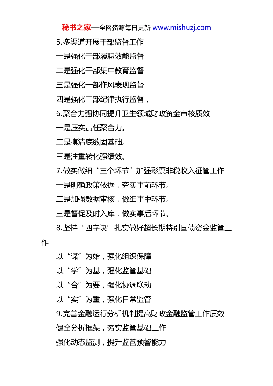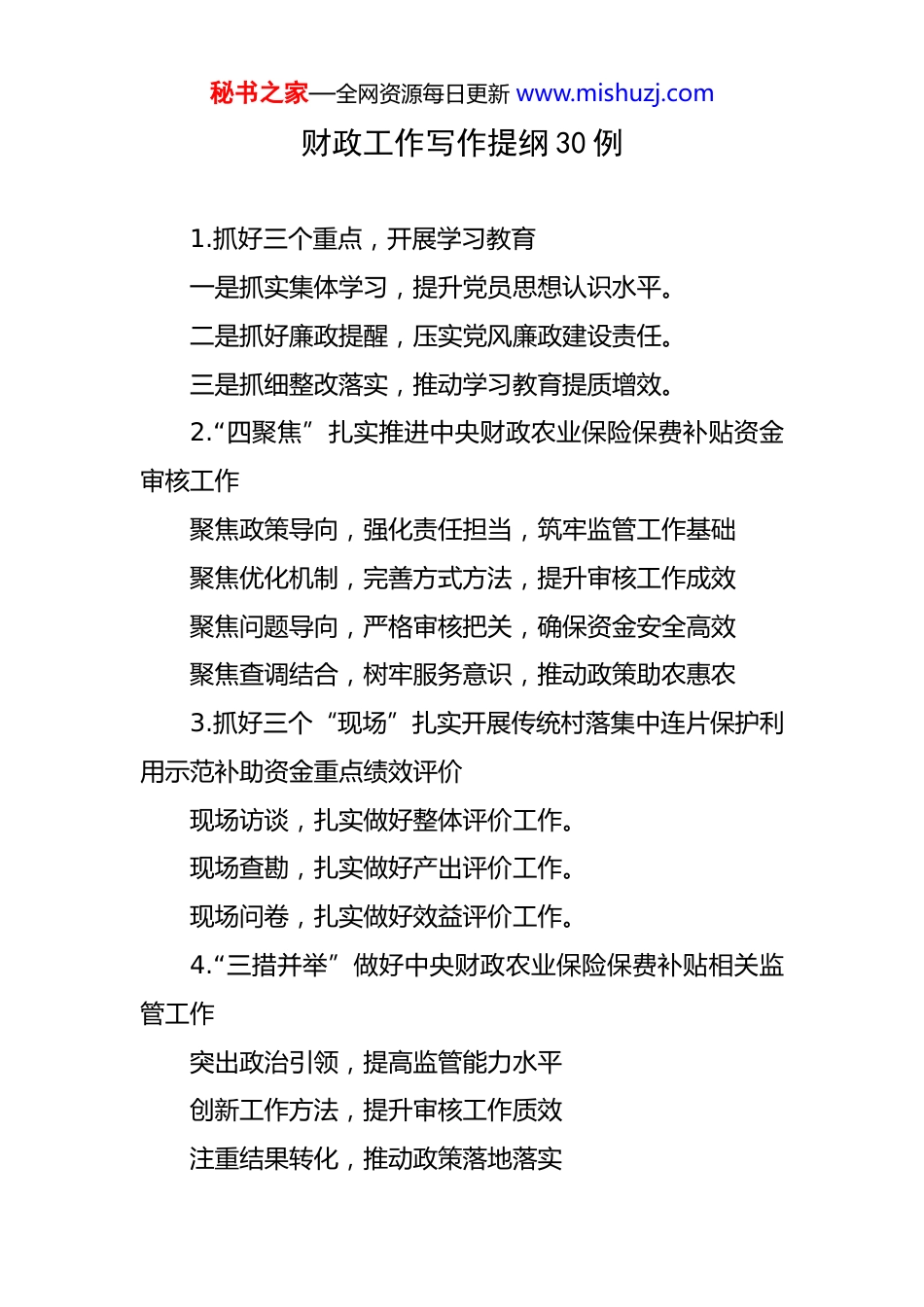 秘书之家—全网资源每日更新 www.mishuzj.com财政工作写作提纲 30 例 1.抓好三个重点,开展学习教育一是抓实集体学习,提升党员思想认识水平。二是抓好廉政提醒,压实党风廉政建设责任。三是抓细整改落实,推动学习教育提质增效。2.“四聚焦”扎实推进中央财政农业保险保费补贴资金审核工作聚焦政策导向,强化责任担当,筑牢监管工作基础聚焦优化机制,完善方式方法,提升审核工作成效聚焦问题导向,严格审核把关,确保资金安全高效聚焦查调结合,树牢服务意识,推动政策助农惠农3.抓好三个“现场”扎实开展传统村落集中连片保护利用示范补助资金重点绩效评价现场访谈,扎实做好整体评价工作。现场查勘,扎实做好产出评价工作。现场问卷,扎实做好效益评价工作。4.“三措并举”做好中央财政农业保险保费补贴相关监管工作突出政治引领,提高监管能力水平创新工作方法,提升审核工作质效注重结果转化,推动政策落地落实秘书之家—全网资源每日更新 www.mishuzj.com5.多渠道开展干部监督工作一是强化干部履职效能监督二是强化干部集中教育监督三是强化干部作风表现监督四是强化干部纪律执行监督,6.聚合力强协同提升卫生领域财政资金审核质效一是压实责任聚合力。二是摸清底数固基础。三是注重转化强绩效。7.做实做细“三个环节”加强彩票非税收入征管工作一是明确政策依据,夯实事前环节。二是加强数据审核,做细事中环节。三是督促及时入库,做实事后环节。8.坚持“四字诀”扎实做好超长期特别国债资金监管工作以“谋”为始,强化组织保障以“学”为基,强化监管基础以“合”为要,强化协调联动以“实”为重,强化日常监管9.完善金融运行分析机制提高财政金融监管工作质效健全分析框架,夯实监管基础工作强化动态监测,提升监管预警能力秘书之家—全网资源每日更新 www.mishuzj.com聚焦效能提升,推动监管成果转化10.紧扣“严、新、实”三字诀扎实做好地方财政运行分析评估工作“严”字当头,强化规范管理“新”字为要,持续推进创新“实”字托底,确保工作成效11.“三措并举”扎实开展国有金融资本产权登记管理工作一是夯实工作基础,深入领会政策精神。二是紧扣工作重点,有序推进相关工作。三是强化沟通协作,全面监督工作情况。12.“三细化”规范成品油价格和税费改革收入划转调库审核一是梳理政策文件,细化审核依据。二是注重人员培训,细化审核职责。三是加强数据比对,细化审核过程。13.提高政治站位,切实把中央八项规定精神落实到日常监管工作一是深入学习贯彻,凝聚思想共识。二是坚持求真务实,提升工作质效。三是严守纪律底线,保持清正廉洁。14.认真开展内部控制报告审核评价工作秘书之家—全网资源每日更新 www.mishuzj.com一是线上审核与线下审核相结合。二是内控报告审核与日常监管相结合。三是发现问题与推动规范管理相结合。15.紧密结合办公室职责职能,认真学习贯彻中央八项规定精神一是持续深入强化学习。二是持续发挥服务效能。三是持续加强作风建设。16.四项措施扎实开展资产评估监督检查工作坚持政治引领,加强组织领导坚持目标导向,提升监督效能严格依法行政,扎实有序推进严守工作纪律,展现良好形象17.多措并举统筹推进城乡居民基本医疗保险补助资金审核工作提高站位,加强政策的精准把握不断创新,提升审核的工作质效加强闭环,扩大审核的成果利用18.三向发力全面提高干部教育培训质效抓责任落实,推动教育管理从严从实抓政治教育,推动理论武装入脑入心抓内部挖潜,推动能力提升见行见效秘书之家—全网资源每日更新 www.mishuzj.com19.三方面做好中央财政农业保险保费补贴资金结算审核工作一是提高政治站位,把准政策着力点。二是强化分析比对,严把审核关键点。三是完善联系机制,找出工作结合点。20.三举措做好传统村落集中连片保护利用示范补助资金绩效评价前期工作一是强化政策研读,明确评价标准。二是加强部门联动,夯实基础数据。三是科学制定方案,突出评价重点。21.突出“三性”扎实做好干部教育培训工作突出政治性,持续抓好理论学习教育突出针对性,持续抓好专业能力培训突出规范性,持续抓好综合能力培训22.“三个强化”推动决算...