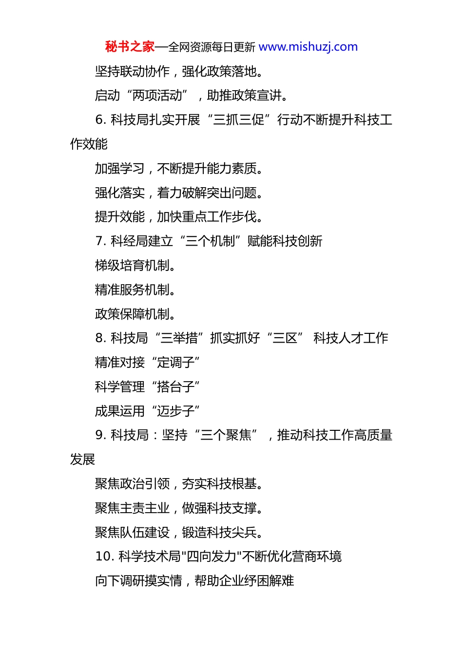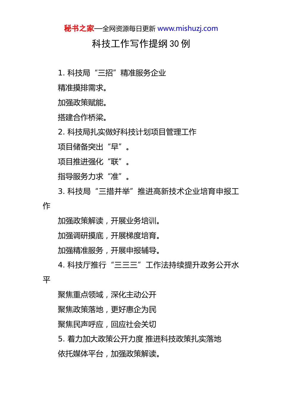 秘书之家—全网资源每日更新 www.mishuzj.com科技工作写作提纲 30 例 1. 科技局“三招”精准服务企业精准摸排需求。加强政策赋能。搭建合作桥梁。2. 科技局扎实做好科技计划项目管理工作项目储备突出“早”。项目推进强化“联”。指导服务力求“准”。3. 科技局“三措并举”推进高新技术企业培育申报工作加强政策解读,开展业务培训。加强调研摸底,开展梯度培育。加强精准服务,开展申报辅导。4. 科技厅推行“三三三”工作法持续提升政务公开水平聚焦重点领域,深化主动公开聚焦政策落地,更好惠企为民聚焦民声呼应,回应社会关切5. 着力加大政策公开力度 推进科技政策扎实落地依托媒体平台,加强政策解读。秘书之家—全网资源每日更新 www.mishuzj.com坚持联动协作,强化政策落地。启动“两项活动”,助推政策宣讲。6. 科技局扎实开展“三抓三促”行动不断提升科技工作效能加强学习,不断提升能力素质。强化落实,着力破解突出问题。提升效能,加快重点工作步伐。7. 科经局建立“三个机制”赋能科技创新梯级培育机制。精准服务机制。政策保障机制。8. 科技局“三举措”抓实抓好“三区” 科技人才工作精准对接“定调子”科学管理“搭台子”成果运用“迈步子”9. 科技局:坚持“三个聚焦”,推动科技工作高质量发展聚焦政治引领,夯实科技根基。聚焦主责主业,做强科技支撑。聚焦队伍建设,锻造科技尖兵。10. 科学技术局"四向发力"不断优化营商环境向下调研摸实情,帮助企业纾困解难秘书之家—全网资源每日更新 www.mishuzj.com向上对接争支持,夯实企业发展基础向外拓展促合作,拓宽创新资源网络向内聚力抓落实,转变作风提升效能11. “三强化”做好科技进步统计监测核对工作强化学习,提升业务引领力。强化合作,提升工作凝聚力。强化审核,提升数据管控力。12. 科学技术局着力“三举措”助力县域经济社会事业高质量发展抓主体夯基础,培育壮大县域科技创新力量。抓攻关促转化,支撑引领县域产业转型发展。抓人才激活力,增强城乡创新发展内生动能。13. 科技局“三着力”举措筑牢科技创新驱动发展着力提升全民创新意识。着力培育高效孵化平台。着力夯实企业科技服务。14. 科技赋能+链式发展绘就乡村振兴新图景科技赋能强品质:从“靠天收”到“科技种”,打造优质桃业“芯片”延链补链强价值:从“卖桃子”到“卖品牌”,激活产业增值“新引擎”三产融合拓空间:从“桃园”到“景区”,绘就农文秘书之家—全网资源每日更新 www.mishuzj.com旅融合“新画卷”15. 科技创新赋能产业升级助推经济高质量发展政策精准赋能,构建创新生态体系搭建合作平台,打通成果转化链条科技深度渗透,激活产业升级动能16. 强化科技创新引领 赋能企业高质量发展优化政策体系,激发创新潜能强化政策宣传,提升服务效能深化产学研合作,促进成果转化17. 科技局多措并举助力小微企业发展提质增速强化政策引导,营造创新良好氛围。强化科技服务,推进创新载体建设。强化资源共享,提升科研效率成效。18. 科技服务三覆盖 创新能力大提升惠企政策宣传全覆盖。科技工作服务全覆盖。奖补资金落实全覆盖。19. 科学技术局 “三聚焦”打造县域农业科技高质量发展新引擎聚焦创新资源引进,探索推动科技创新新路径。聚焦创新平台建设,持续释放创新发展新动能。聚焦创新主体培育,逐步形成竞相发展新格局。秘书之家—全网资源每日更新 www.mishuzj.com20. 科技局聚焦科技人才引育,提供创新发展智力支持选派科技助企秘书。支持引育高端人才。加大科技奖励支持。21. 科学技术局聚焦创新平台建设,实施平台建设跟踪指导提升创新服务能力。提供平台建设保障。加强平台建设指导。22. 科学技术局"五大举措”加力加压创新创造完善现代化产业体系着力推动企业加大科研投入。着力提升创新平台建设质效。着力加强关键核心技术攻关。着力强化企业创新主体地位。着力营造创新创造良好环境。23. 科学技术局坚持“三到位”全力推进城乡融合环境治理提升行动见实效思想认识到位,形成强大合力。责任落实到位,开展全面治理。行动落实到位,保障治理效果。24. 科学技术局推动创新主体培育,...