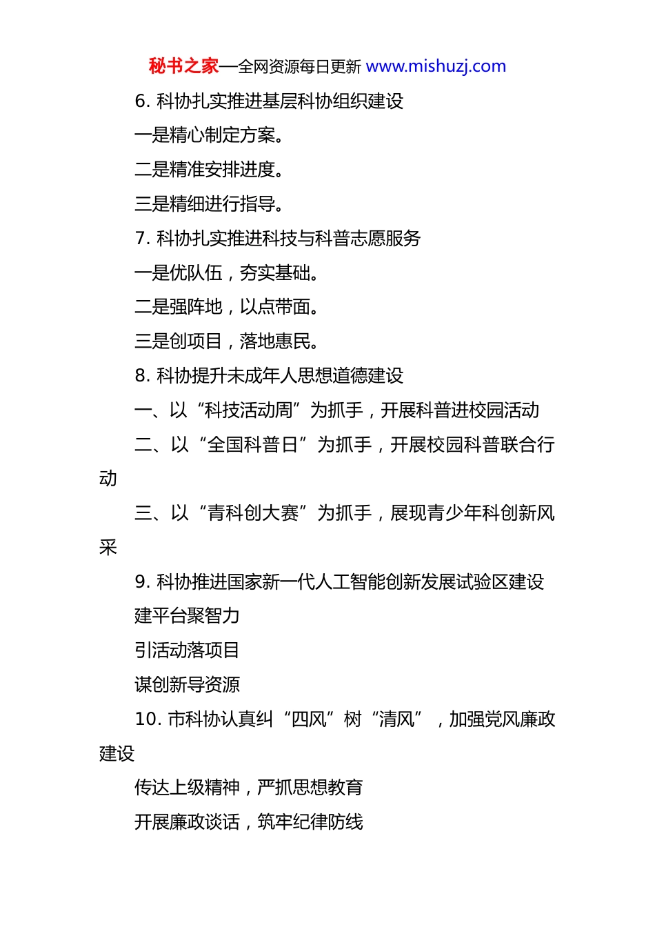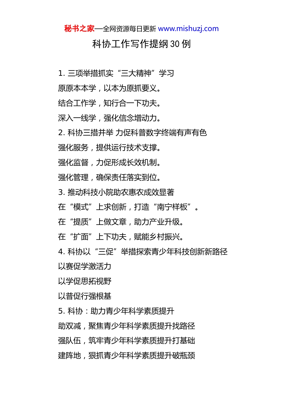 秘书之家—全网资源每日更新 www.mishuzj.com科协工作写作提纲 30 例 1. 三项举措抓实“三大精神”学习原原本本学,以本为原抓要义。结合工作学,知行合一下功夫。深入一线学,强化信念增动力。2. 科协三措并举 力促科普数字终端有声有色强化服务,提供运行技术支撑。强化监督,力促形成长效机制。强化管理,确保责任落实到位。3. 推动科技小院助农惠农成效显著在“模式”上求创新,打造“南宁样板”。在“提质”上做文章,助力产业升级。在“扩面”上下功夫,赋能乡村振兴。4. 科协以“三促”举措探索青少年科技创新新路径以赛促学激活力以学促思拓视野以普促行强根基5. 科协:助力青少年科学素质提升助双减,聚焦青少年科学素质提升找路径强队伍,筑牢青少年科学素质提升打基础建阵地,狠抓青少年科学素质提升破瓶颈秘书之家—全网资源每日更新 www.mishuzj.com6. 科协扎实推进基层科协组织建设一是精心制定方案。二是精准安排进度。三是精细进行指导。7. 科协扎实推进科技与科普志愿服务一是优队伍,夯实基础。二是强阵地,以点带面。三是创项目,落地惠民。8. 科协提升未成年人思想道德建设一、以“科技活动周”为抓手,开展科普进校园活动二、以“全国科普日”为抓手,开展校园科普联合行动三、以“青科创大赛”为抓手,展现青少年科创新风采9. 科协推进国家新一代人工智能创新发展试验区建设建平台聚智力引活动落项目谋创新导资源10. 市科协认真纠“四风”树“清风”,加强党风廉政建设传达上级精神,严抓思想教育开展廉政谈话,筑牢纪律防线秘书之家—全网资源每日更新 www.mishuzj.com发送廉洁提醒,倡导清廉过节11. 县科协贯彻落实县党代会精神一、“学”字当头,迅速传达。二、“宣”字先行,营造氛围。三、“干”字着眼,强化担当。12. 县科协促进三下乡活动有序开展一是抓关键,加强工作领导。二是抓基础,拓展活动形式。三是抓重点,提高科学素质。13. 市科协:以新媒体矩阵助推科普工作质效双升重视新闻媒体宣传,充分释放融合效能建设媒体宣传矩阵,构建全域科普格局聚焦重点强化宣传,全面提升工作质效聚力打造科普品牌,赋能全民科学素质14. 市科协多措并举筑牢保密防线筑牢保密管理防线,压实保密责任筑牢保密宣教防线,增强保密意识筑牢保密技术防线,提升保密能力筑牢保密制度防线,完善保密机制15. 三措并举强科普 健康结硕果健全机制强根基,织密科普组织网络多维宣传扩覆盖,打造科普传播矩阵秘书之家—全网资源每日更新 www.mishuzj.com精准施策惠民生,提升全民健康素养16. “三举措”点燃青少年地质科普研学“新引擎”阵地建设:开辟地质研学“新路径”地质课堂:解码家乡亿年“新史诗”田野考察:触摸地球生命“新印记”17. 优化大学生创新创业生态 助力青春逐梦星沙完善要素保障,夯实创新创业“硬支撑”实施专项行动,激活创新创业“新引擎”强化载体建设,打造创新创业“强磁场”18. 县科协激发“三长”活力全面推进基层组织建设一是全盘谋划,下好“先手棋”。二是精准吸纳,建优“组织网”。三是分类推进,启动“新引擎”。四是建章立制,立明“军令状”。19. 破解四点瓶颈,实现四个转变从“科协单干”向“部门联合”转变从“工作关系”向“亲密娘家”转变从“被动端菜”向“需求点菜”转变从“处处着手”向“试点先行”转变20. 扎实推进银龄科普行动以整合资源为抓手,银龄科普有形有感。以信息化建设为抓手,银龄科普有声有色。秘书之家—全网资源每日更新 www.mishuzj.com以志愿服务为抓手,银龄科普有为有效21. 因地制宜、实事求是,扎实开展科协工作在组织领导上下功夫在科普宣传上做文章在服务培训上求突破22. “三力”合聚,切实打开全乡科协工作新局面科普组织“建机制”,提升“凝聚力”。科普宣传“赶大集”,提高“宣传力”。科普惠农“进田间”,增强“服务力”。23. 县科协:做好三篇文章,抓好新时代科协人才工作筑建团结引领主阵地凝聚人才搭建院士专家连心桥服务人才构建柔性引才大平台用好人才24. 县科协坚持“三步走”推动科协工作走深走实“走上去”争取支持。“走下去”了解实情。“走出...