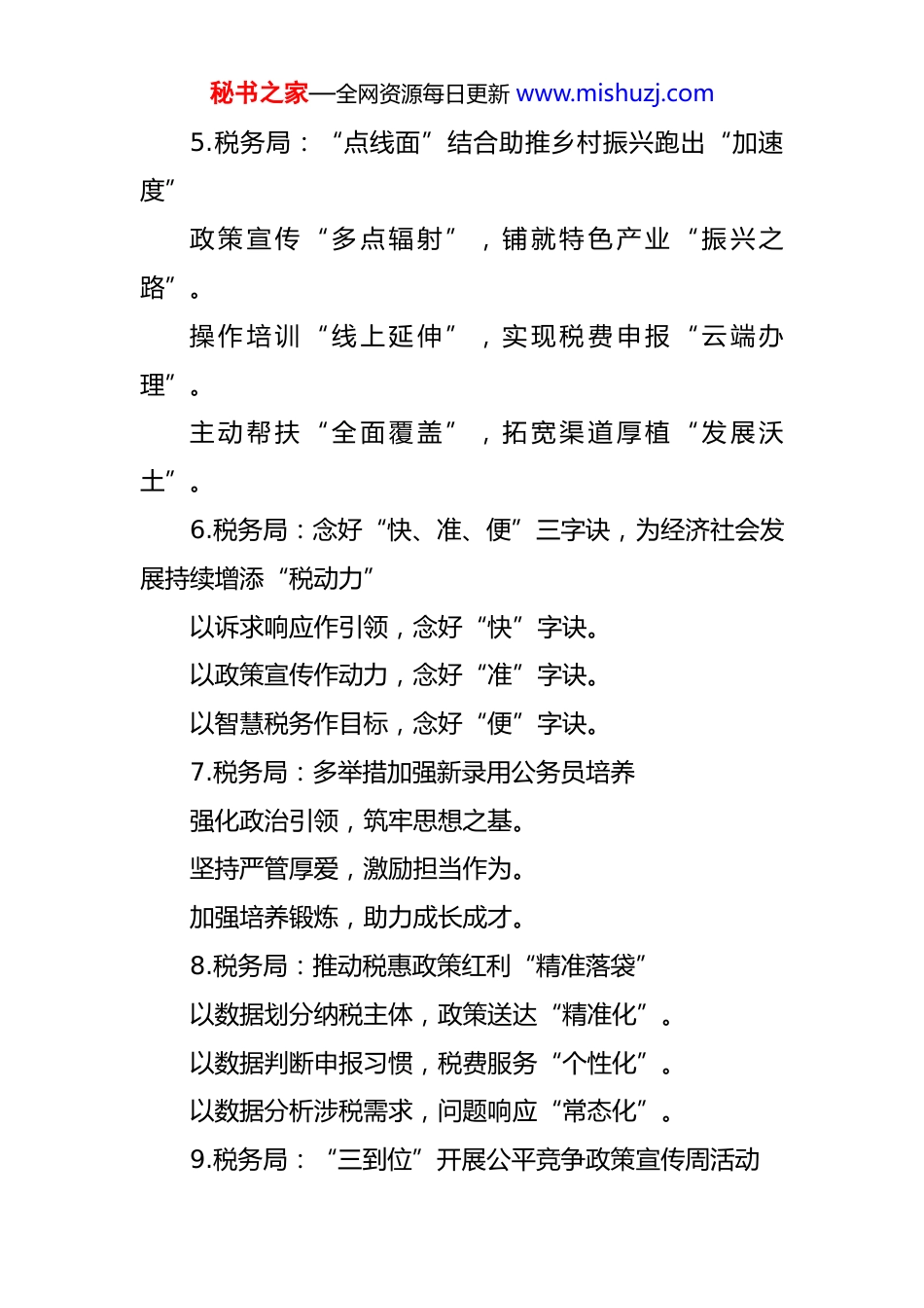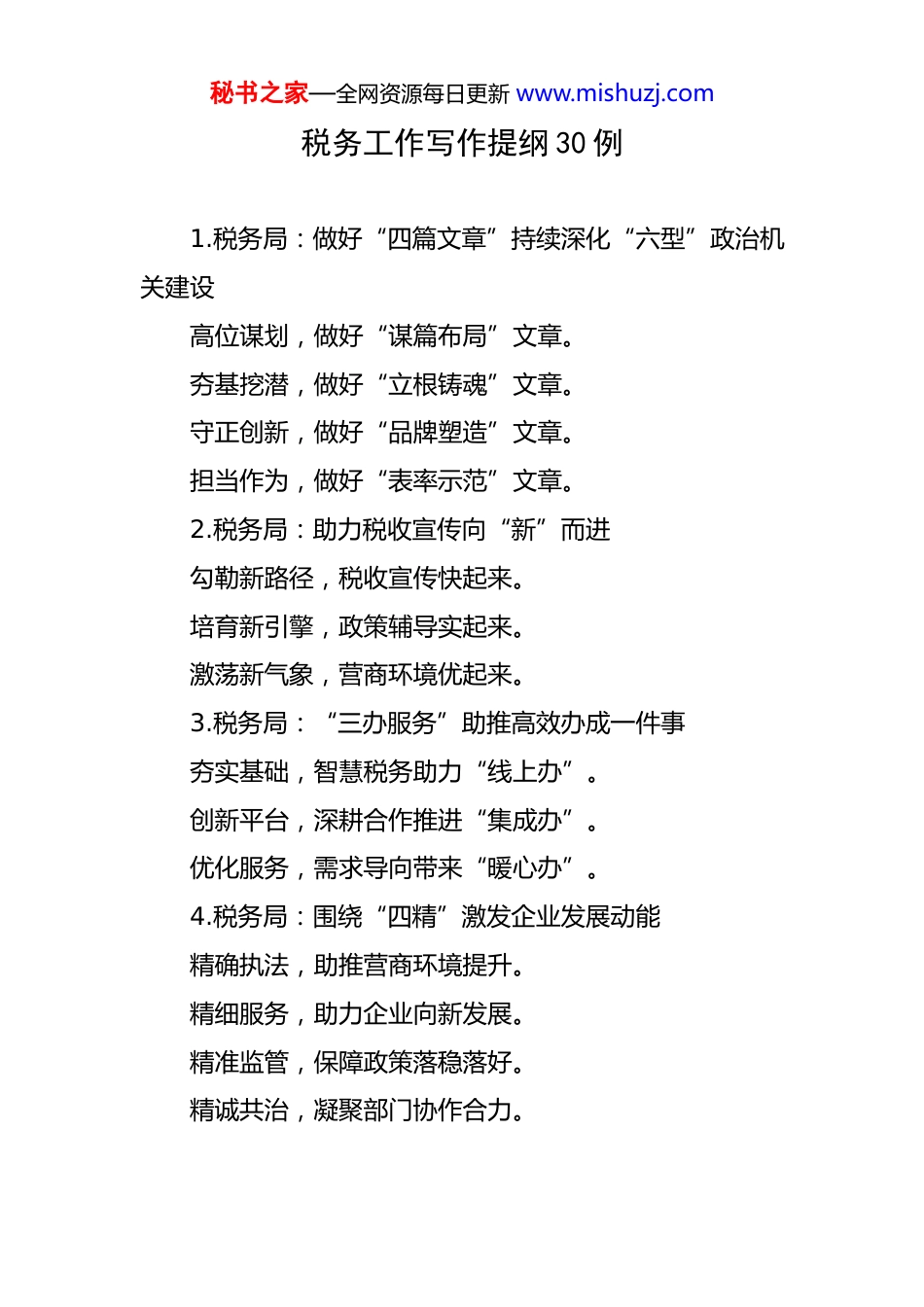 秘书之家—全网资源每日更新 www.mishuzj.com税务工作写作提纲 30 例 1.税务局:做好“四篇文章”持续深化“六型”政治机关建设高位谋划,做好“谋篇布局”文章。夯基挖潜,做好“立根铸魂”文章。守正创新,做好“品牌塑造”文章。担当作为,做好“表率示范”文章。2.税务局:助力税收宣传向“新”而进勾勒新路径,税收宣传快起来。培育新引擎,政策辅导实起来。激荡新气象,营商环境优起来。3.税务局:“三办服务”助推高效办成一件事夯实基础,智慧税务助力“线上办”。创新平台,深耕合作推进“集成办”。优化服务,需求导向带来“暖心办”。4.税务局:围绕“四精”激发企业发展动能精确执法,助推营商环境提升。精细服务,助力企业向新发展。精准监管,保障政策落稳落好。精诚共治,凝聚部门协作合力。秘书之家—全网资源每日更新 www.mishuzj.com5.税务局:“点线面”结合助推乡村振兴跑出“加速度”政策宣传“多点辐射”,铺就特色产业“振兴之路”。操作培训“线上延伸”,实现税费申报“云端办理”。主动帮扶“全面覆盖”,拓宽渠道厚植“发展沃土”。6.税务局:念好“快、准、便”三字诀,为经济社会发展持续增添“税动力”以诉求响应作引领,念好“快”字诀。以政策宣传作动力,念好“准”字诀。以智慧税务作目标,念好“便”字诀。7.税务局:多举措加强新录用公务员培养强化政治引领,筑牢思想之基。坚持严管厚爱,激励担当作为。加强培养锻炼,助力成长成才。8.税务局:推动税惠政策红利“精准落袋”以数据划分纳税主体,政策送达“精准化”。以数据判断申报习惯,税费服务“个性化”。以数据分析涉税需求,问题响应“常态化”。9.税务局:“三到位”开展公平竞争政策宣传周活动秘书之家—全网资源每日更新 www.mishuzj.com加强联动,安排部署落实到位。夯实基础,法律法规学习到位。营造氛围,普法宣传开展到位。10.税务局:西部大开发优惠政策清理工作取得实效打通“找问题”的路径。做实“抓整改”的措施。完善“立长远”的机制。11.税务局:“三点发力”助力新录用公务员成长成才筑牢理想信念,绘好政治底色。夯实赋能之基,提升内外素养。强化拓展锻炼,促进学以致用。12.税务局:精细服务助力出口企业“扬帆远航”“面对面”交流问需解难。“一对一”辅导退税政策。“点对点”提醒防范风险。13.税务局:三措并举筑牢法治基石周密部署,精心策划强保障。紧抓落实,精准普法显特色。创新载体,精耕细作提质效。14.税务局:细织安全防护网抓好年末安全工作细心做好用电安全工作。细心筑牢消防安全壁垒。秘书之家—全网资源每日更新 www.mishuzj.com细心强化公务用车管控。15.税务局:三举措推进个税汇算工作夯实汇算基础。强化政策宣传。精准提示提醒。16.税务局:“以周为章、以报促干”推动各项工作稳步推进借助线上渠道,建立高效沟通机制。契合组织绩效,推动工作提质增效。做好归纳整理,形成闭环管理链条。17.税务局:“三步法”积极备战执法资格考试高位统筹谋划,强化组织保障。创新学习方式,夯实学习基础。强化督考结合,提升备考质效。18.税务局:凝心聚力聚焦依法治税强化法治思维,筑牢依法治税思想根基。规范执法行为,着力推进法治政府建设。深化部门协作,形成税收共治工作合力。强化普法宣传,营造良好税收法治环境。19.税务局:“三个抓手”推动水资源税新政落地见效一是抓实宣传辅导,精准推送政策。二是抓细数据比对,强化部门协作。秘书之家—全网资源每日更新 www.mishuzj.com三是抓严风险防控,提升管理质效。20.税务局:做实“四个诉求”提升税费服务质效打通渠道听诉求。压实责任管诉求。线上线下解诉求。体验流程减诉求。21.税务局:“3+”举措助力青年发展型县域建设集成+靠前,帮助青年走稳创业第一步。高效+精准,解决青创企业“成长的烦恼”。按需+定制,助力青创企业健康壮大。22.税务局:念好“三字诀”学习宣传贯彻党的二十届三中全会精神念好“先”字诀,推动理论武装入脑入心。念好“细”字诀,推动工作举措落细落实。念好“干”字决,推动重点工作见行见效23.税务局:多措并举、纾困解难,为中小企业稳发展送上“...