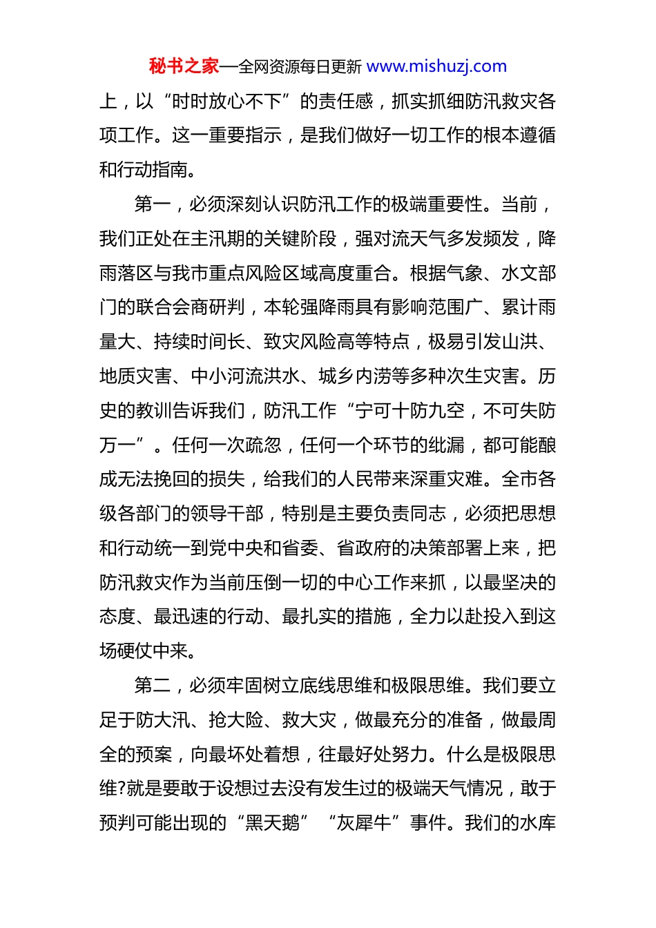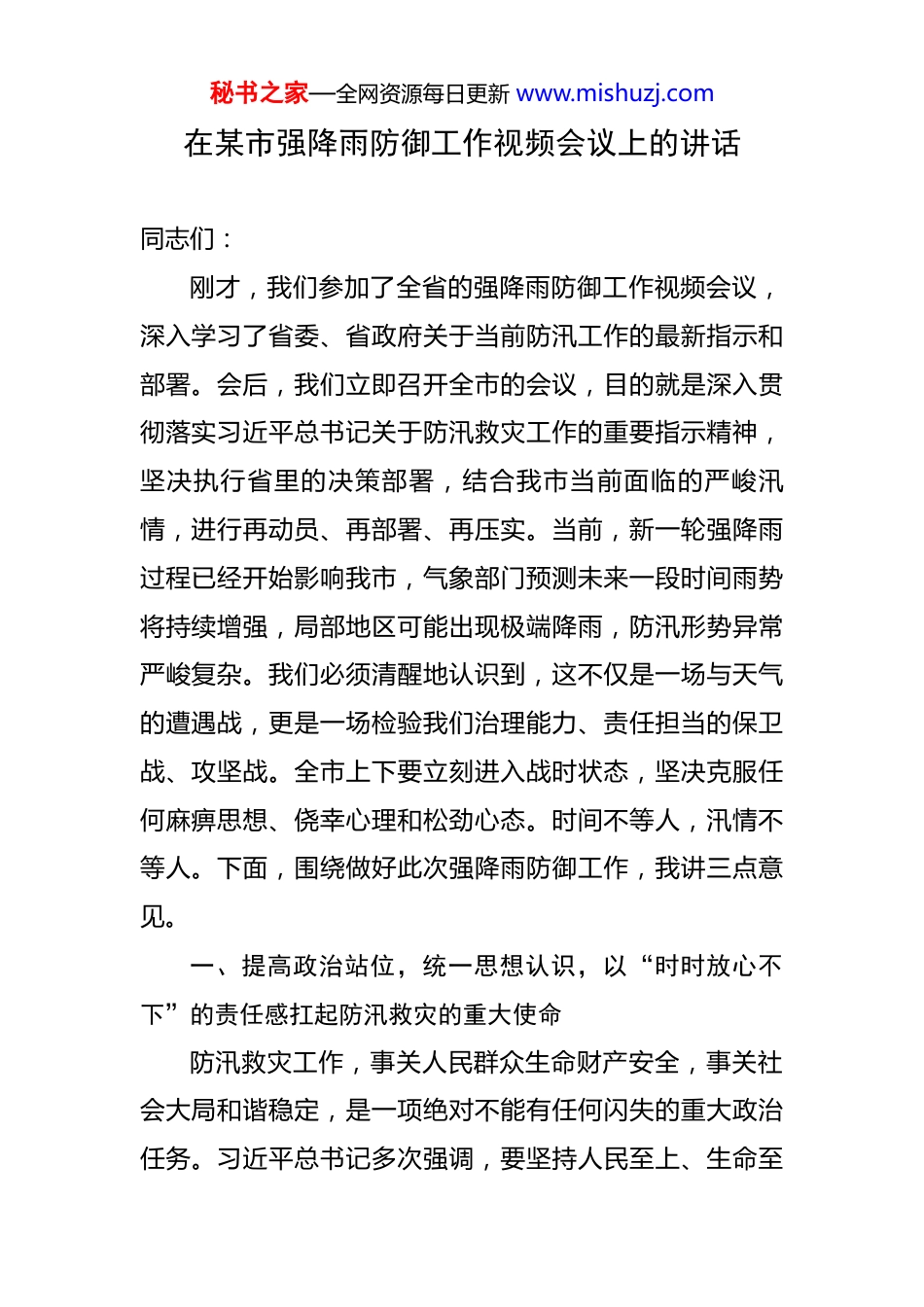 秘书之家—全网资源每日更新 www.mishuzj.com在某市强降雨防御工作视频会议上的讲话 同志们:刚才,我们参加了全省的强降雨防御工作视频会议,深入学习了省委、省政府关于当前防汛工作的最新指示和部署。会后,我们立即召开全市的会议,目的就是深入贯彻落实习近平总书记关于防汛救灾工作的重要指示精神,坚决执行省里的决策部署,结合我市当前面临的严峻汛情,进行再动员、再部署、再压实。当前,新一轮强降雨过程已经开始影响我市,气象部门预测未来一段时间雨势将持续增强,局部地区可能出现极端降雨,防汛形势异常严峻复杂。我们必须清醒地认识到,这不仅是一场与天气的遭遇战,更是一场检验我们治理能力、责任担当的保卫战、攻坚战。全市上下要立刻进入战时状态,坚决克服任何麻痹思想、侥幸心理和松劲心态。时间不等人,汛情不等人。下面,围绕做好此次强降雨防御工作,我讲三点意见。一、提高政治站位,统一思想认识,以“时时放心不下”的责任感扛起防汛救灾的重大使命防汛救灾工作,事关人民群众生命财产安全,事关社会大局和谐稳定,是一项绝对不能有任何闪失的重大政治任务。习近平总书记多次强调,要坚持人民至上、生命至秘书之家—全网资源每日更新 www.mishuzj.com上,以“时时放心不下”的责任感,抓实抓细防汛救灾各项工作。这一重要指示,是我们做好一切工作的根本遵循和行动指南。第一,必须深刻认识防汛工作的极端重要性。当前,我们正处在主汛期的关键阶段,强对流天气多发频发,降雨落区与我市重点风险区域高度重合。根据气象、水文部门的联合会商研判,本轮强降雨具有影响范围广、累计雨量大、持续时间长、致灾风险高等特点,极易引发山洪、地质灾害、中小河流洪水、城乡内涝等多种次生灾害。历史的教训告诉我们,防汛工作“宁可十防九空,不可失防万一”。任何一次疏忽,任何一个环节的纰漏,都可能酿成无法挽回的损失,给我们的人民带来深重灾难。全市各级各部门的领导干部,特别是主要负责同志,必须把思想和行动统一到党中央和省委、省政府的决策部署上来,把防汛救灾作为当前压倒一切的中心工作来抓,以最坚决的态度、最迅速的行动、最扎实的措施,全力以赴投入到这场硬仗中来。第二,必须牢固树立底线思维和极限思维。我们要立足于防大汛、抢大险、救大灾,做最充分的准备,做最周全的预案,向最坏处着想,往最好处努力。什么是极限思维?就是要敢于设想过去没有发生过的极端天气情况,敢于预判可能出现的“黑天鹅”“灰犀牛”事件。我们的水库秘书之家—全网资源每日更新 www.mishuzj.com能不能扛得住超历史标准的洪水?我们的堤防在长时间高水位浸泡下会不会出险?我们的城市排涝系统在遭遇短时超强降雨时会不会瘫痪?我们的应急救援力量在多点并发灾情时够不够用?对这些问题,我们必须心中有数,提前推演,做好万全准备。要坚决守住“不死人、少损失”这条底线目标。这六个字,重于泰山,是我们一切工作的出发点和落脚点。所有工作部署、资源调配、力量组织,都必须紧紧围绕这个核心目标来展开。第三,必须全面激活“时时放心不下”的责任体系。责任感不是一句口号,而是具体的行动和制度保障。全市各级领导干部要切实把责任扛在肩上、抓在手上,深入一线、靠前指挥,亲自检查关键部位,亲自协调解决难题。各级三防指挥部要发挥好牵头抓总作用,确保指挥体系高效运转,政令畅通无阻。各成员单位要闻令而动、听令而行,摒弃部门壁垒,强化协同作战,形成全市“一盘棋”的强大合力。我们要将责任层层压实到乡镇(街道)、到村(社区)、到具体网格员、到每一个风险点的监测人,确保每一个环节都有人抓、有人管、有人负责,真正织密织牢覆盖全市的防汛救灾责任网。二、聚焦关键环节,突出防御重点,以精准化科学化举措提升防汛救灾的实战效能防汛工作千头万绪,必须抓住主要矛盾和矛盾的主要秘书之家—全网资源每日更新 www.mishuzj.com方面,精准施策,靶向发力,才能在复杂局面中掌握主动权。第一,把人员转移避险作为重中之重,坚决果断落实刚性约束。保障人民生命安全,最直接、最有效的手段就是提前转移、果断避险。在这项工作上,决不能有丝毫...