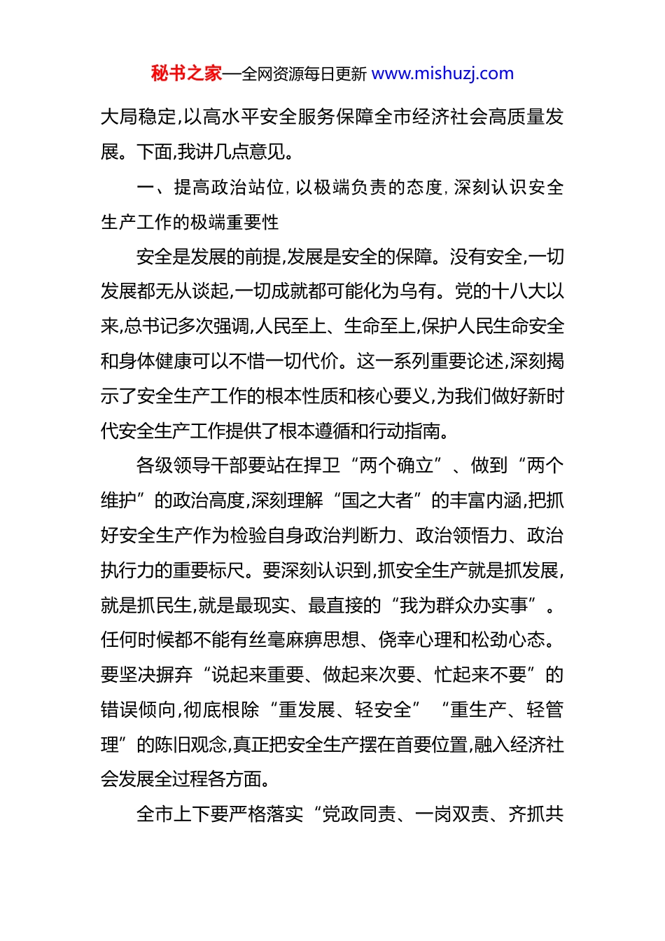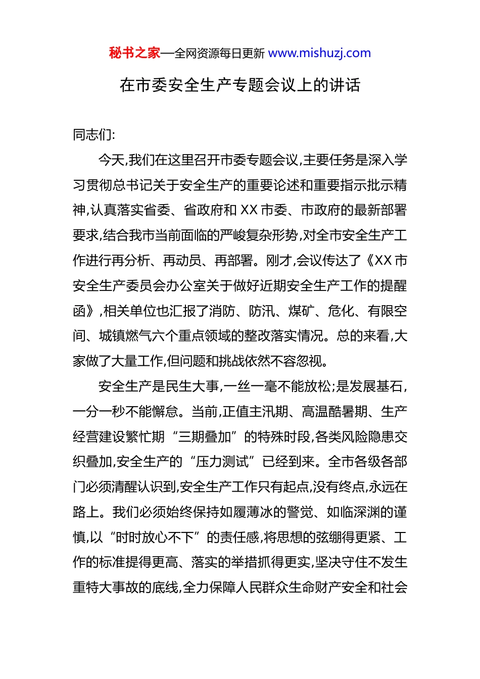 秘书之家—全网资源每日更新 www.mishuzj.com在市委安全生产专题会议上的讲话 同志们:今天,我们在这里召开市委专题会议,主要任务是深入学习贯彻总书记关于安全生产的重要论述和重要指示批示精神,认真落实省委、省政府和 XX 市委、市政府的最新部署要求,结合我市当前面临的严峻复杂形势,对全市安全生产工作进行再分析、再动员、再部署。刚才,会议传达了《XX 市安全生产委员会办公室关于做好近期安全生产工作的提醒函》,相关单位也汇报了消防、防汛、煤矿、危化、有限空间、城镇燃气六个重点领域的整改落实情况。总的来看,大家做了大量工作,但问题和挑战依然不容忽视。安全生产是民生大事,一丝一毫不能放松;是发展基石,一分一秒不能懈怠。当前,正值主汛期、高温酷暑期、生产经营建设繁忙期“三期叠加”的特殊时段,各类风险隐患交织叠加,安全生产的“压力测试”已经到来。全市各级各部门必须清醒认识到,安全生产工作只有起点,没有终点,永远在路上。我们必须始终保持如履薄冰的警觉、如临深渊的谨慎,以“时时放心不下”的责任感,将思想的弦绷得更紧、工作的标准提得更高、落实的举措抓得更实,坚决守住不发生重特大事故的底线,全力保障人民群众生命财产安全和社会秘书之家—全网资源每日更新 www.mishuzj.com大局稳定,以高水平安全服务保障全市经济社会高质量发展。下面,我讲几点意见。一、提高政治站位,以极端负责的态度,深刻认识安全生产工作的极端重要性安全是发展的前提,发展是安全的保障。没有安全,一切发展都无从谈起,一切成就都可能化为乌有。党的十八大以来,总书记多次强调,人民至上、生命至上,保护人民生命安全和身体健康可以不惜一切代价。这一系列重要论述,深刻揭示了安全生产工作的根本性质和核心要义,为我们做好新时代安全生产工作提供了根本遵循和行动指南。各级领导干部要站在捍卫“两个确立”、做到“两个维护”的政治高度,深刻理解“国之大者”的丰富内涵,把抓好安全生产作为检验自身政治判断力、政治领悟力、政治执行力的重要标尺。要深刻认识到,抓安全生产就是抓发展,就是抓民生,就是最现实、最直接的“我为群众办实事”。任何时候都不能有丝毫麻痹思想、侥幸心理和松劲心态。要坚决摒弃“说起来重要、做起来次要、忙起来不要”的错误倾向,彻底根除“重发展、轻安全”“重生产、轻管理”的陈旧观念,真正把安全生产摆在首要位置,融入经济社会发展全过程各方面。全市上下要严格落实“党政同责、一岗双责、齐抓共秘书之家—全网资源每日更新 www.mishuzj.com管、失职追责”和“三管三必须”的要求,构建起横向到边、纵向到底、无缝衔接的责任体系。各级党委政府要切实担负起属地领导责任,党政主要负责同志要亲力亲为、靠前指挥,亲自研究部署、亲自督促检查。各行业主管部门要严格履行监管责任,将安全生产标准和要求贯穿于行业规划、产业政策、法规标准、行政许可的全过程。各生产经营单位必须全面落实主体责任,做到安全投入到位、安全培训到位、基础管理到位、应急救援到位。我们要通过严密的责任链条,层层传导压力,确保每一寸阵地都有人守、每一项工作都有人抓、每一个环节都有人管,形成全社会齐抓共管的强大合力。二、聚焦重点领域,以精准有力的举措,全面排查整治各类风险隐患当前,我市安全生产基础仍然薄弱,部分领域风险突出。我们必须坚持问题导向、目标导向、结果导向,紧盯关键环节和要害部位,下大力气、用真功夫,逐一攻坚克难,确保隐患动态清零、风险有效管控。第一,必须把煤矿安全作为重中之重来抓,持续提升本质安全水平。煤炭产业是我市的支柱产业,煤矿安全更是安全生产工作的“牛鼻子”,任何时候都不能掉以轻心。要深刻汲取近年来国内外煤矿事故的沉痛教训,以“零容忍”的态秘书之家—全网资源每日更新 www.mishuzj.com度推进常态化治理。要持续深化和创新专家会诊机制不能满足于形式上的“请进来”,更要注重效果上的“查出来、改到位”。市应急管理局要牵头制定并完善《XX 市煤矿安全生产专家会诊工作规程实施细则》,明确会诊频次、流程、标准和问责机制。我提议,从今年下半年开始,专家会诊要实现对全市所有生产矿井每季度至少一轮的全覆盖,对高风险...