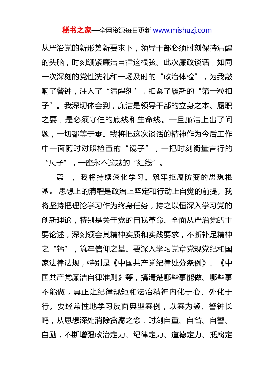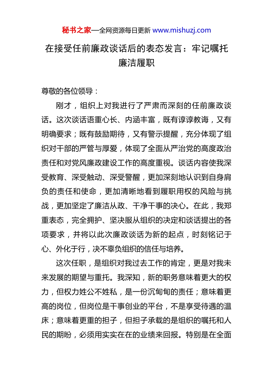 秘书之家—全网资源每日更新 www.mishuzj.com在接受任前廉政谈话后的表态发言:牢记嘱托廉洁履职 尊敬的各位领导:刚才,组织上对我进行了严肃而深刻的任前廉政谈话。这次谈话语重心长、内涵丰富,既有谆谆教诲,又有明确要求;既有鼓励期待,又有警示提醒,充分体现了组织对干部的严管与厚爱,体现了全面从严治党的高度政治责任和对党风廉政建设工作的高度重视。谈话内容使我深受教育、深受触动、深受警醒,更加深刻地认识到自身肩负的责任和使命,更加清晰地看到履职用权的风险与挑战,更加坚定了廉洁从政、干净干事的决心。在此,我郑重表态,完全拥护、坚决服从组织的决定和谈话提出的各项要求,并将以此次廉政谈话为新的起点,时刻铭记于心、外化于行,决不辜负组织的信任与培养。这次任职,是组织对我过去工作的肯定,更是对我未来发展的期望与重托。我深知,新的职务意味着更大的权力,但权力姓公不姓私,是一份沉甸甸的责任;意味着更高的岗位,但岗位是干事创业的平台,不是享受待遇的温床;意味着更重的担子,但担子承载的是组织的嘱托和人民的期盼,必须用实实在在的业绩来回报。特别是在全面秘书之家—全网资源每日更新 www.mishuzj.com从严治党的新形势新要求下,领导干部必须时刻保持清醒的头脑,时刻绷紧廉洁自律这根弦。此次廉政谈话,如同一次深刻的党性洗礼和一场及时的“政治体检”,为我敲响了警钟,注入了“清醒剂”,扣紧了履新的“第一粒扣子”。我深切体会到,廉洁是领导干部的立身之本、履职之要,是必须守住的底线和生命线。一旦廉洁上出了问题,一切都等于零。我将把这次谈话的精神作为今后工作中一面随时对照检查的“镜子”,一把时刻衡量言行的“尺子”,一座永不逾越的“红线”。第一,我将持续深化学习,筑牢拒腐防变的思想根基。 思想上的清醒是政治上坚定和行动上自觉的前提。我将坚持把理论学习作为终身任务,持之以恒深入学习党的创新理论,特别是关于党的自我革命、全面从严治党的重要论述,深刻领会其精神实质和实践要求,不断补足精神之“钙”,筑牢信仰之基。要深入学习党章党规党纪和国家法律法规,特别是《中国共产党纪律处分条例》、《中国共产党廉洁自律准则》等,搞清楚哪些事能做、哪些事不能做,真正让纪律规矩和法治精神内化于心、外化于行。要经常性地学习反面典型案例,以案为鉴、警钟长鸣,从思想深处消除贪腐之念,时刻自重、自省、自警、自励,不断增强政治定力、纪律定力、道德定力、抵腐定秘书之家—全网资源每日更新 www.mishuzj.com力,从源头之上筑牢拒腐防变的坚固堤坝,确保在任何时候、任何情况下都能稳得住心神、管得住行为、守得住清白。第二,我将严守纪律规矩,恪清正廉洁的为政底线。 纪律是带电的高压线,规矩是办事的基准线。我将把党的政治纪律和政治规矩摆在首位,深刻领悟“两个确立”的决定性意义,坚决做到“两个维护”,在思想上政治上行动上始终同党中央保持高度一致,确保党的路线方针政策不折不扣得到贯彻执行。要严格执行民主集中制,自觉维护班子团结,决不搞个人专断、自行其是。要严格落实中央八项规定及其实施细则精神,时刻警惕“四风”隐形变异问题,从小事小节做起,慎独、慎初、慎微、慎友,净化自己的社交圈、生活圈、朋友圈,管住手、管住嘴、管住腿,坚决抵制各种诱惑和歪风邪气。要严格遵守廉洁从政各项规定,正确对待和行使手中的权力,坚持依法用权、秉公用权、廉洁用权,决不把权力变成谋取私利的工具。要主动将自己置于组织和群众的监督之下,习惯在受监督和约束的环境中工作生活,真诚欢迎监督,主动接受监督,让权力在阳光下运行。第三,我将认真履行责任,扛起管党治党的政治担当。 作为新任领导干部,不仅自身要廉,还要担负起管党秘书之家—全网资源每日更新 www.mishuzj.com治党的政治责任。我将坚决履行“一岗双责”,在抓好业务工作的同时,切实抓好分管领域的党风廉政建设工作。要坚持严管就是厚爱,敢抓敢管、严抓严管,加强对分管部门党员干部的日常教育、监督和管理,经常开展谈心谈话,及时提醒纠正苗头性、倾向性问题,抓早抓小、防微杜渐。要旗帜鲜明地反对...