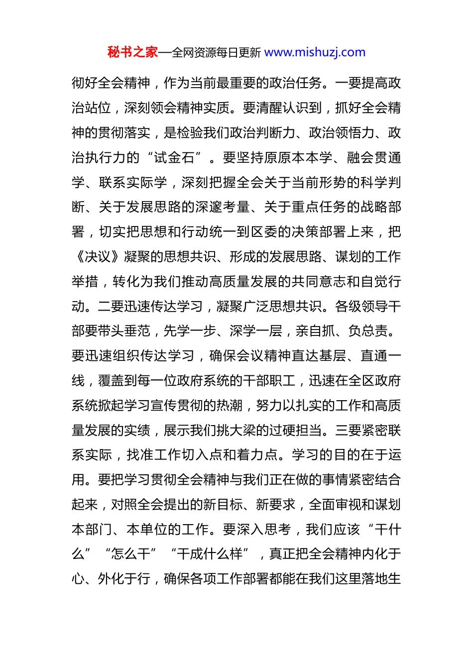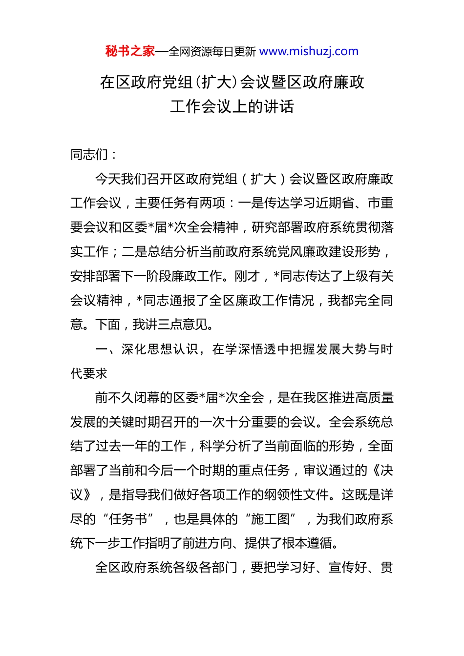 秘书之家—全网资源每日更新 www.mishuzj.com在区政府党组(扩大)会议暨区政府廉政工作会议上的讲话 同志们:今天我们召开区政府党组(扩大)会议暨区政府廉政工作会议,主要任务有两项:一是传达学习近期省、市重要会议和区委*届*次全会精神,研究部署政府系统贯彻落实工作;二是总结分析当前政府系统党风廉政建设形势,安排部署下一阶段廉政工作。刚才,*同志传达了上级有关会议精神,*同志通报了全区廉政工作情况,我都完全同意。下面,我讲三点意见。一、深化思想认识,在学深悟透中把握发展大势与时代要求前不久闭幕的区委*届*次全会,是在我区推进高质量发展的关键时期召开的一次十分重要的会议。全会系统总结了过去一年的工作,科学分析了当前面临的形势,全面部署了当前和今后一个时期的重点任务,审议通过的《决议》,是指导我们做好各项工作的纲领性文件。这既是详尽的“任务书”,也是具体的“施工图”,为我们政府系统下一步工作指明了前进方向、提供了根本遵循。全区政府系统各级各部门,要把学习好、宣传好、贯秘书之家—全网资源每日更新 www.mishuzj.com彻好全会精神,作为当前最重要的政治任务。一要提高政治站位,深刻领会精神实质。要清醒认识到,抓好全会精神的贯彻落实,是检验我们政治判断力、政治领悟力、政治执行力的“试金石”。要坚持原原本本学、融会贯通学、联系实际学,深刻把握全会关于当前形势的科学判断、关于发展思路的深邃考量、关于重点任务的战略部署,切实把思想和行动统一到区委的决策部署上来,把《决议》凝聚的思想共识、形成的发展思路、谋划的工作举措,转化为我们推动高质量发展的共同意志和自觉行动。二要迅速传达学习,凝聚广泛思想共识。各级领导干部要带头垂范,先学一步、深学一层,亲自抓、负总责。要迅速组织传达学习,确保会议精神直达基层、直通一线,覆盖到每一位政府系统的干部职工,迅速在全区政府系统掀起学习宣传贯彻的热潮,努力以扎实的工作和高质量发展的实绩,展示我们挑大梁的过硬担当。三要紧密联系实际,找准工作切入点和着力点。学习的目的在于运用。要把学习贯彻全会精神与我们正在做的事情紧密结合起来,对照全会提出的新目标、新要求,全面审视和谋划本部门、本单位的工作。要深入思考,我们应该“干什么”“怎么干”“干成什么样”,真正把全会精神内化于心、外化于行,确保各项工作部署都能在我们这里落地生秘书之家—全网资源每日更新 www.mishuzj.com根、开花结果。二、聚焦核心任务,在攻坚克难中开创高质量发展新局面今年是实现“十五五”规划目标的关键一年,做好经济社会发展各项工作意义重大。我们要牢固树立“不进则退、慢进亦退”的危机感和紧迫感,以“拼”的意识、“抢”的状态、“实”的作风,牢牢掌握发展主动权,以自身工作的确定性有效应对形势变化的不确定性。(一)坚定发展信心,巩固稳中向好态势。今年以来,面对复杂严峻的外部环境和艰巨繁重的改革发展稳定任务,全区上下顶压前行、克难奋进,经济运行持续回升向好。根据多个地区发布的 2024 年度经济运行报告分析,我们可以看到相似的增长韧性与发展潜力。综合来看,我们区在 2024 年也取得了来之不易的成绩:全区地区生产总值预计突破 1800 亿元,同比增长 6.1%;一般公共预算收入达到 155 亿元,增长 7.2%;固定资产投资总额完成超过 800 亿元,实现了量的合理增长和质的有效提升。特别是城镇新增就业人数超过 3.5 万人,民生保障得到有力加强。这些成绩的取得,是全区人民共同奋斗的结果,也为我们应对挑战、继续前进奠定了坚实基础。在肯定成绩的同时,我们也要正视发展中存在的短板和弱项,比如城秘书之家—全网资源每日更新 www.mishuzj.com乡、区域、收入“三大差距”依然存在,产业结构优化升级的任务还很重,部分重点项目的推进速度还需加快,必须采取更加有力的措施加以解决。(二)突出工作重点,全力推动“三大突破”。区委全会明确提出要统筹推进“三大突破”,这是我们当前工作的重中之重,必须集中力量、精准发力。一要全力在发展新质生产力上实现新突破。这是推动高质量发展的核心引擎。我们要加...