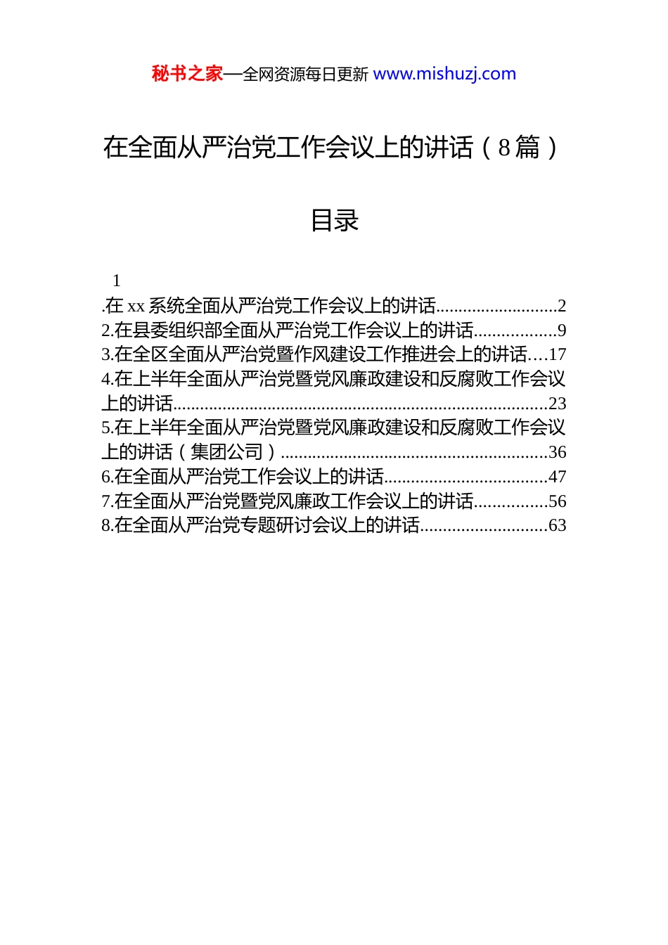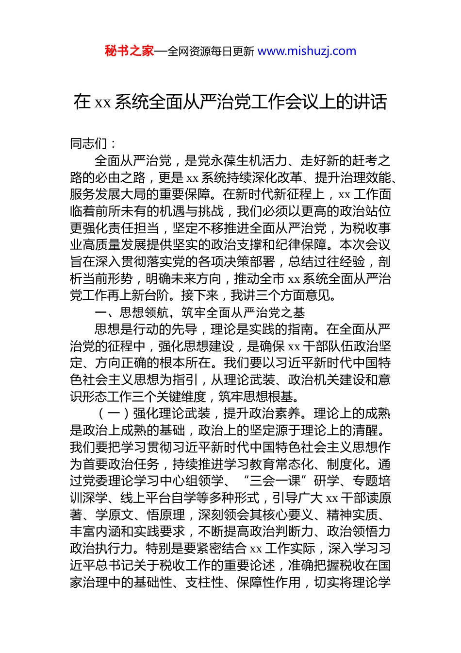 秘书之家—全网资源每日更新 www.mishuzj.com在全面从严治党工作会议上的讲话(8 篇)目录1.在 xx 系统全面从严治党工作会议上的讲话...........................22.在县委组织部全面从严治党工作会议上的讲话..................93.在全区全面从严治党暨作风建设工作推进会上的讲话....174.在上半年全面从严治党暨党风廉政建设和反腐败工作会议上的讲话...................................................................................235.在上半年全面从严治党暨党风廉政建设和反腐败工作会议上的讲话(集团公司)...........................................................366.在全面从严治党工作会议上的讲话....................................477.在全面从严治党暨党风廉政工作会议上的讲话................568.在全面从严治党专题研讨会议上的讲话............................63秘书之家—全网资源每日更新 www.mishuzj.com在 xx 系统全面从严治党工作会议上的讲话同志们:全面从严治党,是党永葆生机活力、走好新的赶考之路的必由之路,更是 xx 系统持续深化改革、提升治理效能、服务发展大局的重要保障。在新时代新征程上,xx 工作面临着前所未有的机遇与挑战,我们必须以更高的政治站位更强化责任担当,坚定不移推进全面从严治党,为税收事业高质量发展提供坚实的政治支撑和纪律保障。本次会议旨在深入贯彻落实党的各项决策部署,总结过往经验,剖析当前形势,明确未来方向,推动全市 xx 系统全面从严治党工作再上新台阶。接下来,我讲三个方面意见。一、思想领航,筑牢全面从严治党之基思想是行动的先导,理论是实践的指南。在全面从严治党的征程中,强化思想建设,是确保 xx 干部队伍政治坚定、方向正确的根本所在。我们要以习近平新时代中国特色社会主义思想为指引,从理论武装、政治机关建设和意识形态工作三个关键维度,筑牢思想根基。(一)强化理论武装,提升政治素养。理论上的成熟是政治上成熟的基础,政治上的坚定源于理论上的清醒。我们要把学习贯彻习近平新时代中国特色社会主义思想作为首要政治任务,持续推进学习教育常态化、制度化。通过党委理论学习中心组领学、“三会一课”研学、专题培训深学、线上平台自学等多种形式,引导广大 xx 干部读原著、学原文、悟原理,深刻领会其核心要义、精神实质、丰富内涵和实践要求,不断提高政治判断力、政治领悟力政治执行力。特别是要紧密结合 xx 工作实际,深入学习习近平总书记关于税收工作的重要论述,准确把握税收在国家治理中的基础性、支柱性、保障性作用,切实将理论学秘书之家—全网资源每日更新 www.mishuzj.com习成果转化为推动税收工作的强大动力。今年,我们要组织开展系列专题学习研讨活动,邀请专家学者进行深度解读,鼓励干部职工分享学习心得,确保理论学习入脑入心走深走实。(二)突出政治引领,建强政治机关。xx 机关首先是政治机关,旗帜鲜明讲政治是第一要求。我们要始终把党的政治建设摆在首位,坚决捍卫“两个确立”,增强“四个意识”、坚定“四个自信”、做到“两个维护”。严格执行新形势下党内政治生活的若干准则,认真落实“三会一课”、民主生活会、组织生活会、民主评议党员等制度用好批评和自我批评武器,增强党内政治生活的政治性、时代性、原则性、战斗性。加强对党忠诚教育,引导 xx 干部不断强化党的意识、党员意识,始终在政治立场、政治方向、政治原则、政治道路上同以习近平同志为核心的党中央保持高度一致。同时,要将政治标准贯穿于 xx 干部选拔任用、考核评价全过程,选拔任用忠诚干净担当的高素质专业化干部,确保 xx 系统各级领导班子和干部队伍政治过硬。(三)坚守舆论阵地,强化意识形态。意识形态工作是党的一项极端重要的工作,关乎国家安全、社会稳定和民族凝聚力。xx 系统作为国家重要经济职能部门,肩负着宣传税收政策、展示 xx 形象、引导社会舆论的重要职责。我们要切实增强意识形态工作的责任感和使命感,严格落实意识形态工作责任制,加强对 xx 网站、微信公众号、微博等各类意识形态阵地的管理,确保发布的信...