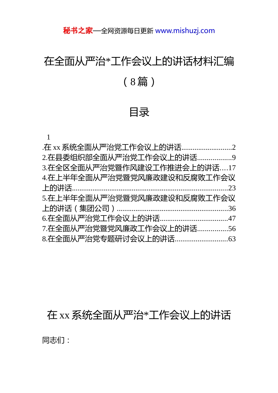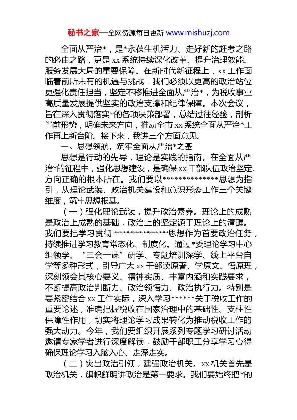 秘书之家—全网资源每日更新 www.mishuzj.com在全面从严治*工作会议上的讲话材料汇编(8 篇)目录1.在 xx 系统全面从严治党工作会议上的讲话...........................22.在县委组织部全面从严治党工作会议上的讲话..................93.在全区全面从严治党暨作风建设工作推进会上的讲话....174.在上半年全面从严治党暨党风廉政建设和反腐败工作会议上的讲话...................................................................................235.在上半年全面从严治党暨党风廉政建设和反腐败工作会议上的讲话(集团公司)...........................................................366.在全面从严治党工作会议上的讲话....................................477.在全面从严治党暨党风廉政工作会议上的讲话................568.在全面从严治党专题研讨会议上的讲话............................63在 xx 系统全面从严治*工作会议上的讲话同志们:秘书之家—全网资源每日更新 www.mishuzj.com全面从严治*,是*永葆生机活力、走好新的赶考之路的必由之路,更是 xx 系统持续深化改革、提升治理效能、服务发展大局的重要保障。在新时代新征程上,xx 工作面临着前所未有的机遇与挑战,我们必须以更高的政治站位更强化责任担当,坚定不移推进全面从严治*,为税收事业高质量发展提供坚实的政治支撑和纪律保障。本次会议,旨在深入贯彻落实*的各项决策部署,总结过往经验,剖析当前形势,明确未来方向,推动全市 xx 系统全面从严治*工作再上新台阶。接下来,我讲三个方面意见。一、思想领航,筑牢全面从严治*之基思想是行动的先导,理论是实践的指南。在全面从严治*的征程中,强化思想建设,是确保 xx 干部队伍政治坚定、方向正确的根本所在。我们要以**************思想为指引,从理论武装、政治机关建设和意识形态工作三个关键维度,筑牢思想根基。(一)强化理论武装,提升政治素养。理论上的成熟是政治上成熟的基础,政治上的坚定源于理论上的清醒。我们要把学习贯彻**************思想作为首要政治任务,持续推进学习教育常态化、制度化。通过*委理论学习中心组领学、“三会一课”研学、专题培训深学、线上平台自学等多种形式,引导广大 xx 干部读原著、学原文、悟原理,深刻领会其核心要义、精神实质、丰富内涵和实践要求,不断提高政治判断力、政治领悟力、政治执行力。特别是要紧密结合 xx 工作实际,深入学习******关于税收工作的重要论述,准确把握税收在国家治理中的基础性、支柱性保障性作用,切实将理论学习成果转化为推动税收工作的强大动力。今年,我们要组织开展系列专题学习研讨活动邀请专家学者进行深度解读,鼓励干部职工分享学习心得确保理论学习入脑入心、走深走实。(二)突出政治引领,建强政治机关。xx 机关首先是政治机关,旗帜鲜明讲政治是第一要求。我们要始终把*的秘书之家—全网资源每日更新 www.mishuzj.com政治建设摆在首位,坚决捍卫“两个确立”,增强“四个意识”、坚定“四个自信”、做到“两个维护”。严格执行新形势下*内政治生活的若干准则,认真落实“三会一课”、民主生活会、组织生活会、民主评议*员等制度,用好批评和自我批评武器,增强*内政治生活的政治性、时代性、原则性、战斗性。加强对*忠诚教育,引导 xx 干部不断强化*的意识、*员意识,始终在政治立场、政治方向、政治原则、政治道路上同以***同志为核心的*中央保持高度一致。同时,要将政治标准贯穿于 xx 干部选拔任用、考核评价全过程,选拔任用忠诚干净担当的高素质专业化干部确保 xx 系统各级领导班子和干部队伍政治过硬。(三)坚守舆论阵地,强化意识形态。意识形态工作是*的一项极端重要的工作,关乎国家安全、社会稳定和民族凝聚力。xx 系统作为国家重要经济职能部门,肩负着宣传税收政策、展示 xx 形象、引导社会舆论的重要职责。我们要切实增强意识形态工作的责任感和使命感,严格落实意识形态工作责任制,加强对 xx 网站、微信公众号、微博等各类意识形态阵地的管理,确保发布的信息内容准确、导向正确。加强舆情监测和分析研判,及...