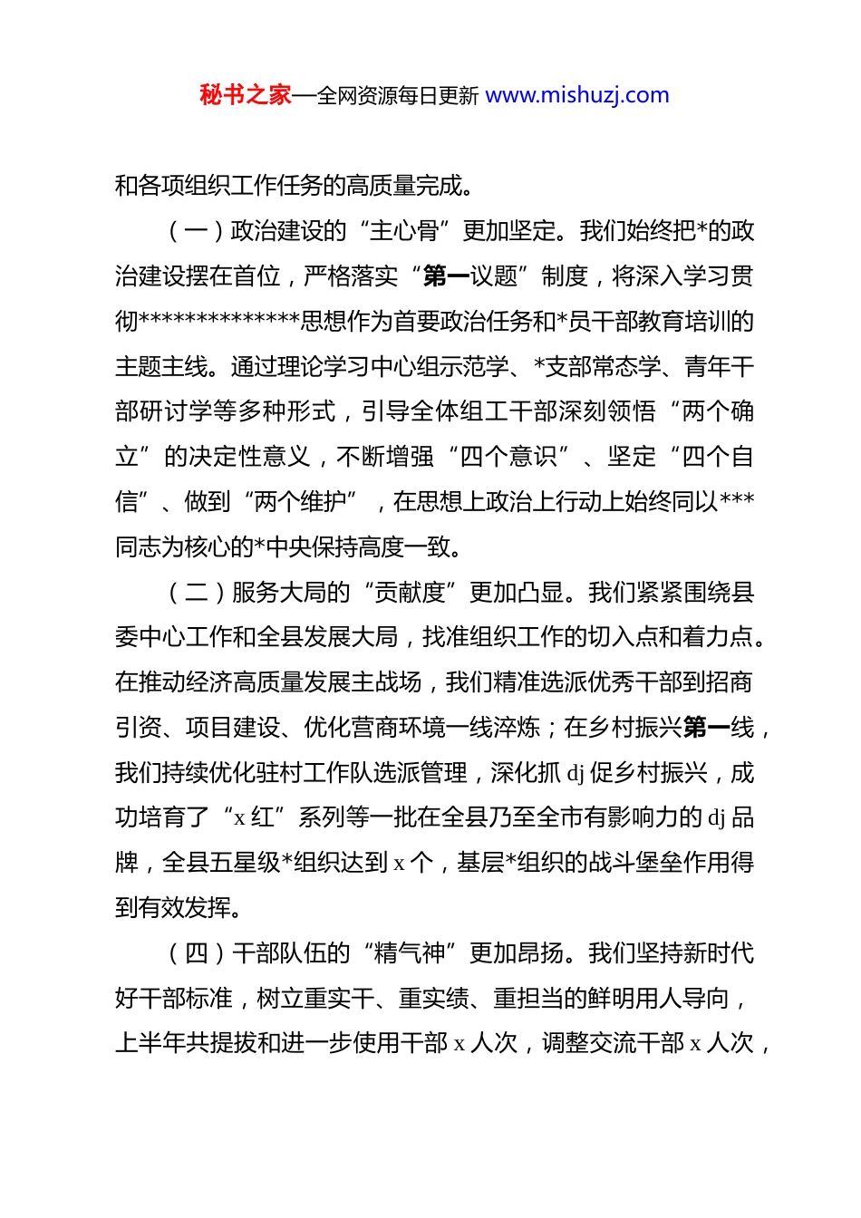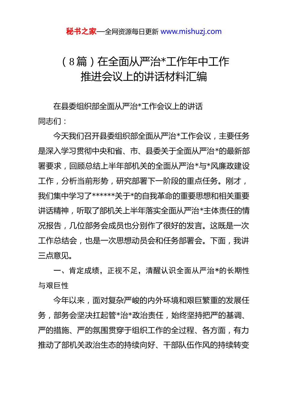 秘书之家—全网资源每日更新 www.mishuzj.com(8 篇)在全面从严治*工作年中工作推进会议上的讲话材料汇编在县委组织部全面从严治*工作会议上的讲话同志们:今天我们召开县委组织部全面从严治*工作会议,主要任务是深入学习贯彻中央和省、市、县委关于全面从严治*的最新部署要求,回顾总结上半年部机关的全面从严治*与*风廉政建设工作,分析当前形势,研究部署下一阶段的重点任务。刚才,我们集中学习了******关于*的自我革命的重要思想和相关重要讲话精神,听取了部机关上半年落实全面从严治*主体责任的情况报告,几位部务会成员也分别作了很好的发言。这既是一次工作总结会,也是一次思想动员会和任务部署会。下面,我讲三点意见。一、肯定成绩,正视不足,清醒认识全面从严治*的长期性与艰巨性今年以来,面对复杂严峻的内外环境和艰巨繁重的发展任务,部务会坚决扛起管*治*政治责任,始终坚持把严的基调、严的措施、严的氛围贯穿于组织工作的全过程、各方面,有力推动了部机关政治生态的持续向好、干部队伍作风的持续转变秘书之家—全网资源每日更新 www.mishuzj.com和各项组织工作任务的高质量完成。(一)政治建设的“主心骨”更加坚定。我们始终把*的政治建设摆在首位,严格落实“第一议题”制度,将深入学习贯彻**************思想作为首要政治任务和*员干部教育培训的主题主线。通过理论学习中心组示范学、*支部常态学、青年干部研讨学等多种形式,引导全体组工干部深刻领悟“两个确立”的决定性意义,不断增强“四个意识”、坚定“四个自信”、做到“两个维护”,在思想上政治上行动上始终同以***同志为核心的*中央保持高度一致。(二)服务大局的“贡献度”更加凸显。我们紧紧围绕县委中心工作和全县发展大局,找准组织工作的切入点和着力点。在推动经济高质量发展主战场,我们精准选派优秀干部到招商引资、项目建设、优化营商环境一线淬炼;在乡村振兴第一线,我们持续优化驻村工作队选派管理,深化抓 dj 促乡村振兴,成功培育了“x 红”系列等一批在全县乃至全市有影响力的 dj 品牌,全县五星级*组织达到 x 个,基层*组织的战斗堡垒作用得到有效发挥。(四)干部队伍的“精气神”更加昂扬。我们坚持新时代好干部标准,树立重实干、重实绩、重担当的鲜明用人导向,上半年共提拔和进一步使用干部 x 人次,调整交流干部 x 人次,秘书之家—全网资源每日更新 www.mishuzj.com干部队伍的结构和活力得到持续优化。同时,我们不断拧紧干部全方位管理和经常性监督的责任链条,通过谈心谈话、日常考核、专项督查等方式,推动干部监督管理严在日常、抓在经常。在人才工作方面,我们创新实施“x 英才”计划,建成“x人才驿站”,柔性引进高层次人才 x 名,为我县产业升级和科技创新注入了新的动能。(五)自身建设的“免疫力”更加强化。部务会带头履行主体责任,全体组工干部严格遵守*的政治纪律和政治规矩,机关的政治生态持续巩固提升。我们扎实推进学习教育后续工作,确保善始善终、善作善成。我们积极支持驻部纪检监察组履行监督责任,对发现的苗头性、倾向性问题早提醒、早纠正。今年上半年,我们对内开展了廉政风险点排查,完善了内部管控制度 x 项,推动形成了风清气正、干事创业的良好氛围。在肯定成绩的同时,我们也要清醒地看到,对照中央和上级*委的高标准、严要求,对照新形势新任务对组织工作提出的新挑战,我们的工作还存在一些不容忽视的问题和短板。比如,理论学习的系统性和转化运用的实效性仍有提升空间,个别干部的思想认识还停留在表面;服务中心大局的前瞻性、精准度还需加强,dj 工作与业务工作深度融合的创新举措还不多;干部监督管理的手段还不够丰富,对干部“八小时之外”的监督秘书之家—全网资源每日更新 www.mishuzj.com仍是薄弱环节;个别干部还存在安于现状、不愿担当的心态,斗争精神和自我革命精神有待进一步强化。对于这些问题,我们必须高度重视,以刀刃向内的勇气,采取有力措施,切实加以解决。二、聚焦重点,精准发力,坚定不移推动全面从严治*向纵深发展下半年,我们要继续保持永远在路上的清醒和坚定,把全面从严...