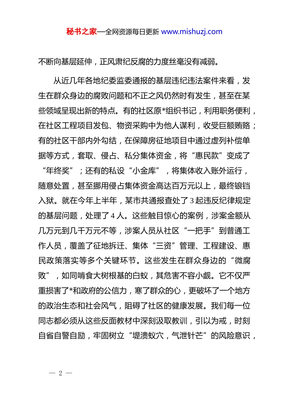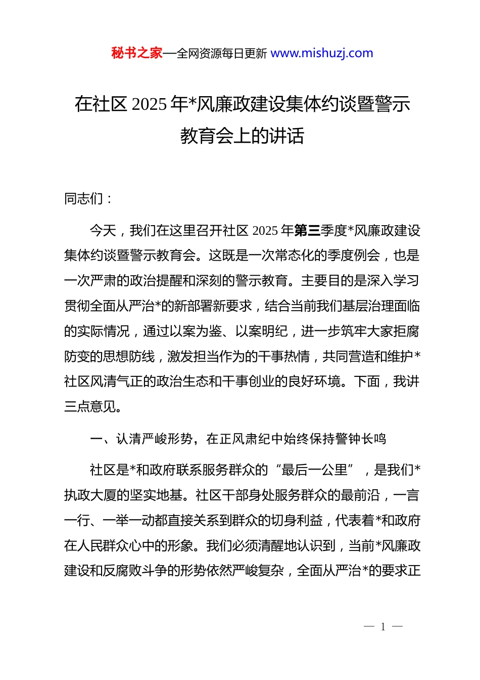 秘书之家—全网资源每日更新 www.mishuzj.com在社区 2025 年*风廉政建设集体约谈暨警示教育会上的讲话同志们:今天,我们在这里召开社区 2025 年第三季度*风廉政建设集体约谈暨警示教育会。这既是一次常态化的季度例会,也是一次严肃的政治提醒和深刻的警示教育。主要目的是深入学习贯彻全面从严治*的新部署新要求,结合当前我们基层治理面临的实际情况,通过以案为鉴、以案明纪,进一步筑牢大家拒腐防变的思想防线,激发担当作为的干事热情,共同营造和维护*社区风清气正的政治生态和干事创业的良好环境。下面,我讲三点意见。一、认清严峻形势,在正风肃纪中始终保持警钟长鸣社区是*和政府联系服务群众的“最后一公里”,是我们*执政大厦的坚实地基。社区干部身处服务群众的最前沿,一言一行、一举一动都直接关系到群众的切身利益,代表着*和政府在人民群众心中的形象。我们必须清醒地认识到,当前*风廉政建设和反腐败斗争的形势依然严峻复杂,全面从严治*的要求正— 1 —秘书之家—全网资源每日更新 www.mishuzj.com不断向基层延伸,正风肃纪反腐的力度丝毫没有减弱。从近几年各地纪委监委通报的基层违纪违法案件来看,发生在群众身边的腐败问题和不正之风仍然时有发生,甚至在某些领域呈现出新的特点。有的社区原*组织书记,利用职务便利,在社区工程项目发包、物资采购中为他人谋利,收受巨额贿赂;有的社区干部内外勾结,在保障房征地项目中通过虚列补偿单据等方式,套取、侵占、私分集体资金,将“惠民款”变成了“年终奖”;还有的私设“小金库”,将集体收入账外运行,随意处置,甚至挪用侵占集体资金高达百万元以上,最终锒铛入狱。就在今年上半年,某市共通报查处了 3 起违反纪律规定的基层问题,处理了 4 人。这些触目惊心的案例,涉案金额从几万元到几千万元不等,涉案人员从社区“一把手”到普通工作人员,覆盖了征地拆迁、集体“三资”管理、工程建设、惠民政策落实等多个关键环节。这些发生在群众身边的“微腐败”,如同啃食大树根基的白蚁,其危害不容小觑。它不仅严重损害了*和政府的公信力,寒了群众的心,更破坏了一个地方的政治生态和社会风气,阻碍了社区的健康发展。我们每一位同志都必须从这些反面教材中深刻汲取教训,引以为戒,时刻自省自警自励,牢固树立“堤溃蚁穴,气泄针芒”的风险意识,— 2 —秘书之家—全网资源每日更新 www.mishuzj.com决不能认为自己岗位“位微权轻”,就心存侥幸;决不能认为制度规定是“稻草人”,就肆意妄为。我们必须始终保持清醒的头脑,绷紧纪律这根弦,让警钟在耳边长鸣。二、提高政治站位,在履职尽责中坚决做到忠诚干净担当面对新形势新任务新要求,我们必须把加强*风廉政建设作为一项极端重要的政治任务来抓,不断提高政治判断力、政治领悟力、政治执行力,以实际行动诠释对*的忠诚、对人民的负责。第一,要筑牢政治忠诚,在践行“两个维护”上作表率。政治忠诚是*员干部的立身之本。社区工作千头万绪,但最根本的一条,就是旗帜鲜明讲政治。大家要持续加强政治理论学习,特别是深入学习******关于作风建设的重要论述,深刻理解和把握新时代全面从严治*的战略方针,确保在思想上政治上行动上同以***同志为核心的*中央保持高度一致。要把坚定拥护“两个确立”、坚决做到“两个维护”的要求,具体地、现实地落实到解决好群众“急难愁盼”问题的具体行动中,落实到推动社区各项事业发展的实际成效上,确保*中央的各项决策部署在*社区不折不扣地落地生根。— 3 —秘书之家—全网资源每日更新 www.mishuzj.com第二,要转变工作作风,在服务人民群众上见实效。作风问题关系人心向背。我们必须驰而不息纠治“四风”特别是形式主义、官僚主义。要坚决杜绝“不作为、慢作为、乱作为”等顽瘴痼疾,彻底摒弃“门好进、脸好看、事难办”的衙门作风。社区干部直接面对居民,我们的工作态度、服务效率,群众感受最真切。大家要牢固树立以人民为中心的发展思想,把群众的安危冷暖时刻放在心上,通过下沉网格、入户走访等方式,主动倾听群众呼声,真心实意为群众办实事、解难题。对待群众要多一份耐心、多一份细心...