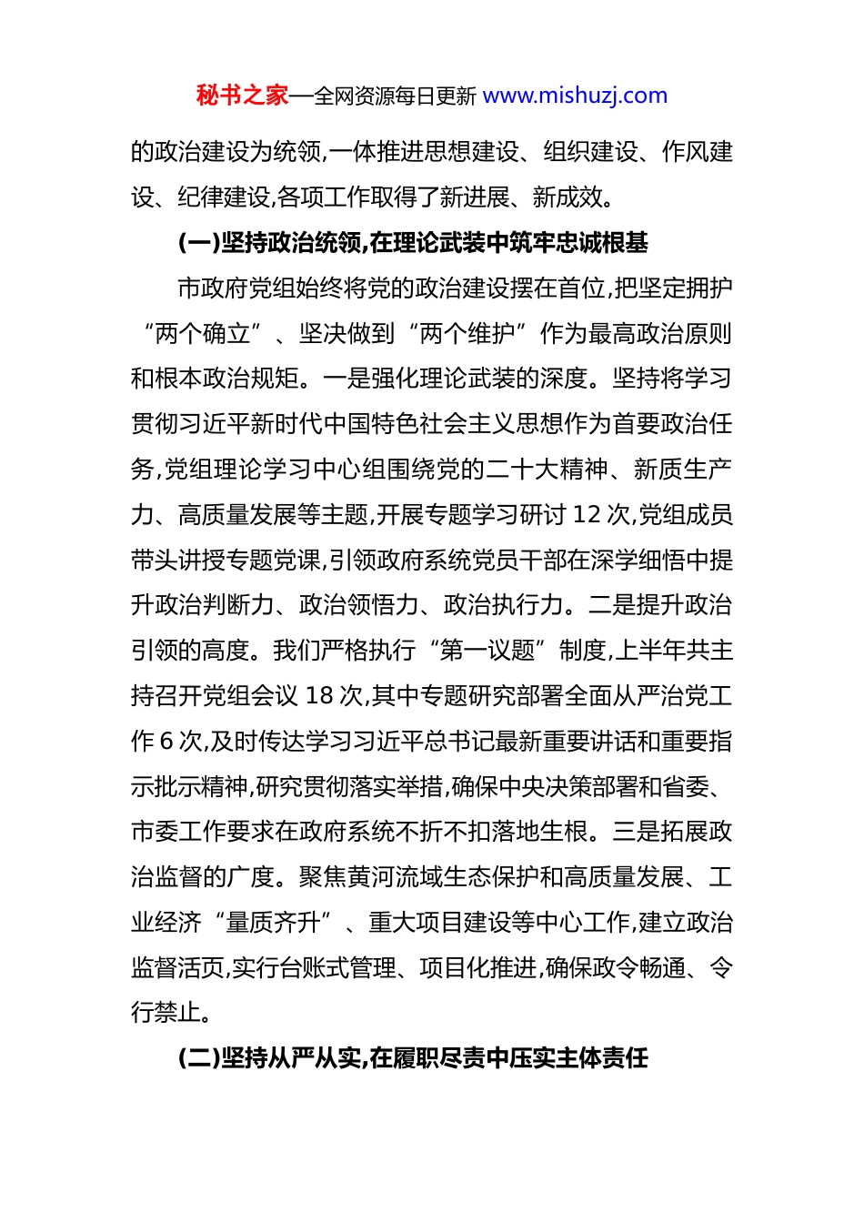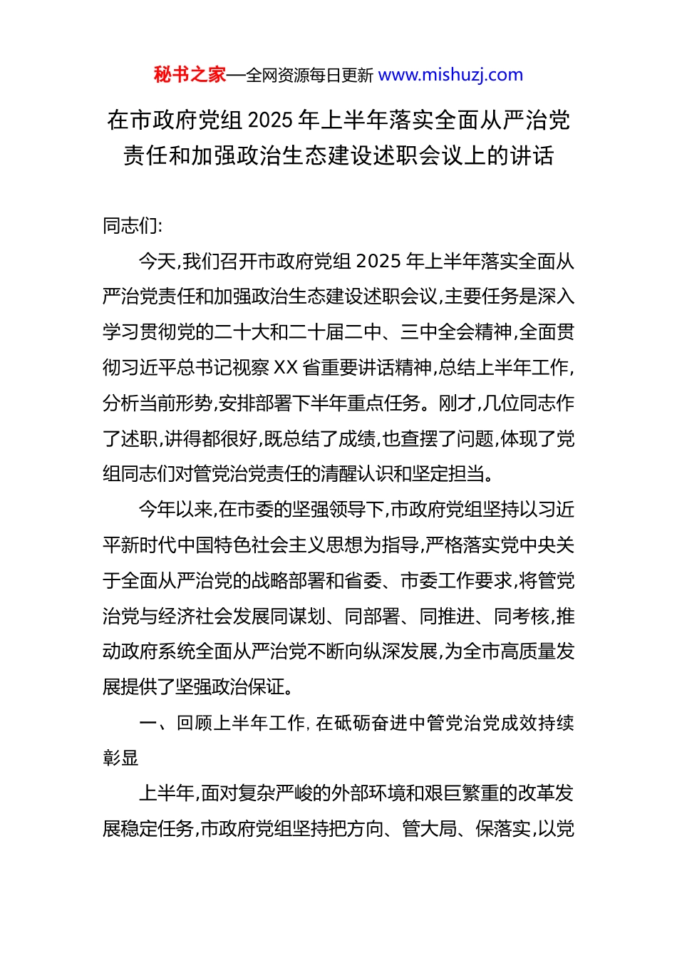 秘书之家—全网资源每日更新 www.mishuzj.com在市政府党组 2025 年上半年落实全面从严治党责任和加强政治生态建设述职会议上的讲话 同志们:今天,我们召开市政府党组 2025 年上半年落实全面从严治党责任和加强政治生态建设述职会议,主要任务是深入学习贯彻党的二十大和二十届二中、三中全会精神,全面贯彻习近平总书记视察 XX 省重要讲话精神,总结上半年工作,分析当前形势,安排部署下半年重点任务。刚才,几位同志作了述职,讲得都很好,既总结了成绩,也查摆了问题,体现了党组同志们对管党治党责任的清醒认识和坚定担当。今年以来,在市委的坚强领导下,市政府党组坚持以习近平新时代中国特色社会主义思想为指导,严格落实党中央关于全面从严治党的战略部署和省委、市委工作要求,将管党治党与经济社会发展同谋划、同部署、同推进、同考核,推动政府系统全面从严治党不断向纵深发展,为全市高质量发展提供了坚强政治保证。一、回顾上半年工作,在砥砺奋进中管党治党成效持续彰显上半年,面对复杂严峻的外部环境和艰巨繁重的改革发展稳定任务,市政府党组坚持把方向、管大局、保落实,以党秘书之家—全网资源每日更新 www.mishuzj.com的政治建设为统领,一体推进思想建设、组织建设、作风建设、纪律建设,各项工作取得了新进展、新成效。(一)坚持政治统领,在理论武装中筑牢忠诚根基市政府党组始终将党的政治建设摆在首位,把坚定拥护“两个确立”、坚决做到“两个维护”作为最高政治原则和根本政治规矩。一是强化理论武装的深度。坚持将学习贯彻习近平新时代中国特色社会主义思想作为首要政治任务,党组理论学习中心组围绕党的二十大精神、新质生产力、高质量发展等主题,开展专题学习研讨 12 次,党组成员带头讲授专题党课,引领政府系统党员干部在深学细悟中提升政治判断力、政治领悟力、政治执行力。二是提升政治引领的高度。我们严格执行“第一议题”制度,上半年共主持召开党组会议 18 次,其中专题研究部署全面从严治党工作 6 次,及时传达学习习近平总书记最新重要讲话和重要指示批示精神,研究贯彻落实举措,确保中央决策部署和省委、市委工作要求在政府系统不折不扣落地生根。三是拓展政治监督的广度。聚焦黄河流域生态保护和高质量发展、工业经济“量质齐升”、重大项目建设等中心工作,建立政治监督活页,实行台账式管理、项目化推进,确保政令畅通、令行禁止。(二)坚持从严从实,在履职尽责中压实主体责任秘书之家—全网资源每日更新 www.mishuzj.com市政府党组坚决扛起全面从严治党主体责任,着力构建层层传导、环环相扣的责任闭环。一是厘清责任链条。年初,我们研究制定了《XX 市政府党组 2025 年落实全面从严治党主体责任清单》,将管党治党任务细化为 6 个方面 28项具体措施,明确了党组书记“第一责任人”责任、班子成员“一岗双责”以及责任部门,确保任务到人、责任到岗。同时,组织政府系统各单位签订《党风廉政建设责任书》,将责任和压力传导至“神经末梢”。二是强化制度执行。严格执行《党委(党组)落实全面从严治党主体责任规定》,对重大决策、重要人事任免、重大项目安排、大额度资金使用等事项,均由党组会议集体研究决定,上半年党组会议研究审议相关议题超过 50 项,坚决杜绝“个人说了算”的现象。三是做实日常监督。党组成员通过“四不两直”方式,深入分管领域和部门开展调研督导 20 余次,定期听取分管单位党风廉政建设情况汇报,对苗头性、倾向性问题及时提醒、约谈,把严管与厚爱落到实处,防止小问题演变成大问题。(三)坚持正风肃纪,在激浊扬清中净化政治生态市政府党组以刀刃向内的勇气,持之以恒纠“四风”、树新风,一体推进不敢腐、不能腐、不想腐。一是锲而不舍纠治“四风”。扎实开展中央八项规定精神学习教育,紧盯秘书之家—全网资源每日更新 www.mishuzj.com形式主义、官僚主义新动向新表现,在政府系统部署开展了“文山会海”和“指尖上的形式主义”专项整治行动。上半年,市政府及办公室发文数量、会议数量同比分别压减15.3%和 12.8%,切实为基层松绑减负。二是保持惩腐高压态势。我们坚定支持纪检监察机关依规依纪依法履行职责,严肃查处工程建设、公共资源...