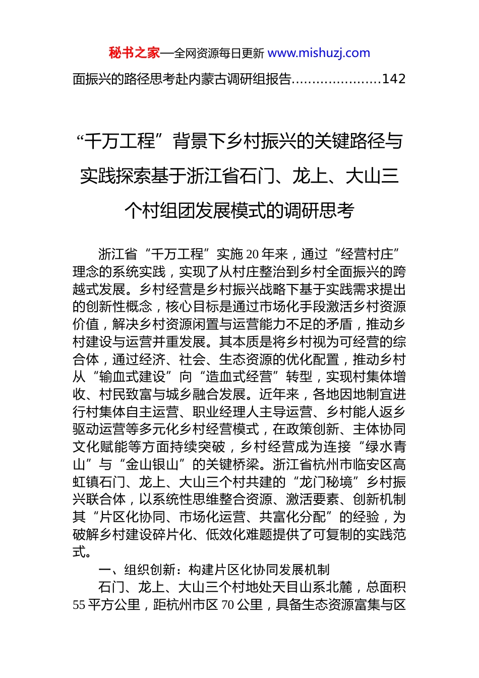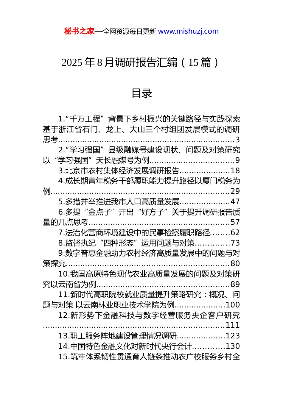 秘书之家—全网资源每日更新 www.mishuzj.com2025 年 8 月调研报告汇编(15 篇)目录1.“千万工程”背景下乡村振兴的关键路径与实践探索基于浙江省石门、龙上、大山三个村组团发展模式的调研思考.........................................................................32.“学习强国”县级融媒号建设现状、问题及对策研究以“学习强国”天长融媒号为例...................................93.北京市农村集体经济发展调研报告.....................184.成长期青年税务干部履职能力提升路径以厦门税务为例..........................................................................295.多措并举推进我市人口高质量发展.....................476.多提“金点子”开出“好方子”关于提升调研报告质量的几点思考..........................................................577.法治化营商环境建设中的民事检察履职路径........628.监督执纪“四种形态”运用问题与对策..............739.数字普惠金融助力农村经济高质量发展中的问题与对策探究...................................................................8010.我国高原特色现代农业高质量发展的问题及对策研究以云南省为例.......................................................8911.新时代高职院校就业质量提升策略研究:概况、问题与对策 以云南林业职业技术学院为例.....................10012.新形势下金融科技与数字经营服务央企客户研究...........................................................................11113.职工服务阵地建设管理情况调研....................12314.中国特色金融文化对新时代央行会计.............13015.筑牢体系韧性贯通育人链条推动农广校服务乡村全秘书之家—全网资源每日更新 www.mishuzj.com面振兴的路径思考赴内蒙古调研组报告......................142“千万工程”背景下乡村振兴的关键路径与实践探索基于浙江省石门、龙上、大山三个村组团发展模式的调研思考浙江省“千万工程”实施 20 年来,通过“经营村庄”理念的系统实践,实现了从村庄整治到乡村全面振兴的跨越式发展。乡村经营是乡村振兴战略下基于实践需求提出的创新性概念,核心目标是通过市场化手段激活乡村资源价值,解决乡村资源闲置与运营能力不足的矛盾,推动乡村建设与运营并重发展。其本质是将乡村视为可经营的综合体,通过经济、社会、生态资源的优化配置,推动乡村从“输血式建设”向“造血式经营”转型,实现村集体增收、村民致富与城乡融合发展。近年来,各地因地制宜进行村集体自主运营、职业经理人主导运营、乡村能人返乡驱动运营等多元化乡村经营模式,在政策创新、主体协同文化赋能等方面持续突破,乡村经营成为连接“绿水青山”与“金山银山”的关键桥梁。浙江省杭州市临安区高虹镇石门、龙上、大山三个村共建的“龙门秘境”乡村振兴联合体,以系统性思维整合资源、激活要素、创新机制其“片区化协同、市场化运营、共富化分配”的经验,为破解乡村建设碎片化、低效化难题提供了可复制的实践范式。一、组织创新:构建片区化协同发展机制石门、龙上、大山三个村地处天目山系北麓,总面积55 平方公里,距杭州市区 70 公里,具备生态资源富集与区秘书之家—全网资源每日更新 www.mishuzj.com位交通便利的双重优势。三个村突破行政壁垒,引入公司专业化运营,构建“主题差异—产业互联—流量共享”的片区化发展架构。一是三个村差异化定位。石门村立足千年古村底蕴,深度挖掘红色文化与传统文化,打造独具特色的文化体验区;龙上村依托狮子山攀岩公园,配套精酿啤酒工坊、森林木屋及户外游乐场,构建活力四射的运动山乡;大山村以康养度假为主题,培育高端精品民宿聚落打造静谧舒适的养生度假胜地。二是客群协同导流。三个村共建游客服务中心、智慧停车场,实现基础设施共享,降低重复建设成本,为片区整体经营奠定基础。通过设计“古韵探秘”“生态农耕”“山居养生”三条主题路线,形成了客群互导、消费互通的生态闭环,实现片区整体价值提升。三是治理机构升级。三个村成立联合*...