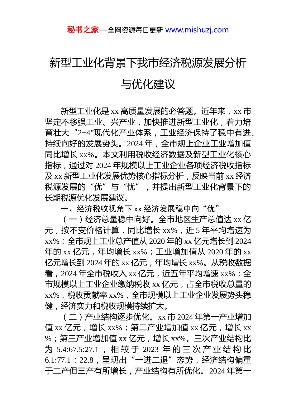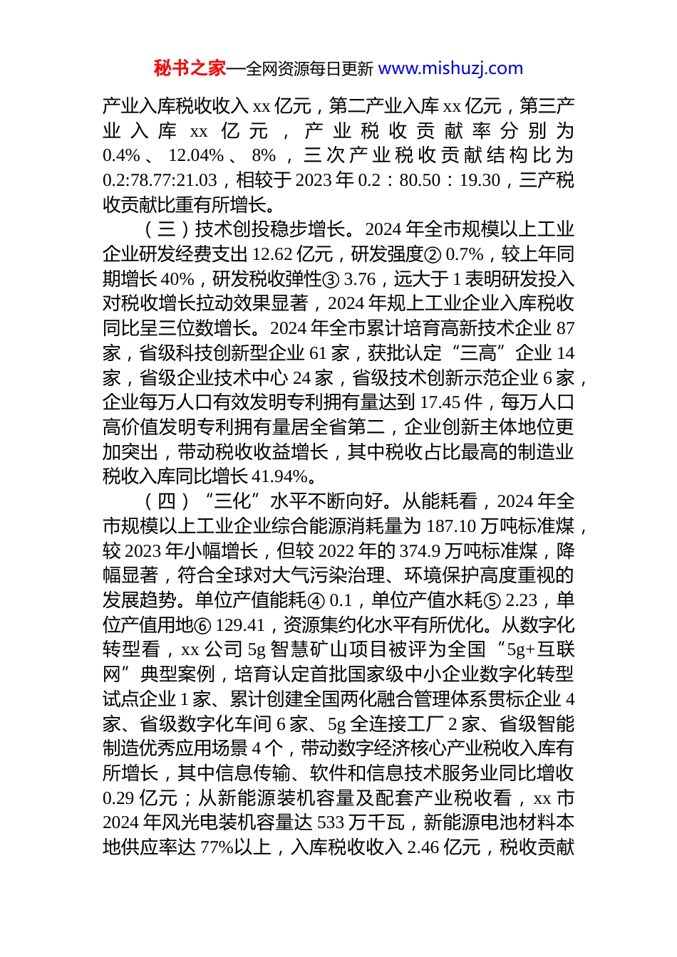 秘书之家—全网资源每日更新 www.mishuzj.com新型工业化背景下我市经济税源发展分析与优化建议新型工业化是 xx 高质量发展的必答题。近年来,xx 市坚定不移强工业、兴产业,加快推进新型工业化,着力培育壮大“2+4”现代化产业体系,工业经济保持了稳中有进、持续向好的发展势头。2024 年,全市规上企业工业增加值同比增长 xx%。本文利用税收经济数据及新型工业化核心指标,通过对 2024 年规模以上工业企业各项经济税收指标及 xx 新型工业化发展优势核心指标分析,反映当前 xx 经济税源发展的“优”与“忧”,并提出新型工业化背景下的长期税源优化发展建议。一、经济税收视角下 xx 经济发展稳中向“优”(一)经济总量稳中向好。全市地区生产总值达 xx 亿元,按不变价格计算,同比增长 xx%,近 5 年平均增速为xx%;全市规上工业总产值从 2020 年的 xx 亿元增长到 2024年的 xx 亿元,年均增长 xx%;工业增加值从 2020 年的 xx亿元增长到 2024 年的 xx 亿元,年均增长 xx%。从税收数据看,2024 年全市税收入 xx 亿元,近五年平均增速 xx%;全市规模以上工业企业缴纳税收 xx 亿元,占全市税收总量的xx%,税收贡献率 xx%,全市规模以上工业企业发展势头稳健,经济实力和税收规模持续扩大。(二)产业结构逐步优化。xx 市 2024 年第一产业增加值 xx 亿元,增长 xx%;第二产业增加值 xx 亿元,增长 xx%;第三产业增加值 xx 亿元,增长 xx%。三次产业结构比为 5.4:67.5:27.1 , 相 较 于 2023 年 的 三 次 产 业 结 构 比6.1:77.1:22.8,呈现出“一进二退”态势,经济结构偏重于二产但三产有所增长,产业结构有所优化。2024 年第一秘书之家—全网资源每日更新 www.mishuzj.com产业入库税收收入 xx 亿元,第二产业入库 xx 亿元,第三产业 入 库 xx 亿 元 , 产 业 税 收 贡 献 率 分 别 为0.4% 、 12.04% 、 8% , 三 次 产 业 税 收 贡 献 结 构 比 为0.2:78.77:21.03,相较于 2023 年 0.2:80.50:19.30,三产税收贡献比重有所增长。(三)技术创投稳步增长。2024 年全市规模以上工业企业研发经费支出 12.62 亿元,研发强度② 0.7%,较上年同期增长 40%,研发税收弹性③ 3.76,远大于 1 表明研发投入对税收增长拉动效果显著,2024 年规上工业企业入库税收同比呈三位数增长。2024 年全市累计培育高新技术企业 87家,省级科技创新型企业 61 家,获批认定“三高”企业 14家,省级企业技术中心 24 家,省级技术创新示范企业 6 家,企业每万人口有效发明专利拥有量达到 17.45 件,每万人口高价值发明专利拥有量居全省第二,企业创新主体地位更加突出,带动税收收益增长,其中税收占比最高的制造业税收入库同比增长 41.94%。(四)“三化”水平不断向好。从能耗看,2024 年全市规模以上工业企业综合能源消耗量为 187.10 万吨标准煤,较 2023 年小幅增长,但较 2022 年的 374.9 万吨标准煤,降幅显著,符合全球对大气污染治理、环境保护高度重视的发展趋势。单位产值能耗④ 0.1,单位产值水耗⑤ 2.23,单位产值用地⑥ 129.41,资源集约化水平有所优化。从数字化转型看,xx 公司 5g 智慧矿山项目被评为全国“5g+互联网”典型案例,培育认定首批国家级中小企业数字化转型试点企业 1 家、累计创建全国两化融合管理体系贯标企业 4家、省级数字化车间 6 家、5g 全连接工厂 2 家、省级智能制造优秀应用场景 4 个,带动数字经济核心产业税收入库有所增长,其中信息传输、软件和信息技术服务业同比增收0.29 亿元;从新能源装机容量及配套产业税收看,xx 市2024 年风光电装机容量达 533 万千瓦,新能源电池材料本地供应率达 77%以上,入库税收收入 2.46 亿元,税收贡献秘书之家—全网资源每日更新 www.mishuzj.com占全市税收收入的 3.85%。(五)企业效益稳中有增。从企业财务数据看,2024年全市规模以上工业企业利润 92.82 亿元,营业收入利润率为 4.0%。从税收数据看,代表企业盈利能力的企业所得税剔除一次性因素后净...