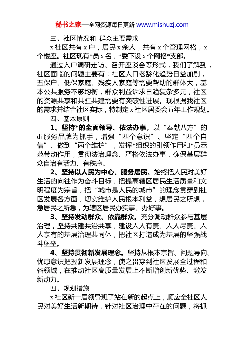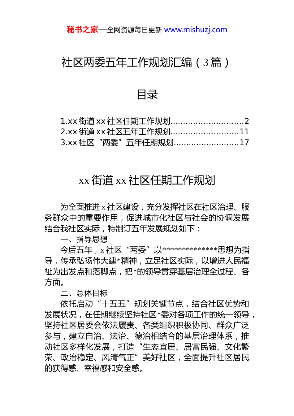 秘书之家—全网资源每日更新 www.mishuzj.com社区两委五年工作规划汇编(3 篇)目录1.xx 街道 xx 社区任期工作规划.............................22.xx 街道 xx 社区五年工作规划...........................113.xx 社区“两委”五年任期规划..........................17xx 街道 xx 社区任期工作规划为全面推进 x 社区建设,充分发挥社区在社区治理、服务群众中的重要作用,促进城市化社区与社会的协调发展结合我社区实际,特制订五年发展规划如下:一、指导思想今后五年,x 社区“两委”以**************思想为指导,传承弘扬伟大建*精神,立足社区实际,以增进人民福祉为出发点和落脚点,把*的领导贯穿基层治理全过程、各方面。二、总体目标依托启动“十五五”规划关键节点,结合社区优势和发展状况,在任期继续坚持社区*委对各项工作的统一领导,坚持社区居委会依法履责、各类组织积极协同、群众广泛参与,建立自治、法治、德治相结合的基层治理体系,推动社区多样化发展,打造“生态宜居、居富民强、文化繁荣、政治稳定、风清气正”美好社区,全面提升社区居民的获得感、幸福感和安全感。秘书之家—全网资源每日更新 www.mishuzj.com三、社区情况和 群众主要需求x 社区共有 x 户,居民 x 余人,共有 x 个管理网格,x个楼座。社区现有*员 x 名,*委下设 x 个网格*支部。通过入户调研走访、召开座谈会等形式,我们了解到,社区面临的问题主要有:社区人口老龄化趋势日益加剧,五保户、低保家庭、残疾人家庭等需要帮助的群体大,基本公共服务不够均衡,群众利益诉求日趋复杂多元,社区的资源共享和共驻共建需要有突破性进展。现根据我社区的需求并结合社区实际,特制定 x 社区居委会五年工作规划。四、基本原则1、坚持*的全面领导、依法办事。以“奉献八方”的dj 服务品牌为抓手,增强“四个意识”、坚定“四个自信”、做到“两个维护”,发挥*组织的引领作用和*员示范带动作用,贯彻法治理念、严格依法办事,确保基层群众自治有活力、有秩序。2、坚持以人民为中心、服务居民。始终把人民对美好生活的向往作为奋斗目标,把提高辖区居民生活质量和文明程度为宗旨,把“城市是人民的城市”的理念贯穿到社区发展各方面,切实维护人民根本利益,想居民之所想,急居民之所急,为辖区居民办实事、办好事。3、坚持发动群众、依靠群众。充分调动群众参与基层治理,坚持共建共治共享,建设人人有责、人人尽责、人人享有的基层治理共同体,把社区打造成为基层的坚强战斗堡垒。4、坚持贯彻新发展理念。坚持从根本宗旨、问题导向、忧患意识把握新发展理念,使之贯穿到社区发展全过程和各领域,在推动社区高质量发展上不断增创新优势、激发新动力。四、规划措施x 社区新一届领导班子站在新的起点上,顺应全社区人民对美好生活新期待,针对社区治理中存在的问题,将抓秘书之家—全网资源每日更新 www.mishuzj.com住机遇,乘势而上,奋勇争先,全面求强,深入学习借鉴新经验新做法,攻坚克难抓整改,在服务构建新发展格局中精准定位,探索建立以*组织为核心,以标准化建制、区域化统筹、网格化治理、信息化支撑为主要内容的“一核统筹、四化推进”工作机制。力争社区服务标准化、专业化、智慧化程度显著提升,推动现代化新型城市社区建设取得新突破。(一)建设过硬队伍,推进*组织规范化提升1.扎实抓好班子建设。以 dj 统领实现高质量发展,抓好社区“两委”班子建设,强化“两委”干部培训,通过去优秀社区、兄弟社区实地学习、外出参观等形式,解放思想,学习先进发展经验,提升班子整体素质及战斗力。做到业务拔尖,分工合理,职责科学、清正廉洁、团结一心,齐心干事。充分利用微信群线上平台,发布信息、收集民意,把*的要求和群众的期盼落在实处加强后备年轻干部培养,及时将政治表现好、热爱社区公共事务的骨干人员纳入*员发展计划。加强社区优秀人才储备,对社区优秀大学毕业生、退伍军人、个体经营者等高素质人才建档管理,纳入社区后备人才库。2.织密建强服务网格。为主动发现、及时受理办理群众意见建议,构建“社区*委—网格*支部—楼院*小组—...
