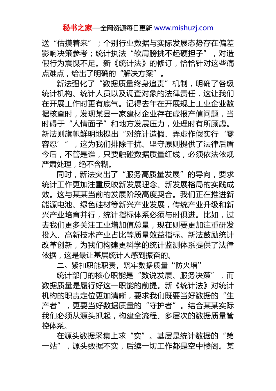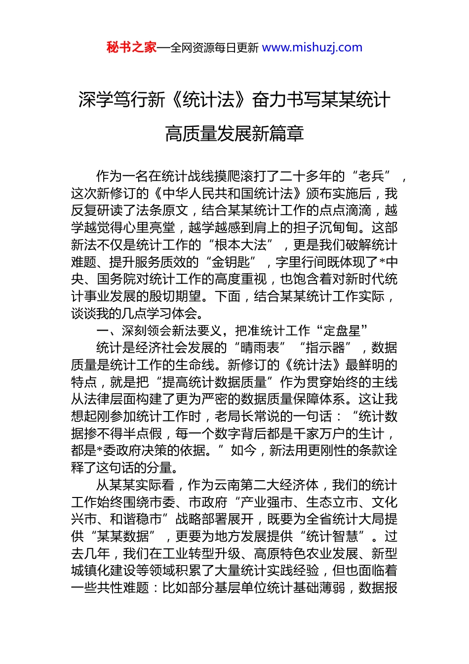 秘书之家—全网资源每日更新 www.mishuzj.com深学笃行新《统计法》奋力书写某某统计高质量发展新篇章作为一名在统计战线摸爬滚打了二十多年的“老兵”,这次新修订的《中华人民共和国统计法》颁布实施后,我反复研读了法条原文,结合某某统计工作的点点滴滴,越学越觉得心里亮堂,越学越感到肩上的担子沉甸甸。这部新法不仅是统计工作的“根本大法”,更是我们破解统计难题、提升服务质效的“金钥匙”,字里行间既体现了*中央、国务院对统计工作的高度重视,也饱含着对新时代统计事业发展的殷切期望。下面,结合某某统计工作实际,谈谈我的几点学习体会。一、深刻领会新法要义,把准统计工作“定盘星”统计是经济社会发展的“晴雨表”“指示器”,数据质量是统计工作的生命线。新修订的《统计法》最鲜明的特点,就是把“提高统计数据质量”作为贯穿始终的主线从法律层面构建了更为严密的数据质量保障体系。这让我想起刚参加统计工作时,老局长常说的一句话:“统计数据掺不得半点假,每一个数字背后都是千家万户的生计,都是*委政府决策的依据。”如今,新法用更刚性的条款诠释了这句话的分量。从某某实际看,作为云南第二大经济体,我们的统计工作始终围绕市委、市政府“产业强市、生态立市、文化兴市、和谐稳市”战略部署展开,既要为全省统计大局提供“某某数据”,更要为地方发展提供“统计智慧”。过去几年,我们在工业转型升级、高原特色农业发展、新型城镇化建设等领域积累了大量统计实践经验,但也面临着一些共性难题:比如部分基层单位统计基础薄弱,数据报秘书之家—全网资源每日更新 www.mishuzj.com送“估摸着来”;个别行业数据与实际发展态势存在偏差影响决策参考;统计执法“软肩膀挑不起硬担子”,对造假行为震慑不足。新《统计法》的修订,恰恰针对这些痛点难点,给出了明确的“解决方案”。新法强化了“数据质量终身追责”机制,明确了各级统计机构、统计人员以及调查对象的法律责任,这让我们在开展工作时更有底气。记得去年在开展规上工业企业数据核查时,发现某县一家建材企业存在虚报产值问题,当时碍于“人情面子”和地方发展压力,处理时有所顾虑。新法则旗帜鲜明地提出“对统计造假、弄虚作假实行‘零容忍’”,这为我们排除干扰、坚守原则提供了法律后盾今后,不管是谁,只要触碰数据质量红线,必须依法依规严肃处理,绝不含糊。同时,新法突出了“服务高质量发展”的导向,要求统计工作更加注重反映新发展理念、新发展格局的实践成效。这与某某当前的发展阶段高度契合。我们正在推进新能源电池、绿色硅材等新兴产业发展,传统产业升级和新兴产业培育并行,统计指标体系必须与时俱进。比如,过去我们更多关注工业增加值总量,现在则要更加注重研发投入、高新技术产业占比等质量效益指标。新法鼓励统计改革创新,为我们构建更科学的统计监测体系提供了法律依据,这是最让基层统计人感到振奋的。二、紧扣职能职责,筑牢数据质量“防火墙”统计部门的核心职能是“数说发展、服务决策”,而数据质量是履行好这一职能的前提。新《统计法》对统计机构的职责定位更加清晰,要求我们既要当好数据的“生产者”,更要当好数据质量的“守护者”。结合某某实际我们必须从源头抓起,构建全流程、多层次的数据质量管控体系。在源头数据采集上求“实”。基层是统计数据的“第一站”,源头数据不实,后续一切工作都是空中楼阁。某秘书之家—全网资源每日更新 www.mishuzj.com某有 10 个县(市、区),乡镇(街道)统计力量参差不齐,部分村(社区)统计员身兼数职,业务能力有待提升。针对这一问题,我们近年来推行了“村级统计员职业化”试点,在陆良县、麒麟区选取 20 个村(社区),通过财政补贴方式稳定统计队伍,开展常态化业务培训。新《统计法》强调“健全统计基层基础工作”,这让我们更加坚定了推进这项工作的决心。下一步,计划用两年时间在全市推广这一做法,实现每个村(社区)有 1 名专职或兼职统计员,持证上岗、定期考核,从源头上减少“数出多门、数据打架”的现象。企业是统计数据的重要来源,新法对企业的义务和权利作出了更明确的规定。我们...