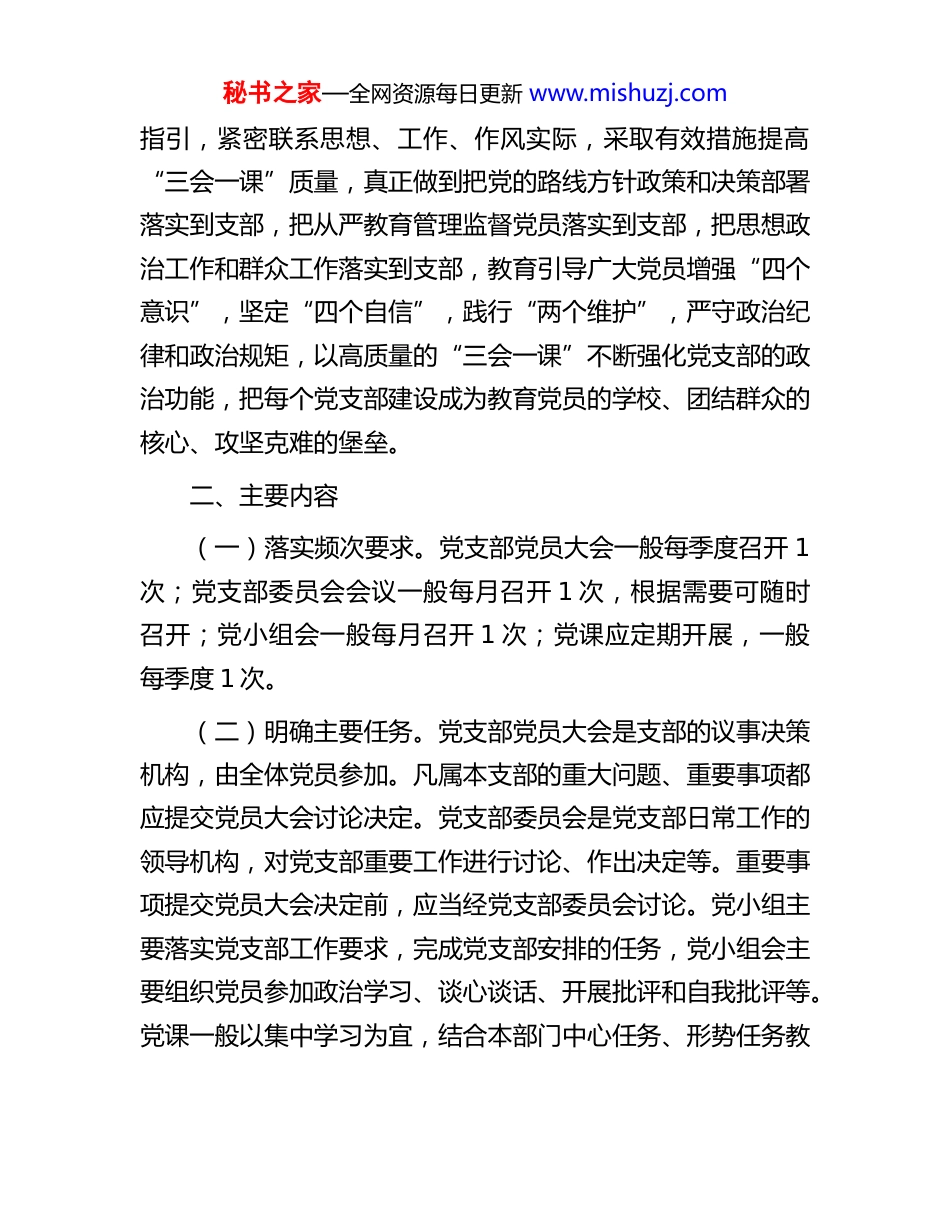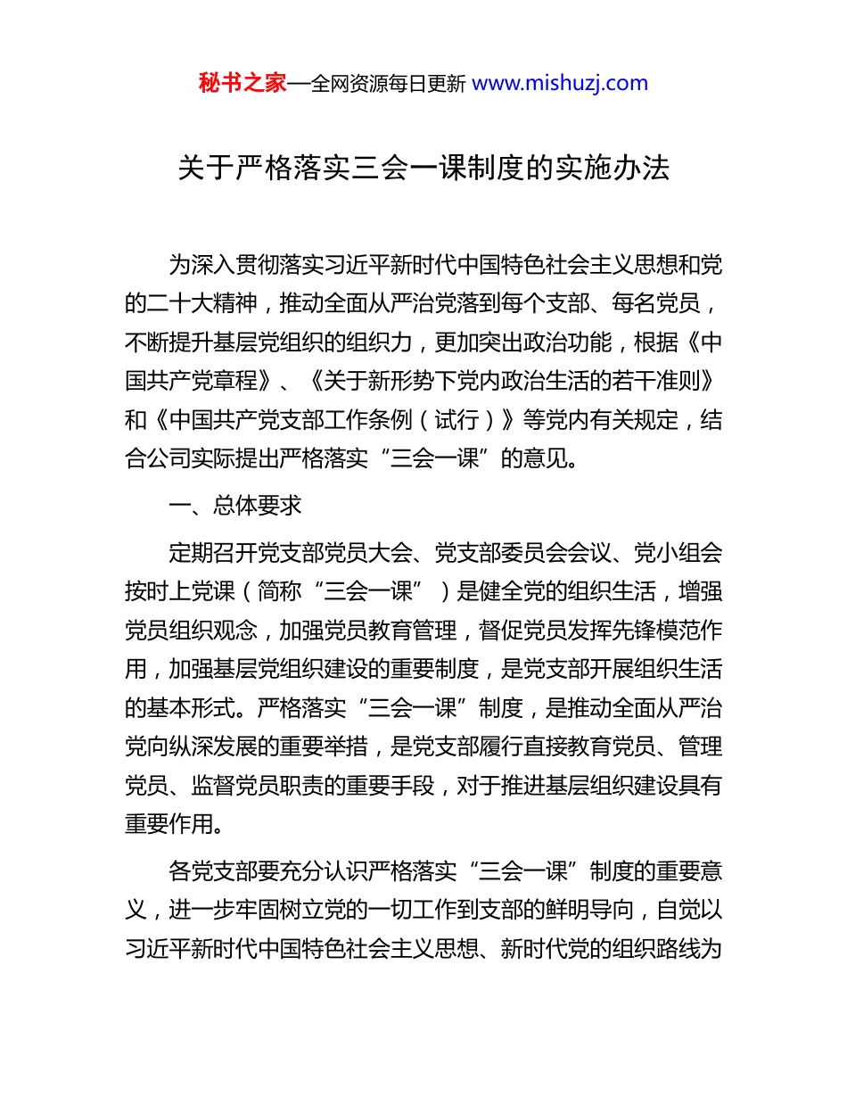 秘书之家—全网资源每日更新 www.mishuzj.com关于严格落实三会一课制度的实施办法为深入贯彻落实习近平新时代中国特色社会主义思想和党的二十大精神,推动全面从严治党落到每个支部、每名党员,不断提升基层党组织的组织力,更加突出政治功能,根据《中国共产党章程》、《关于新形势下党内政治生活的若干准则》和《中国共产党支部工作条例(试行)》等党内有关规定,结合公司实际提出严格落实“三会一课”的意见。一、总体要求定期召开党支部党员大会、党支部委员会会议、党小组会按时上党课(简称“三会一课”)是健全党的组织生活,增强党员组织观念,加强党员教育管理,督促党员发挥先锋模范作用,加强基层党组织建设的重要制度,是党支部开展组织生活的基本形式。严格落实“三会一课”制度,是推动全面从严治党向纵深发展的重要举措,是党支部履行直接教育党员、管理党员、监督党员职责的重要手段,对于推进基层组织建设具有重要作用。各党支部要充分认识严格落实“三会一课”制度的重要意义,进一步牢固树立党的一切工作到支部的鲜明导向,自觉以习近平新时代中国特色社会主义思想、新时代党的组织路线为秘书之家—全网资源每日更新 www.mishuzj.com指引,紧密联系思想、工作、作风实际,采取有效措施提高“三会一课”质量,真正做到把党的路线方针政策和决策部署落实到支部,把从严教育管理监督党员落实到支部,把思想政治工作和群众工作落实到支部,教育引导广大党员增强“四个意识”,坚定“四个自信”,践行“两个维护”,严守政治纪律和政治规矩,以高质量的“三会一课”不断强化党支部的政治功能,把每个党支部建设成为教育党员的学校、团结群众的核心、攻坚克难的堡垒。二、主要内容(一)落实频次要求。党支部党员大会一般每季度召开 1次;党支部委员会会议一般每月召开 1 次,根据需要可随时召开;党小组会一般每月召开 1 次;党课应定期开展,一般每季度 1 次。(二)明确主要任务。党支部党员大会是支部的议事决策机构,由全体党员参加。凡属本支部的重大问题、重要事项都应提交党员大会讨论决定。党支部委员会是党支部日常工作的领导机构,对党支部重要工作进行讨论、作出决定等。重要事项提交党员大会决定前,应当经党支部委员会讨论。党小组主要落实党支部工作要求,完成党支部安排的任务,党小组会主要组织党员参加政治学习、谈心谈话、开展批评和自我批评等。党课一般以集中学习为宜,结合本部门中心任务、形势任务教秘书之家—全网资源每日更新 www.mishuzj.com育要求和党员思想工作实际,进行党的理论和路线方针政策等多方面教育,注重答疑释惑、互动交流。(三)强化政治引领。“三会一课”应当突出政治学习和教育,突出党性锻炼,做到“有主题、有讨论、有共识、有行动”,使之成为政治学习的阵地、思想交流的平台、党性锻炼的熔炉。要针对党员思想工作实际,学习习近平新时代中国特色社会主义思想,开展马克思主义理论教育、政治教育、形势政策教育、革命传统教育、党的历史教育等,引导党员坚定理想信念,争做合格党员。(四)创新方式方法。规范“三会一课”程序,增强仪式感,做到形式多样、氛围庄重。发挥红色教育资源、党建网站、远程教育平台优势,拓展“三会一课”思想教育阵地。推广“微型党课”“网络党课”“电影党课”“音频党课”“音乐党课”等灵活、务实、管用的方式,增强“三会一课”吸引力感染力,让党员坐得住、听得懂、易接受。探索依托互联网开展“三会一课”的有效方法,推动传统优势和现代信息技术有机融合,切实增强“三会一课”实效。(五)规范台帐管理。可设立支部秘书,明确专人负责“三会一课”台帐记录,主要内容包括:时间、地点、出(缺)席党员名单、议题、主持人、发言或讲课要点等。记录原则上应实时进行,原汁原味反映“三会一课”情况;实时记录不够完整的,应在一周内补充完整,坚决防止突击补记录的秘书之家—全网资源每日更新 www.mishuzj.com情况发生。鼓励采用电子台帐管理,提高台帐记录的规范性和便捷性。公司党委要及时研究“三会一课”制度落实中存在的普遍性、倾向性问题,提出对策措施,加强...