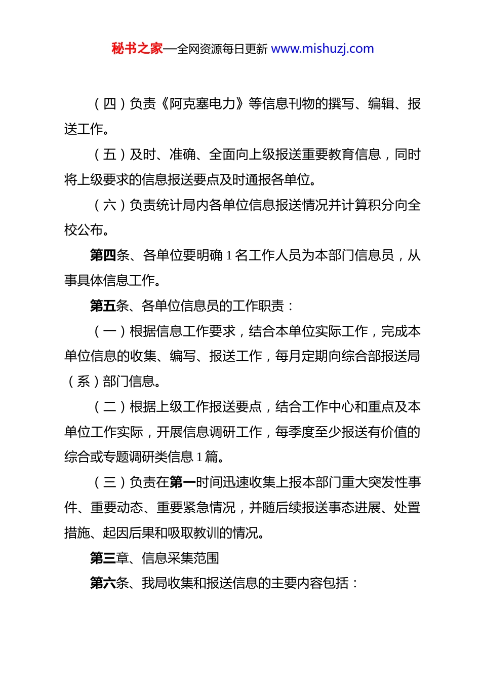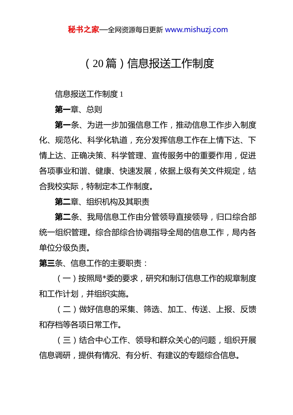 秘书之家—全网资源每日更新 www.mishuzj.com(20 篇)信息报送工作制度信息报送工作制度 1第一章、总则第一条、为进一步加强信息工作,推动信息工作步入制度化、规范化、科学化轨道,充分发挥信息工作在上情下达、下情上达、正确决策、科学管理、宣传服务中的重要作用,促进各项事业和谐、健康、快速发展,依据上级有关文件规定,结合我校实际,特制定本工作制度。第二章、组织机构及其职责第二条、我局信息工作由分管领导直接领导,归口综合部统一组织管理。综合部综合协调指导全局的信息工作,局内各单位分级负责。第三条、信息工作的主要职责:(一)按照局*委的要求,研究和制订信息工作的规章制度和工作计划,并组织实施。(二)做好信息的采集、筛选、加工、传送、上报、反馈和存档等各项日常工作。(三)结合中心工作、领导和群众关心的问题,组织开展信息调研,提供有情况、有分析、有建议的专题综合信息。秘书之家—全网资源每日更新 www.mishuzj.com(四)负责《阿克塞电力》等信息刊物的撰写、编辑、报送工作。(五)及时、准确、全面向上级报送重要教育信息,同时将上级要求的信息报送要点及时通报各单位。(六)负责统计局内各单位信息报送情况并计算积分向全校公布。第四条、各单位要明确 1 名工作人员为本部门信息员,从事具体信息工作。第五条、各单位信息员的工作职责:(一)根据信息工作要求,结合本单位实际工作,完成本单位信息的收集、编写、报送工作,每月定期向综合部报送局(系)部门信息。(二)根据上级工作报送要点,结合工作中心和重点及本单位工作实际,开展信息调研工作,每季度至少报送有价值的综合或专题调研类信息 1 篇。(三)负责在第一时间迅速收集上报本部门重大突发性事件、重要动态、重要紧急情况,并随后续报送事态进展、处置措施、起因后果和吸取教训的情况。第三章、信息采集范围第六条、我局收集和报送信息的主要内容包括:秘书之家—全网资源每日更新 www.mishuzj.com(一)*和国家的`重大决策在本单位工作范围内的执行落实情况。(二)本单位重要工作部署及有关会议精神的落实情况。(三)本单位重点工作的进展情况,以及工作推进过程中出现的问题。(四)改革发展举措在本单位员工中间产生的反响情况以及其他思想动态。(五)本单位负责人关于改进全局工作的新思路、合理化建议,本单位推进工作的新举措以及专项工作调研报告。(六)对全局的改革和发展有参考价值的调查报告、专题研究材料和有价值的综合统计数据。(七)上级领导来我局指导、检查工作或参观、访问情况各单位召开或承办局内外重要的教育、科研、行政等各类会议情况;局领导或部门领导、专家、重要出访情况,出席重要会议情况。(八)全局外事活动以及与国内外有关方面的合作、联合协作事宜。(九)重要科研、教学成果的评审、鉴定和参与市级以上重要比赛的情况;员工参加重要比赛获奖情况。(十)本单位管理范围内的突发事件、重大责任事故及其秘书之家—全网资源每日更新 www.mishuzj.com他突发性重要情况。(十一)其他需报知局领导和局内外其他单位的重要信息。第四章、信息报送程序及要求第七条、各单位应按以下程序进行信息报送:(一)各单位信息员对所掌握的信息材料进行收集、整理部门信息(月报和及时报),经所在单位主管信息工作负责人审核同意后,月报于每月 15 日前报送到综合部,及时报在最短时间内报送。(二)综合部根据各单位报送信息,编著《阿克塞电力》经分管信息主任审核,经*委书记签发同意后,印发或上传至网上;对于须报送上级机关的重大信息,由综合部主任审核同意后,经局长和*委书记签字上报。(三)对于各单位工作范围内的突发事件或其他重大紧迫事项,各单位负责人应首先及时告知综合部主任,同时向分管局领导报告;并在口头通报后及时向综合部补送相关文字材料。(四)信息统一归口由综合部向上级主管部门和其他政府部门报送,未经批准,各部门不得向外报送全局信息。第八条、信息报送的基本要求:(一)各单位上报信息必须实事求是、准确无误,动态类信息要言简意赅、讲求时效,参考类、调研性信息应力求创新、秘书之...