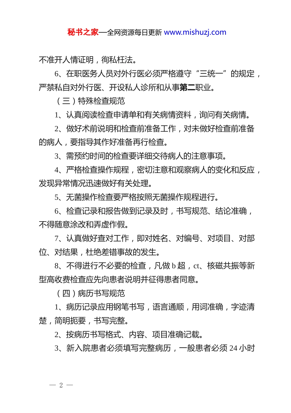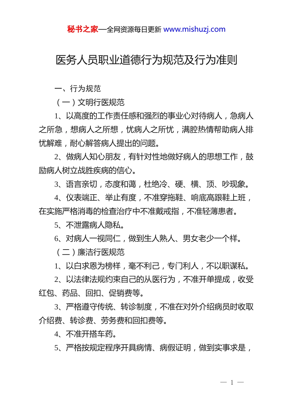 秘书之家—全网资源每日更新 www.mishuzj.com医务人员职业道德行为规范及行为准则一、行为规范(一)文明行医规范1、以高度的工作责任感和强烈的事业心对待病人,急病人之所急,想病人之所想,忧病人之所忧,满腔热情帮助病人排忧解难,耐心解答病人提出的问题。2、做病人知心朋友,有针对性地做好病人的思想工作,鼓励病人树立战胜疾病的信心。3、语言亲切,态度和蔼,杜绝冷、硬、横、顶、吵现象。4、仪表端正、举止有度,不准穿拖鞋、响底高跟鞋上班,在实施严格消毒的检查治疗中不准戴戒指,不准轻薄患者。5、不泄露病人隐私。6、对病人一视同仁,做到生人熟人、男女老少一个样。(二)廉洁行医规范1、以白求恩为榜样,毫不利己,专门利人,不以职谋私。2、以法律法规约束自己的从医行为,不准开单提成,收受红包、药品、回扣、促销费等。3、严格遵守传统、转诊制度,不准在对外介绍病员时收取介绍费、转诊费、劳务费和回扣费等。4、不准开搭车药。5、严格按规定程序开具病情、病假证明,做到实事求是,— 1 —秘书之家—全网资源每日更新 www.mishuzj.com不准开人情证明,徇私枉法。6、在职医务人员对外行医必须严格遵守“三统一”的规定,严禁私自对外行医、开设私人诊所和从事第二职业。(三)特殊检查规范1、认真阅读检查申请单和有关病情资料,询问有关病情。2、做好术前说明和检查前准备工作,对未做好检查前准备的病人,要指导其作好准备再行检查。3、需预约时间的检查要详细交待病人的注意事项。4、严格检查操作规程,密切注意和观察病人的变化和反应,发现异常情况迅速做好有关处理。5、无菌操作检查要严格按照无菌操作规程进行。6、检查记录和报告做到记录及时,书写规范、结论准确,不得随意涂改和弄虚作假。7、认真做好查对工作,即对姓名、对编号、对项目、对部位、对结果,杜绝差错事故的发生。8、不得进行不必要的检查,凡做 b 超,ct、核磁共振等新型高收费检查应先向患者说明并征得患者同意。(四)病历书写规范1、病历记录应用钢笔书写,语言通顺,用词准确,字迹清楚,简明扼要,书写完整。2、按病历书写格式、内容、项目准确记载。3、新入院患者必须填写完整病历,一般患者必须 24 小时— 2 —秘书之家—全网资源每日更新 www.mishuzj.com内完成,急诊应即刻检查填写。4、病程记录一般每天记录一次,重危病人和骤然恶化病应随时记录。5、手术病人应将术前准备、讨论、手术记录、麻醉记录、术后总结详细填入病程记录。6、凡会诊、移交、转诊、转科或转院病人,要及时做好会诊、交班、转诊、转科或转院记录,并按规定程序签字。7、各种检查回报单应按顺序及时粘贴,各种病情介绍单或诊断证明书附好于病历上。8、出院总结或死亡记录应按规定内容当日完成。9、病历书写不得删改、倒填、剪贴和弄虚作假。(五)治疗规范1、根据患者病情需要采取合理、准确、有效的治疗手段和方案。2、特殊治疗要做好治疗前的准备工作。对未做好治疗前准备工作的,不得草率进行特殊治疗。3、治疗前认真做好查对姓名、诊断、治疗方式、项目和施术部位。4、严格治疗操作规程,密切注意观察病人变化和反应,发现异常情况,迅速作出相关处理。5、无菌治疗必须严格遵守无菌原则,穿戴隔离衣、鞋、帽、口罩和手套。— 3 —秘书之家—全网资源每日更新 www.mishuzj.com6、手术病人时,严格遵守手术室工作制度,进行体腔和深部组织手术,要在术前与缝合前清点所有敷料和器械数。7、合理用药,不准乱开处方和开大处方,保健性或营养滋补性等自费性药品用药应征得患者同意,避免造成病人不应有的经济负担。8、准确用药,认真做好三查七对工作。(六)药剂调配规范1、药剂调配人员收方后要对处方内容、病人姓名、年龄、药品名称、剂型、服用方法、禁忌等详加审查后方能调配。2、对配方处方事项,按“处方制度和规范”规定执行。3、遵守调配技术常规和药剂调配操作规程,称量准确,不得估计取药,调配西药方剂时严禁用手直接接触药物。4、调配含有毒药、限剧药、麻醉药和放射性药品严格按毒、限剧药管理制度及国家有关管理麻醉药品、放射性药品规定办理。5、保证药品质量。配方...