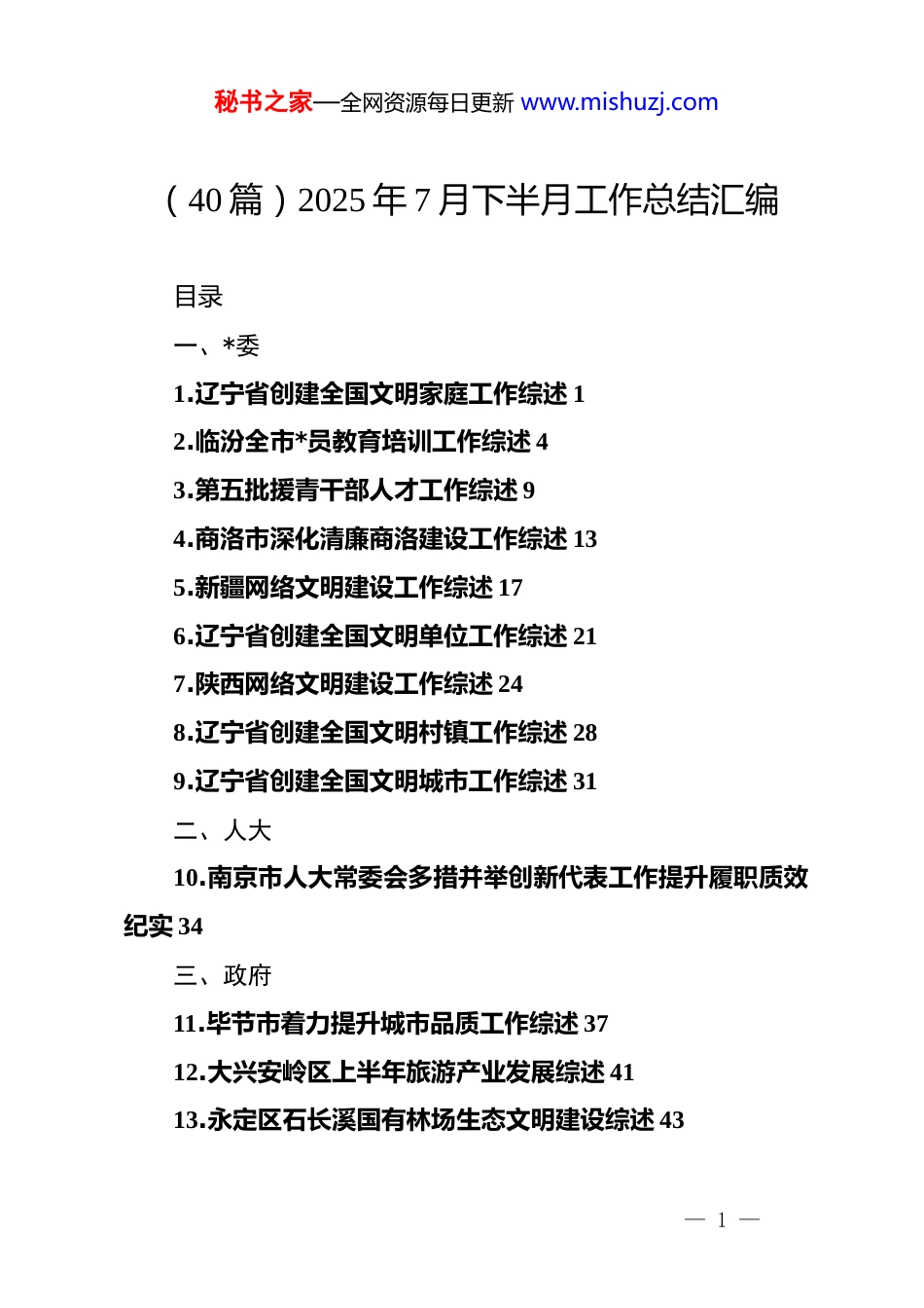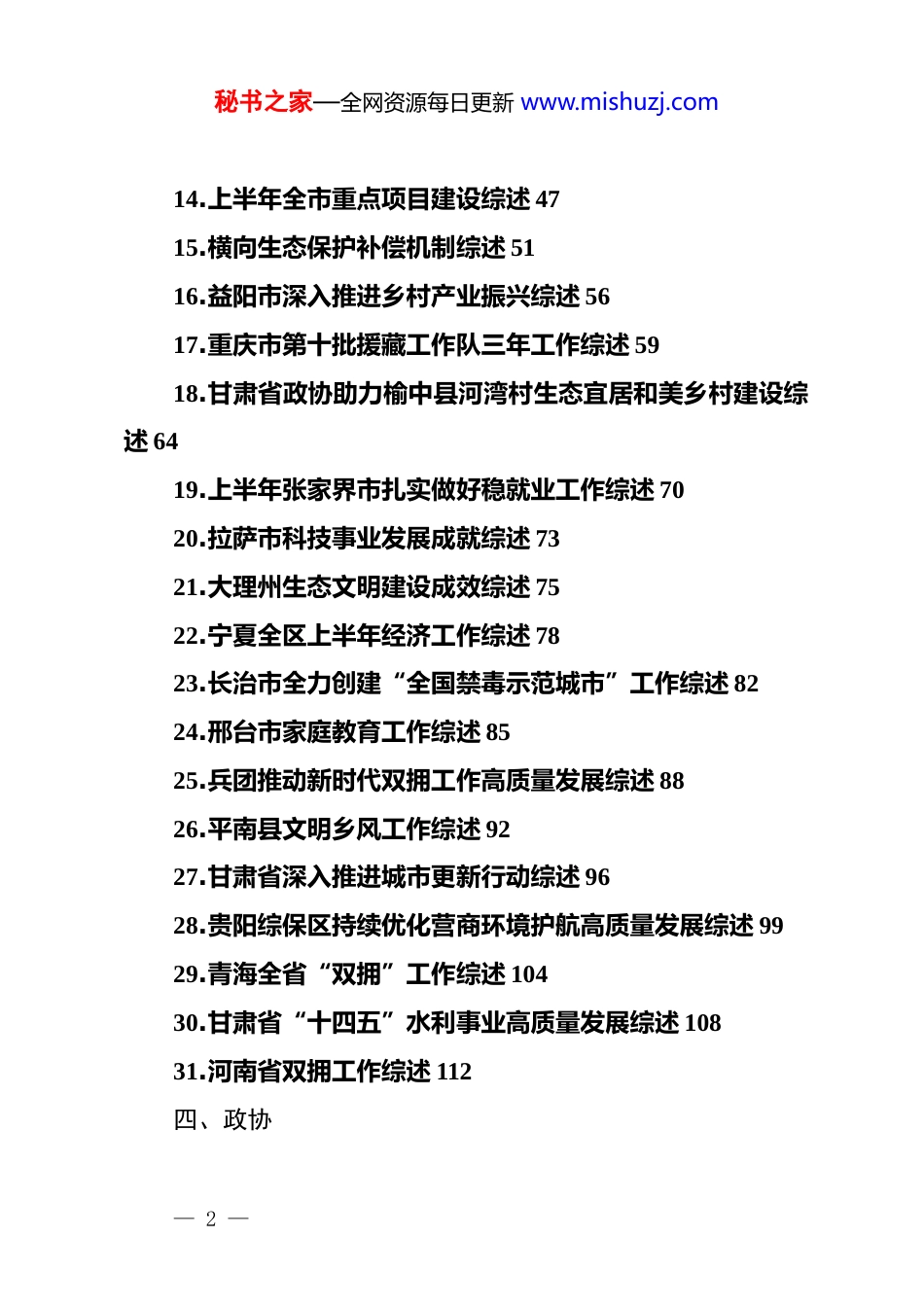 秘书之家—全网资源每日更新 www.mishuzj.com(40 篇)2025 年 7 月下半月工作总结汇编目录一、*委1.辽宁省创建全国文明家庭工作综述 12.临汾全市*员教育培训工作综述 43.第五批援青干部人才工作综述 94.商洛市深化清廉商洛建设工作综述 135.新疆网络文明建设工作综述 176.辽宁省创建全国文明单位工作综述 217.陕西网络文明建设工作综述 248.辽宁省创建全国文明村镇工作综述 289.辽宁省创建全国文明城市工作综述 31二、人大10.南京市人大常委会多措并举创新代表工作提升履职质效纪实 34三、政府11.毕节市着力提升城市品质工作综述 3712.大兴安岭区上半年旅游产业发展综述 4113.永定区石长溪国有林场生态文明建设综述 43— 1 —秘书之家—全网资源每日更新 www.mishuzj.com14.上半年全市重点项目建设综述 4715.横向生态保护补偿机制综述 5116.益阳市深入推进乡村产业振兴综述 5617.重庆市第十批援藏工作队三年工作综述 5918.甘肃省政协助力榆中县河湾村生态宜居和美乡村建设综述 6419.上半年张家界市扎实做好稳就业工作综述 7020.拉萨市科技事业发展成就综述 7321.大理州生态文明建设成效综述 7522.宁夏全区上半年经济工作综述 7823.长治市全力创建“全国禁毒示范城市”工作综述 8224.邢台市家庭教育工作综述 8525.兵团推动新时代双拥工作高质量发展综述 8826.平南县文明乡风工作综述 9227.甘肃省深入推进城市更新行动综述 9628.贵阳综保区持续优化营商环境护航高质量发展综述 9929.青海全省“双拥”工作综述 10430.甘肃省“十四五”水利事业高质量发展综述 10831.河南省双拥工作综述 112四、政协— 2 —秘书之家—全网资源每日更新 www.mishuzj.com32.河南省加强和改进人民政协工作综述 11833.全国政协二〇二五年上半年宏观经济形势分析座谈会综述 122五、政法34.长葛市推进综治中心规范化建设综述 126六、统战35.海勃湾区创建全国民族团结进步示范区工作综述 128七、群团36.宁夏红十字事业高质量发展五年综述 130八、企业37.国家电网公司 2025 年年中工作综述 13338.国家电投重组成立以来改革发展成就综述 13939.中央企业对口援藏助力西藏能源事业发展综述 14540.来宾市供销合作社推进全市系统社有企业改革综述 147家风蕴秀文明向新辽宁省创建全国文明家庭工作综述(2025 年 7 月 30 日)不久前在抚顺市雷锋纪念馆举行的一场活动,被 90 后女孩乔婷娇在朋友圈定格,收获满屏点赞。那是“重走雷锋路青春报国行”的启动仪式,当主持人念出“雷锋”二字时,2000 余— 3 —秘书之家—全网资源每日更新 www.mishuzj.com名学子齐声应答。乔婷娇为这震撼一幕配文:“雷锋精神永远年轻,我的爷爷乔安山讲了一辈子雷锋故事,我现在也走到哪里讲到哪里,让更多人接住这颗‘精神火种’。”建设好家庭、涵养好家教、传承好家风,乔安山家庭三代坚守,正是这句话的生动注脚。近年来,我省将全国文明家庭创建作为培育和践行社会主义核心价值观的有力抓手,把家庭文明建设作为提升社会文明程度的鲜活载体。在近日举行的全国精神文明建设表彰大会上,我省 22 个家庭荣获第三届全国文明家庭称号,与千万家庭一同汇入全省精神文明建设的闪亮星河,映照出文明温暖的模样。一、建好文明阵地文明家庭的故事,播撒文明星火,凝聚前行力量。要让“星火”可聚,阵地建设是关键,这既是优良家风落地生根的依托,也是家庭文明浸润人心的路径。不久前,沈阳市康平县新时代文明实践中心搭起“家风课堂”,第三届全国文明家庭代表张艳侠温情开讲。这个把“和”与“善”刻进日常的家庭,故事里没有惊天动地,却有家人间的互敬互爱、对邻里的热心帮扶、对学业的踏实追求这些带着温度的分享,像暖流沁入听众心里,让人真切触摸到家风的力量。— 4 —秘书之家—全网资源每日更新 www.mishuzj.com阵地育人、活动润心。如今在辽宁,这样的“家风课堂”已花开遍地。全省依托新时代文明实践中心(所、站)和各类群众活动阵地,常态化开展形式多样的家风家教主题活动;同时精心打造红色家风主题“教室”,以具象化场景强化示范引领,让家风故事在...