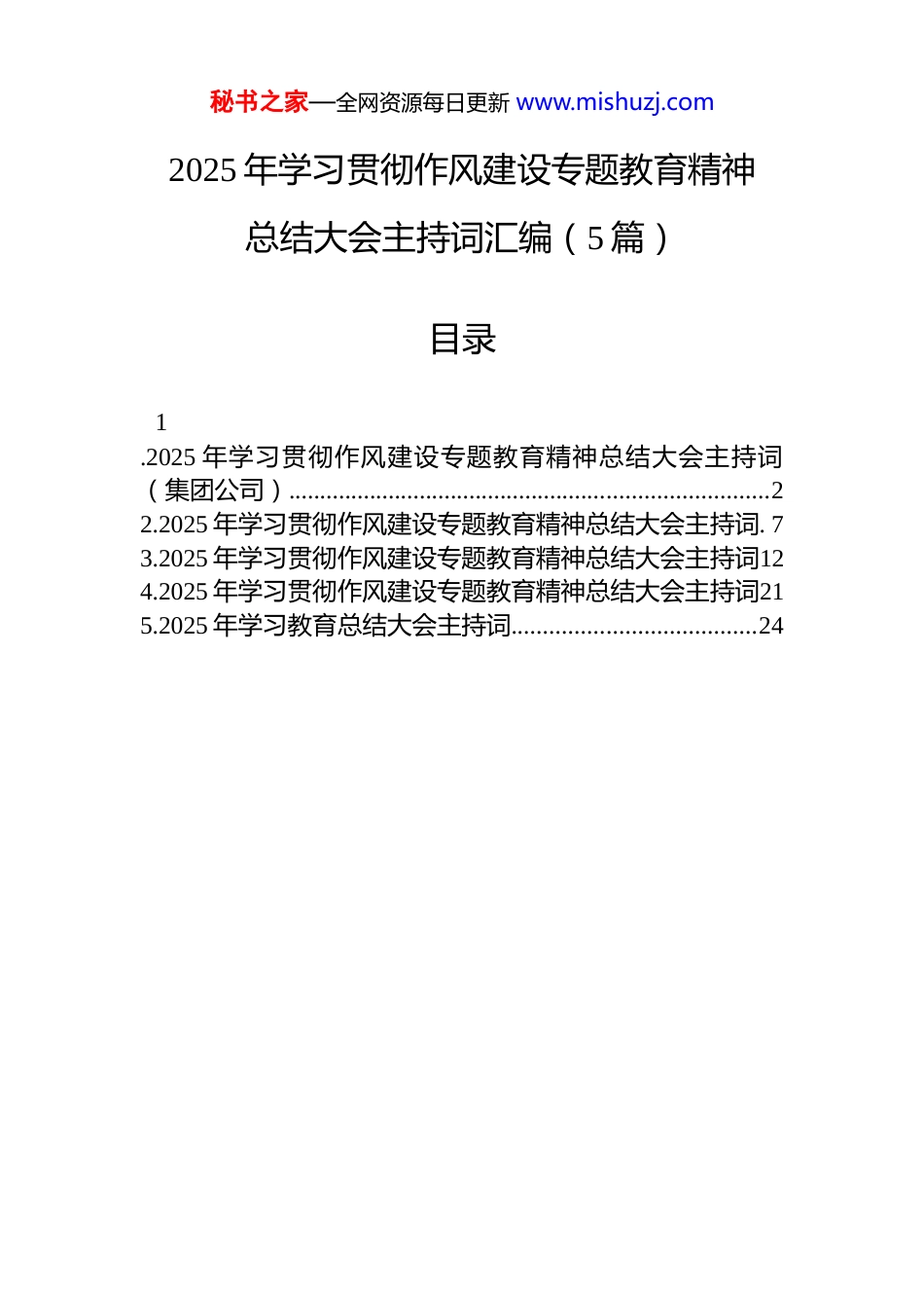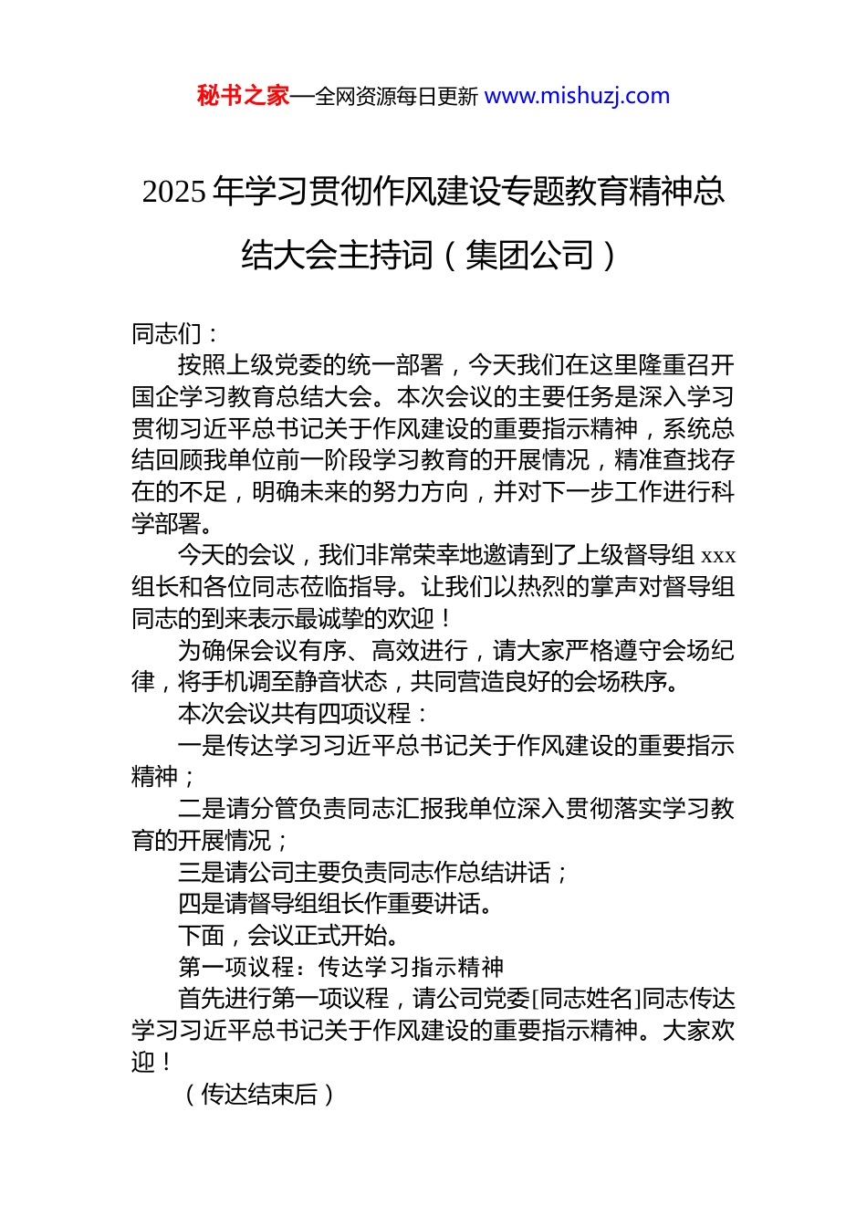 秘书之家—全网资源每日更新 www.mishuzj.com2025 年学习贯彻作风建设专题教育精神总结大会主持词汇编(5 篇)目录1.2025 年学习贯彻作风建设专题教育精神总结大会主持词(集团公司).............................................................................22.2025 年学习贯彻作风建设专题教育精神总结大会主持词. 73.2025 年学习贯彻作风建设专题教育精神总结大会主持词124.2025 年学习贯彻作风建设专题教育精神总结大会主持词215.2025 年学习教育总结大会主持词.......................................24秘书之家—全网资源每日更新 www.mishuzj.com2025 年学习贯彻作风建设专题教育精神总结大会主持词(集团公司)同志们:按照上级党委的统一部署,今天我们在这里隆重召开国企学习教育总结大会。本次会议的主要任务是深入学习贯彻习近平总书记关于作风建设的重要指示精神,系统总结回顾我单位前一阶段学习教育的开展情况,精准查找存在的不足,明确未来的努力方向,并对下一步工作进行科学部署。今天的会议,我们非常荣幸地邀请到了上级督导组 xxx组长和各位同志莅临指导。让我们以热烈的掌声对督导组同志的到来表示最诚挚的欢迎!为确保会议有序、高效进行,请大家严格遵守会场纪律,将手机调至静音状态,共同营造良好的会场秩序。本次会议共有四项议程:一是传达学习习近平总书记关于作风建设的重要指示精神;二是请分管负责同志汇报我单位深入贯彻落实学习教育的开展情况;三是请公司主要负责同志作总结讲话;四是请督导组组长作重要讲话。下面,会议正式开始。第一项议程:传达学习指示精神首先进行第一项议程,请公司党委[同志姓名]同志传达学习习近平总书记关于作风建设的重要指示精神。大家欢迎!(传达结束后)秘书之家—全网资源每日更新 www.mishuzj.com同志们,刚才[同志姓名]同志的传达系统全面、重点突出。习近平总书记关于作风建设的重要指示精神为我们指明了前进的方向,上级相关会议精神为我们提供了具体的工作遵循。希望大家会后结合实际进一步深入学习领会,把总书记的重要指示精神和上级党委的部署要求,作为当前和今后一个时期的重要政治任务,认真抓好贯彻落实。各部门、各党支部要把此次学习作为“第一议题”,组织专题学习讨论,真正做到学深悟透、入脑入心、落到实处。第二项议程:分管负责同志汇报工作情况下面进行第二项议程,请分管负责同志[同志姓名]同志汇报我单位 2025 年深入贯彻落实中央八项规定精神学习教育的开展情况。大家欢迎!(汇报结束后)感谢 xx 同志的详细汇报。汇报中既展现了我们在学习教育工作中取得的成绩亮点,也客观地指出了存在的不足和明确了改进方向,为我们接下来进一步做好相关工作提供了清晰的参考。第三项议程:主要负责同志总结讲话接下来进行第三项议程,请公司主要负责同志作总结讲话。大家欢迎!(讲话结束后)公司主要负责同志的讲话高屋建瓴、内涵丰富,全面总结了前一阶段学习教育工作,对存在的问题进行了深刻剖析,并对下一步工作提出了明确的目标和要求。我们要认真领会讲话精神,切实抓好贯彻落实。第四项议程:督导组组长讲话现在进行第四项议程,请督导组组长 xx 作重要讲话。大家欢迎!(讲话结束后)督导组组长的讲话对我们的学习教育工作给予了充分秘书之家—全网资源每日更新 www.mishuzj.com肯定,同时也提出了宝贵的意见和建议,为我们今后的工作指明了方向。我们要高度重视,认真落实督导组的要求,不断提升工作水平。会议收尾安排同志们,今天的会议四项议程已经全部完成。为了更好地抓好会议精神的贯彻落实,我再强调五点要求:一、提高政治站位,强化思想引领。深入贯彻落实中央八项规定精神是一项严肃的政治任务,我们要深刻认识到作风建设的重要性和紧迫性。全体干部职工要进一步增强“四个意识”、坚定“四个自信”、做到“两个维护”,不断提高政治判断力、政治领悟力、政治执行力,始终在思想上、政治上、行动上同以习近平同志为核心的党中央保持高度一致。二、细化任务分解,明确责任落实。各部门要根据公司主要负责同志的讲话要求和会议部署,结合自身实...