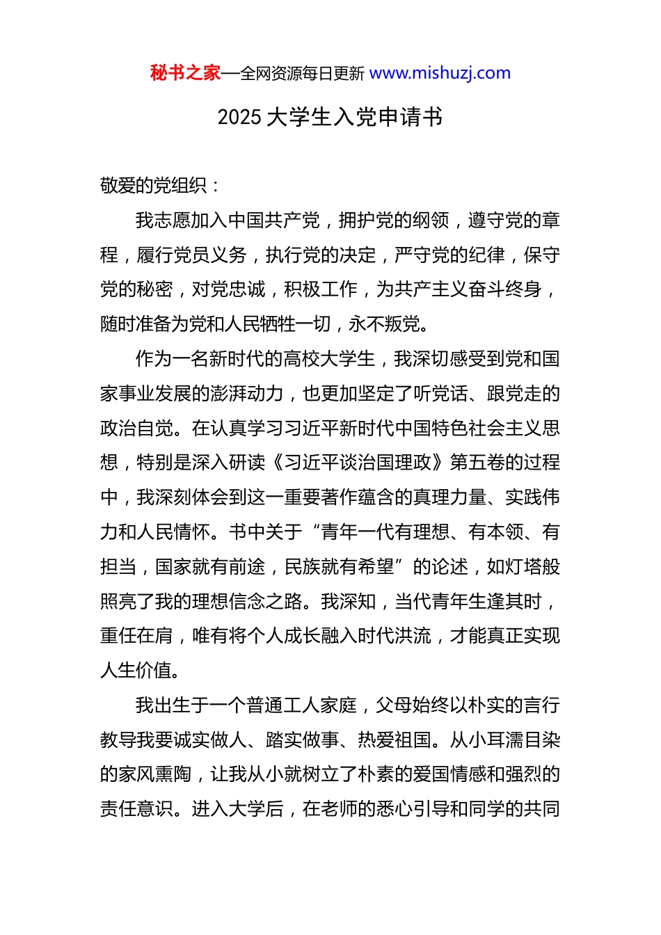 秘书之家—全网资源每日更新 www.mishuzj.com2025 大学生入党申请书 敬爱的党组织:我志愿加入中国共产党,拥护党的纲领,遵守党的章程,履行党员义务,执行党的决定,严守党的纪律,保守党的秘密,对党忠诚,积极工作,为共产主义奋斗终身,随时准备为党和人民牺牲一切,永不叛党。作为一名新时代的高校大学生,我深切感受到党和国家事业发展的澎湃动力,也更加坚定了听党话、跟党走的政治自觉。在认真学习习近平新时代中国特色社会主义思想,特别是深入研读《习近平谈治国理政》第五卷的过程中,我深刻体会到这一重要著作蕴含的真理力量、实践伟力和人民情怀。书中关于“青年一代有理想、有本领、有担当,国家就有前途,民族就有希望”的论述,如灯塔般照亮了我的理想信念之路。我深知,当代青年生逢其时,重任在肩,唯有将个人成长融入时代洪流,才能真正实现人生价值。我出生于一个普通工人家庭,父母始终以朴实的言行教导我要诚实做人、踏实做事、热爱祖国。从小耳濡目染的家风熏陶,让我从小就树立了朴素的爱国情感和强烈的责任意识。进入大学后,在老师的悉心引导和同学的共同秘书之家—全网资源每日更新 www.mishuzj.com进步中,我系统学习了党的基本理论知识,认真参加学校组织的党课培训,深入理解了党的性质、宗旨、纲领和使命。通过阅读《中国共产党章程》、学习党的百年奋斗重大成就和历史经验,我更加深刻地认识到:中国共产党是中国工人阶级的先锋队,同时是中国人民和中华民族的先锋队,是中国特色社会主义事业的领导核心,代表中国先进生产力的发展要求,代表中国先进文化的前进方向,代表中国最广大人民的根本利益。党的最高理想和最终目标是实现共产主义。在思想上,我始终坚持以党的创新理论武装头脑。我坚持用马克思主义立场、观点、方法观察分析问题,不断增强“四个意识”、坚定“四个自信”、做到“两个维护”,自觉在思想上政治上行动上同以习近平同志为核心的党中央保持高度一致。我主动关注国家大事,积极参与校园思想政治教育活动,认真聆听专家学者讲座,主动撰写心得体会,在实践中不断锤炼政治品格。在学习上,我始终保持严谨求实的态度,刻苦钻研专业知识,连续三年获得校级奖学金,专业成绩稳居前列。我深知,青年学生的首要任务是练好本领。只有掌握过硬的知识技能,才能在未来服务社会、报效国家时拥有坚实支撑。因此,我不仅注重课堂学习,还积极参加科研项秘书之家—全网资源每日更新 www.mishuzj.com目、学科竞赛和学术交流活动,努力提升综合素质。在生活上,我严于律己,团结同学,乐于助人。作为班级团支部宣传委员,我主动承担起组织主题团日活动、宣传党的政策、传递正能量的任务,协助老师完成各项事务性工作。在志愿服务中,我多次参与社区疫情防控值守、关爱留守儿童支教、校园环境整治等公益活动,用实际 行 动 践 行 “ 奉 献 、 友 爱 、 互 助 、 进 步 ” 的 志 愿 精神。2023 年暑期,我报名参加“三下乡”社会实践,深入革命老区开展党史宣讲与乡村振兴调研,走访农户 30 余户,撰写调研报告被校团委评为优秀成果,进一步增强了我对基层群众的感情和对国家战略的理解。在实践中,我深刻认识到,共产党员不仅是一种身份,更是一份沉甸甸的责任。他们冲锋在前、甘于奉献,在疫情防控一线、抗震救灾现场、脱贫攻坚战场上留下了一道道闪亮的身影。正是这些平凡而伟大的身影,让我一次次受到心灵震撼,也让我萌生了加入党组织的强烈愿望。我渴望成为其中一员,把青春奋斗融入党和人民事业之中,用实际行动诠释新时代青年的责任与担当。如果党组织批准我的申请,我将以此为新的起点,更加严格地要求自己,自觉接受组织的教育和监督,认真履行党员义务,积极参加组织生活,虚心听取群众意见,勇秘书之家—全网资源每日更新 www.mishuzj.com于开展批评与自我批评,努力在学习、工作和生活中发挥先锋模范作用,不辜负组织的信任。如果暂时未能被接纳,我也绝不气馁,将继续以党员的标准对照自己,查找不足,改进提高,继续以饱满的热情向党组织靠拢,争取早日成为一名合格的共产党员。请党组织在实践中考验我!此致敬礼!申请人:XXX2025 年 4 月 5 日