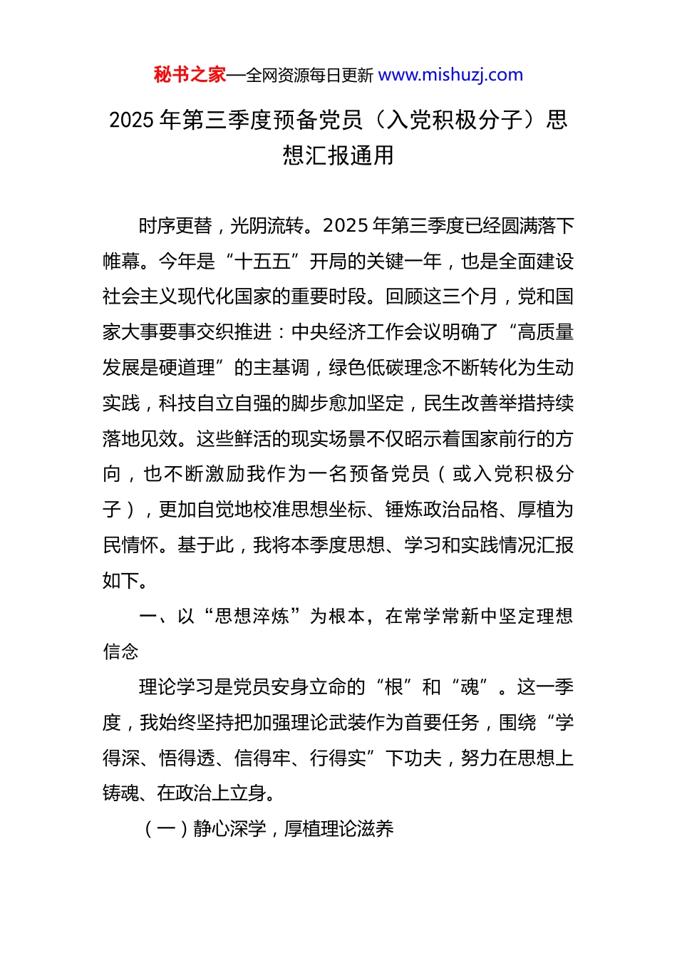 秘书之家—全网资源每日更新 www.mishuzj.com2025 年第三季度预备党员(入党积极分子)思想汇报通用 时序更替,光阴流转。2025 年第三季度已经圆满落下帷幕。今年是“十五五”开局的关键一年,也是全面建设社会主义现代化国家的重要时段。回顾这三个月,党和国家大事要事交织推进:中央经济工作会议明确了“高质量发展是硬道理”的主基调,绿色低碳理念不断转化为生动实践,科技自立自强的脚步愈加坚定,民生改善举措持续落地见效。这些鲜活的现实场景不仅昭示着国家前行的方向,也不断激励我作为一名预备党员(或入党积极分子),更加自觉地校准思想坐标、锤炼政治品格、厚植为民情怀。基于此,我将本季度思想、学习和实践情况汇报如下。一、以“思想淬炼”为根本,在常学常新中坚定理想信念理论学习是党员安身立命的“根”和“魂”。这一季度,我始终坚持把加强理论武装作为首要任务,围绕“学得深、悟得透、信得牢、行得实”下功夫,努力在思想上铸魂、在政治上立身。(一)静心深学,厚植理论滋养秘书之家—全网资源每日更新 www.mishuzj.com我把原原本本研读党的创新理论作为首要途径,坚持逐字逐句研读《习近平新时代中国特色社会主义思想学习纲要》《习近平著作选读》等核心教材。在学习过程中,我不仅注重理解字句,更注重把握贯穿其中的世界观和方法论。例如,在学习“中国式现代化”的战略部署时,我深刻体悟到这是立足中国国情的系统回答,是实现民族复兴的唯一正确道路。这种理论上的醍醐灌顶,使我在纷繁复杂的现实中更能把握根本方向。(二)对标笃行,把准政治方向学习不是抽象的,而是要结合党章党规和党员标准去对标检视。我以“两个结合”为指针,把“六个必须坚持”作为校准思想行动的“航标”,认真反思自己在思想深度、政治敏锐性、群众工作意识等方面的差距,明确了提升方向。通过这种学思结合,我深切认识到:政治上的坚定离不开理论上的清醒,思想上的成熟离不开常态化的自我审视。(三)融入集体,增强思想共鸣我主动参与支部的集中学习、专题研讨和交流分享,不仅在集体学习中开阔视野、增进理解,更在思想碰撞中凝聚共识。与同志们的相互启发,让我深切体会到理论学习的真正价值不在于“独善其身”,而在于形成“群体共秘书之家—全网资源每日更新 www.mishuzj.com振”,共同把思想统一到党中央的决策部署上来。(四)紧扣时政,做到知行合一我密切关注党中央最新决策和时事要闻,尤其是中央经济工作会议对经济运行的总体判断,以及绿色低碳、科技创新、民生保障等方面的新部署。把这些精神与日常学习相结合,使我在思想上更加清晰“往哪走”,在行动上更加坚定“怎么做”。当我看到民生保障不断扩面、公共服务不断优化的新闻时,愈加体悟到“江山就是人民、人民就是江山”的政治逻辑。通过这一系列学习,我深刻感受到,理论学习不是纸上谈兵,而是校准政治立场、增强政治能力的根本途径。只有在常学常新中不断淬炼,才能在大是大非面前立得稳、在风浪考验中站得住。二、以“本领提升”为关键,在知行互促中锤炼过硬担当青年党员的价值,不在于一纸誓言,而在于真刀真枪的能力本领。面对新时代赋予的重任,我始终牢记“打铁必须自身硬”的要求,坚持把提升能力作为修身立业的根本功课,在学习积累、实践锻炼、思考反思中不断进步。(一)勤学善思,拓宽知识半径我注重将专业学习与综合素养提升结合起来,把政治秘书之家—全网资源每日更新 www.mishuzj.com理论学习与业务学习相统一。既认真钻研本领域的基础知识和前沿成果,也广泛涉猎经济社会、科技创新、公共管理等方面的新观点、新材料。通过这种“点与面”结合的学习,我不仅增强了理论功底,更在思维方式上开阔了格局,懂得从全局出发去观察和分析问题。(二)知行并进,提升实践本领学习的目的在于运用。我主动把所学知识与日常实践结合起来,善于在服务群众、解决问题、参与集体任务的过程中锤炼本领。无论是参与志愿服务、协助社会治理,还是在集体工作中承担责任,我都力求做到“事事有回应、件件见成效”。通过实践磨炼,我更加懂得:理论不落实等于空谈,能力不经受考验等于虚设。(...