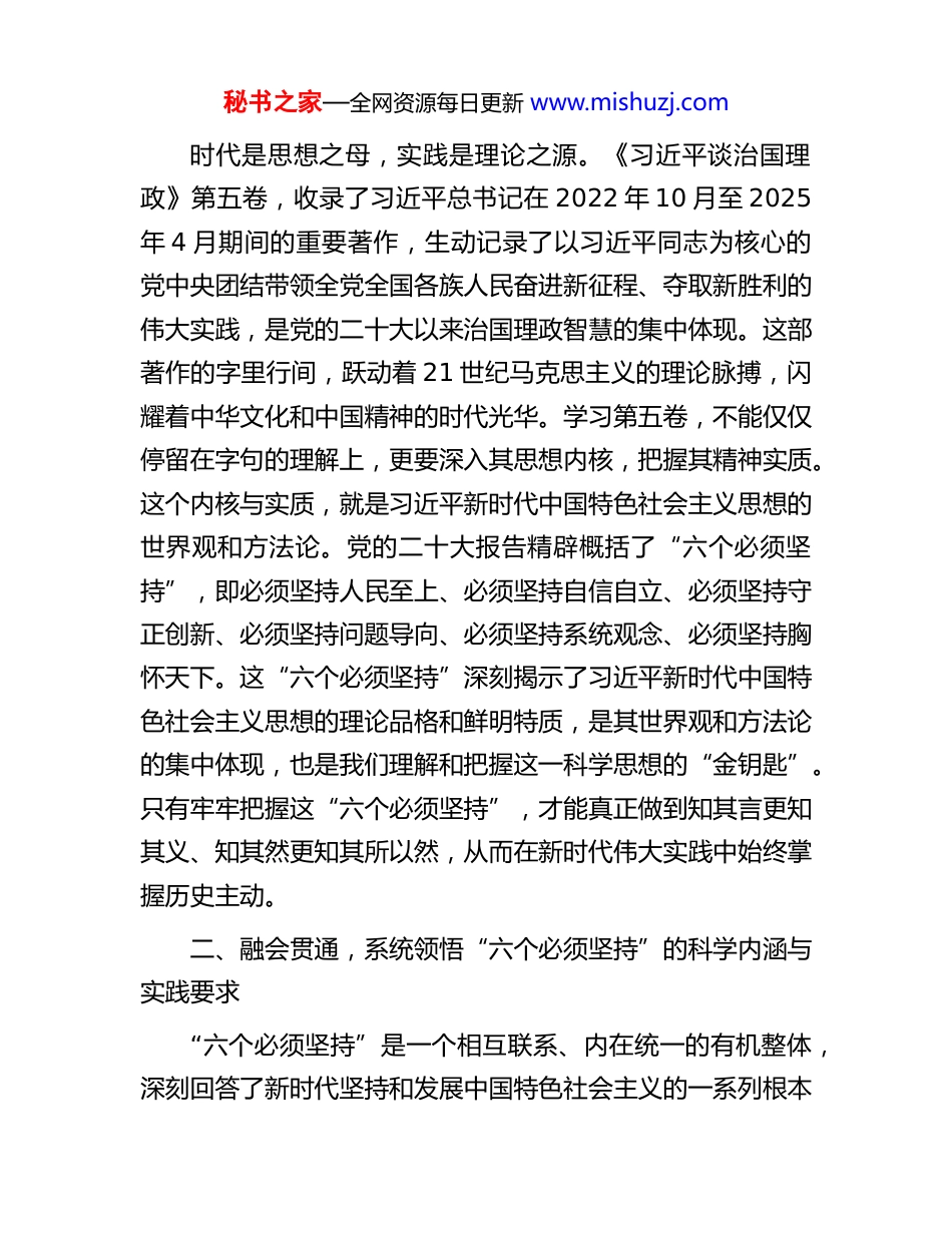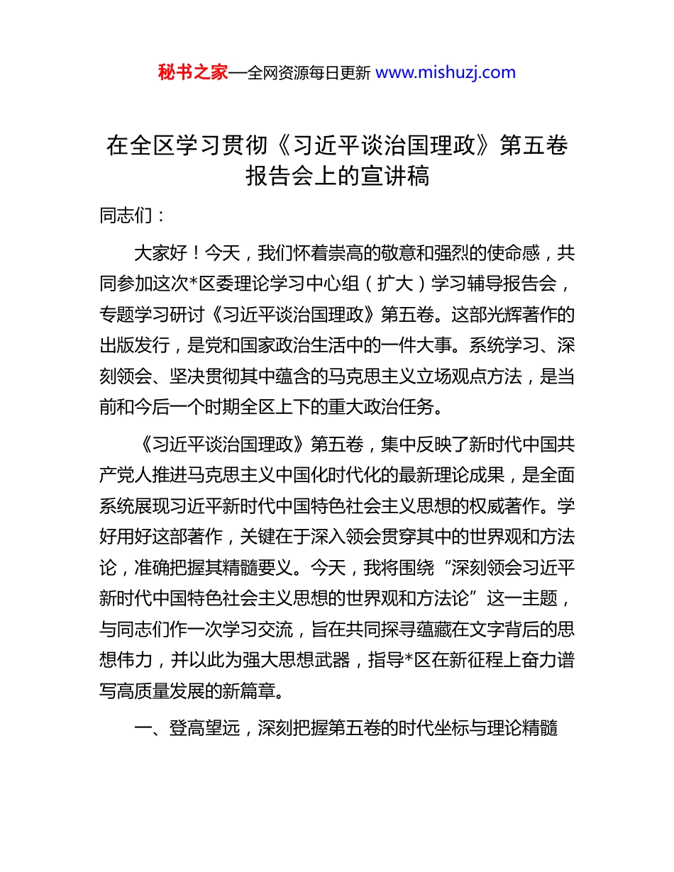秘书之家—全网资源每日更新 www.mishuzj.com在全区学习贯彻《习近平谈治国理政》第五卷报告会上的宣讲稿同志们:大家好!今天,我们怀着崇高的敬意和强烈的使命感,共同参加这次*区委理论学习中心组(扩大)学习辅导报告会,专题学习研讨《习近平谈治国理政》第五卷。这部光辉著作的出版发行,是党和国家政治生活中的一件大事。系统学习、深刻领会、坚决贯彻其中蕴含的马克思主义立场观点方法,是当前和今后一个时期全区上下的重大政治任务。《习近平谈治国理政》第五卷,集中反映了新时代中国共产党人推进马克思主义中国化时代化的最新理论成果,是全面系统展现习近平新时代中国特色社会主义思想的权威著作。学好用好这部著作,关键在于深入领会贯穿其中的世界观和方法论,准确把握其精髓要义。今天,我将围绕“深刻领会习近平新时代中国特色社会主义思想的世界观和方法论”这一主题,与同志们作一次学习交流,旨在共同探寻蕴藏在文字背后的思想伟力,并以此为强大思想武器,指导*区在新征程上奋力谱写高质量发展的新篇章。一、登高望远,深刻把握第五卷的时代坐标与理论精髓秘书之家—全网资源每日更新 www.mishuzj.com时代是思想之母,实践是理论之源。《习近平谈治国理政》第五卷,收录了习近平总书记在 2022 年 10 月至 2025年 4 月期间的重要著作,生动记录了以习近平同志为核心的党中央团结带领全党全国各族人民奋进新征程、夺取新胜利的伟大实践,是党的二十大以来治国理政智慧的集中体现。这部著作的字里行间,跃动着 21 世纪马克思主义的理论脉搏,闪耀着中华文化和中国精神的时代光华。学习第五卷,不能仅仅停留在字句的理解上,更要深入其思想内核,把握其精神实质。这个内核与实质,就是习近平新时代中国特色社会主义思想的世界观和方法论。党的二十大报告精辟概括了“六个必须坚持”,即必须坚持人民至上、必须坚持自信自立、必须坚持守正创新、必须坚持问题导向、必须坚持系统观念、必须坚持胸怀天下。这“六个必须坚持”深刻揭示了习近平新时代中国特色社会主义思想的理论品格和鲜明特质,是其世界观和方法论的集中体现,也是我们理解和把握这一科学思想的“金钥匙”。只有牢牢把握这“六个必须坚持”,才能真正做到知其言更知其义、知其然更知其所以然,从而在新时代伟大实践中始终掌握历史主动。二、融会贯通,系统领悟“六个必须坚持”的科学内涵与实践要求“六个必须坚持”是一个相互联系、内在统一的有机整体,深刻回答了新时代坚持和发展中国特色社会主义的一系列根本秘书之家—全网资源每日更新 www.mishuzj.com性问题,为我们认识世界、改造世界提供了强大的思想武器。第一,必须坚持人民至上,这是我们党的根本立场和价值旨归。“江山就是人民,人民就是江山。”习近平总书记的这一重要论断,深刻阐明了中国共产党的执政理念和价值追求。《习近平谈治国理政》第五卷通篇贯穿着一条鲜明的红线,那就是“人民”二字。无论是擘画中国式现代化的宏伟蓝图,还是部署区域协调发展的重大战略;无论是推动全面深化改革,还是推进全面从严治党,其出发点和落脚点,都是为了让人民过上好日子。坚持人民至上,就是要把人民放在心中最高位置,把人民对美好生活的向往作为奋斗目标,始终与人民风雨同舟、与人民心心相印,想人民之所想,行人民之所嘱,不断把惠民生、暖民心、顺民意的工作做到群众心坎上。这一立场观点,要求我们在制定政策、推动工作时,必须始终进行价值拷问:我们的决策是否符合最广大人民的根本利益?我们的行动是否能为人民群众带来实实在在的获得感、幸福感、安全感?第二,必须坚持自信自立,这是我们立党立国、成就伟业的精神之基。百余年来,中国共产党领导人民走出的中国特色社会主义道路,不是从天上掉下来的,也不是从书本上抄来的,更不是从别的国家照搬来的,而是在中国的土地上生长出来的。这种独立自主的探索精神和坚定不移的道路自信,正是自信自立的生动体现。坚持自信自立,就是要坚定“四个自信”,坚持把国家和民族发展放在自己力量的基点上,把中国发展进步秘书之家—全网资源每日更新 www.mishuzj.com的命运牢牢...
