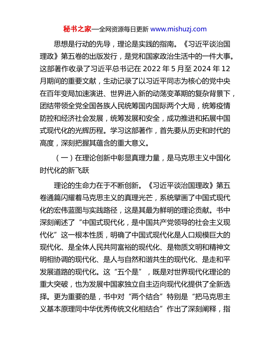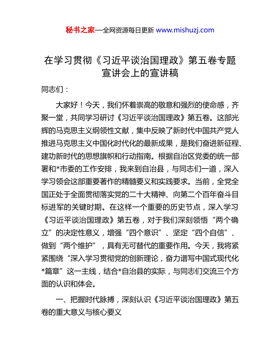 秘书之家—全网资源每日更新 www.mishuzj.com在学习贯彻《习近平谈治国理政》第五卷专题宣讲会上的宣讲稿同志们:大家好!今天,我们怀着崇高的敬意和强烈的使命感,齐聚一堂,共同学习研讨《习近平谈治国理政》第五卷。这部光辉的马克思主义纲领性文献,集中反映了新时代中国共产党人推进马克思主义中国化时代化的最新成果,是我们奋进新征程、建功新时代的思想旗帜和行动指南。根据自治区党委的统一部署和*市委的工作安排,我来到自治县,与同志们一道,深入学习领会这部重要著作的精髓要义和实践要求。当前,全党全国正处于全面贯彻落实党的二十大精神、向第二个百年奋斗目标进军的关键时期。在这样一个重要的历史节点,深入学习《习近平谈治国理政》第五卷,对于我们深刻领悟“两个确立”的决定性意义,增强“四个意识”、坚定“四个自信”、做到“两个维护”,具有无可替代的重要作用。今天,我将紧紧围绕“深入学习贯彻党的创新理论,奋力谱写中国式现代化*篇章”这一主线,结合*自治县的实际,与同志们交流三个方面的认识和体会。一、把握时代脉搏,深刻认识《习近平谈治国理政》第五卷的重大意义与核心要义秘书之家—全网资源每日更新 www.mishuzj.com思想是行动的先导,理论是实践的指南。《习近平谈治国理政》第五卷的出版发行,是党和国家政治生活中的一件大事。这部著作收录了习近平总书记在 2022 年 5 月至 2024 年 12月期间的重要文献,生动记录了以习近平同志为核心的党中央在百年变局加速演进、世界进入新的动荡变革期的复杂背景下,团结带领全党全国各族人民统筹国内国际两个大局,统筹疫情防控和经济社会发展,统筹发展和安全,成功推进和拓展中国式现代化的光辉历程。学习这部著作,首先要从历史和时代的高度,深刻把握其蕴含的重大意义。(一)在理论创新中彰显真理力量,是马克思主义中国化时代化的新飞跃理论的生命力在于不断创新。《习近平谈治国理政》第五卷通篇闪耀着马克思主义的真理光芒,系统擘画了中国式现代化的宏伟蓝图与实践路径,这是其最为鲜明的理论贡献。书中深刻阐述了“中国式现代化,是中国共产党领导的社会主义现代化”这一根本性质,明确了中国式现代化是人口规模巨大的现代化、是全体人民共同富裕的现代化、是物质文明和精神文明相协调的现代化、是人与自然和谐共生的现代化、是走和平发展道路的现代化。这“五个是”,既是对世界现代化理论的重大突破,也为发展中国家独立自主迈向现代化提供了全新选择。更为重要的是,书中对“两个结合”特别是“把马克思主义基本原理同中华优秀传统文化相结合”作出了深刻阐释,指秘书之家—全网资源每日更新 www.mishuzj.com出这是“又一次的思想解放”。这一重大论断,揭示了中国特色社会主义道路根植于中华文明沃土的历史必然性,展现了中国共产党人在传承中华优秀传统文化中推进文化创新的高度自觉,为开辟马克思主义中国化时代化新境界打开了广阔空间。这不仅是理论上的重大突破,更是我们坚定文化自信、建设中华民族现代文明的根本遵循。(二)在战略擘画中展现宏大格局,是全面建设社会主义现代化国家的行动纲领《习近平谈治国理政》第五卷全书共 18 个专题,结构严谨,逻辑清晰。开篇即党的二十大报告,作为全书的总纲,系统阐明了新时代新征程中国共产党的使命任务。随后的专题,围绕经济、政治、文化、社会、生态、安全、外交、党建等领域展开,全面部署了推进中国式现代化的各项战略任务。从构建新发展格局、推动高质量发展,到发展全过程人民民主、推进法治中国建设;从建设社会主义文化强国,到增进民生福祉、提高人民生活品质;从推动绿色发展、促进人与自然和谐共生,到坚定不移贯彻总体国家安全观;再到开创中国特色大国外交新局面,直至最后强调“把党的自我革命进行到底”这一系列战略部署,构成了相互联系、相互促进的有机整体。它清晰地回答了“建设什么样的社会主义现代化强国、怎样建设社会主义现代化强国”这一时代课题,为我们各项工作提供了精准的“路线图”和“施工图”。秘书之家—全网资源每日更新 www.mishuzj.com(三)在风险应对中彰显斗争精神,是应对...