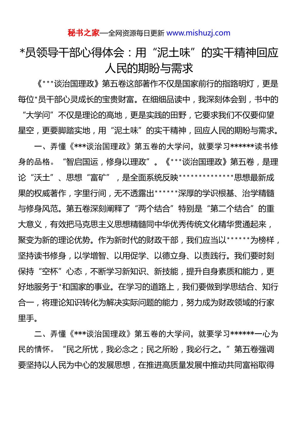 秘书之家—全网资源每日更新 www.mishuzj.com*员领导干部心得体会:用“泥土味”的实干精神回应人民的期盼与需求《***谈治国理政》第五卷这部著作不仅是国家前行的指路明灯,更是每位*员干部心灵成长的宝贵财富。在细细品读中,我深刻体会到,书中的“大学问”不仅是理论的高地,更是实践的田野,它要求我们不仅要仰望星空,更要脚踏实地,用“泥土味”的实干精神,回应人民的期盼与需求。一、弄懂《***谈治国理政》第五卷的大学问,就要学习******读书修身的品格。“智启国运,修身以理政”。《***谈治国理政》第五卷,是理论“沃土”、思想“富矿”,是全面系统反映**************思想最新成果的权威著作,字里行间,无不透露出******深厚的学识根基、治学精髓与修身风范。第五卷深刻阐释了“两个结合”特别是“第二个结合”的重大意义,有效把马克思主义思想精髓同中华优秀传统文化精华贯通起来,聚变为新的理论优势。作为新时代的财政干部,我们应当以******为榜样,坚持读书修身,以学增智、以用促学、以德立身、以责践行。我们要时刻保持“空杯”心态,不断学习新知识、新技能,提升自身素质和能力,更好地服务于*和国家的事业。在学习的道路上,我们要做到学思结合、知行合一,将理论知识转化为解决实际问题的能力,努力成为财政领域的行家里手。二、弄懂《***谈治国理政》第五卷的大学问,就要学习******一心为民的情怀。“民之所忧,我必念之;民之所盼,我必行之。”第五卷强调要坚持以人民为中心的发展思想,在推进高质量发展中推动共同富裕取得秘书之家—全网资源每日更新 www.mishuzj.com更为明显的实质性进展,中国式现代化,民生为大。作为领导干部,我们应时刻铭记全心全意为人民服务的宗旨,将人民置于心中最高位置。在日常工作中,我们需躬身入局,深入田间地头,贴近群众生活,细心聆听他们的心声与诉求,将这些忧虑与期盼作为我们工作的出发点和落脚点。通过扎实的工作和不懈的努力,我们要以实际行动回应群众期盼,用真诚与实效赢得民众的信赖与支持。特别是在处理群众诉求时,我们应展现出亲切的态度,营造“笑迎、礼让、暖心”的氛围,细致入微地解决他们遇到的实际问题。即使面对暂时难以解决的困境,也要积极协调,确保信息透明,及时反馈,让群众感受到我们的真诚与决心。在推进乡村振兴的征途中,我们要像“庖丁解牛”般精准施策,深入一线掌握实情,调动各方资源,破除制约发展的瓶颈,确保乡村振兴工作取得实实在在的成效,让人民群众在看得见、摸得着的变化中深切感受到*和政府的关怀与温暖。三、弄懂《***谈治国理政》第五卷的大学问,就要学习******干事创业的担当。“天下兴亡,匹夫有责”。在《***谈治国理政》第五卷中,深刻描绘了以******为领航者的*中央,面对严峻复杂的国际环境和艰巨繁重的国内改革发展稳定任务,勇立潮头,直面时代性与历史性并存的巨大挑战,精妙布局,统筹国内国际两个大局,完整准确全面贯彻新发展理念,着力推动高质量发展,科学谋划和推动进一步全面深化改革,以中国式现代化全面推进强国建设、民族复兴伟业的壮丽步伐。深入研读此书,令人深切感受到******身体力行,以天下为己任,对“忠诚于*、清正廉洁、敢于担当”的崇高品质与责任担当这一崇高精神的深刻诠释与实践。当前,秘书之家—全网资源每日更新 www.mishuzj.com面对复杂多变的国内外形势和艰巨繁重的财政工作任务,我们要以******为榜样,勇于担当、敢于攻坚克难。要深入实际、调查研究,找准问题的症结所在,提出切实可行的解决方案。同时,我们还要勇于承担责任、敢于直面挑战,以实际行动践行初心使命。工作中,要不断创新工作方式方法,提高工作效率和质量,为经济社会发展提供坚实的财力保障。四、弄懂《***谈治国理政》第五卷的大学问,就要学习******敢于创新的能力。“创新是引领发展的第一动力。”第五卷深刻阐述了因地制宜发展新质生产力的重要论述,强调要统筹实施科教兴国战略、人才强国战略、创新驱动发展战略,一体推进教育发展、科技创新、人才培养。******多次强调创新的重要性,这不仅是对国家发展的战略部署,也是对每一位*员干部...