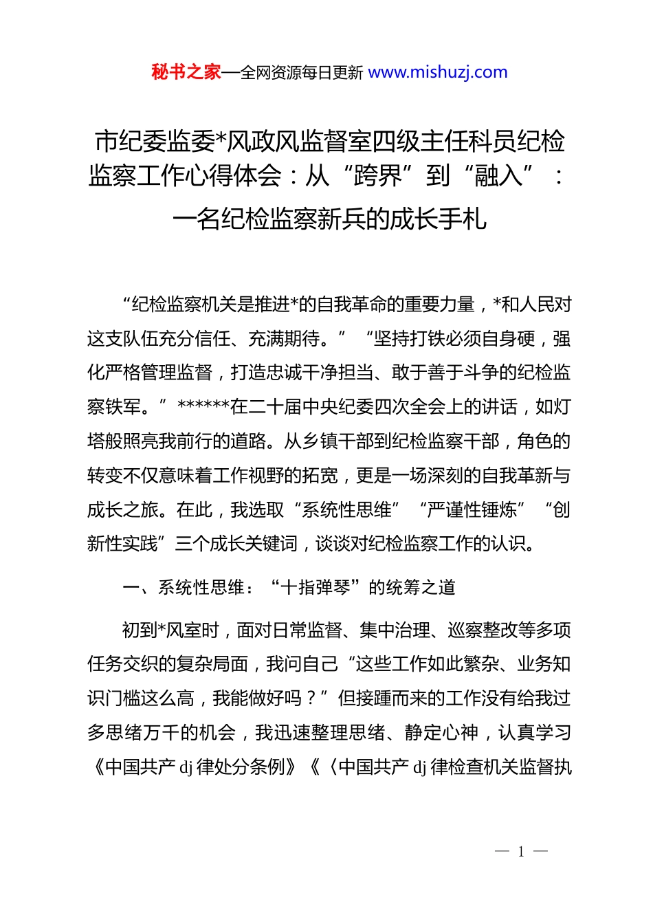 秘书之家—全网资源每日更新 www.mishuzj.com市纪委监委*风政风监督室四级主任科员纪检监察工作心得体会:从“跨界”到“融入”:一名纪检监察新兵的成长手札“纪检监察机关是推进*的自我革命的重要力量,*和人民对这支队伍充分信任、充满期待。”“坚持打铁必须自身硬,强化严格管理监督,打造忠诚干净担当、敢于善于斗争的纪检监察铁军。”******在二十届中央纪委四次全会上的讲话,如灯塔般照亮我前行的道路。从乡镇干部到纪检监察干部,角色的转变不仅意味着工作视野的拓宽,更是一场深刻的自我革新与成长之旅。在此,我选取“系统性思维”“严谨性锤炼”“创新性实践”三个成长关键词,谈谈对纪检监察工作的认识。一、系统性思维:“十指弹琴”的统筹之道初到*风室时,面对日常监督、集中治理、巡察整改等多项任务交织的复杂局面,我问自己“这些工作如此繁杂、业务知识门槛这么高,我能做好吗?”但接踵而来的工作没有给我过多思绪万千的机会,我迅速整理思绪、静定心神,认真学习《中国共产 dj 律处分条例》《〈中国共产 dj 律检查机关监督执— 1 —秘书之家—全网资源每日更新 www.mishuzj.com纪工作规则〉释义》等业务书籍,快速熟悉上级工作安排、本级工作计划、工作总结以及领导批示等相关文件材料,系统梳理各项工作重点,坚持干中学,学中干。在领导和同事的帮助指导下,我学会用系统性思维去审视和解决问题,将任务分解为小块,设定优先级,确保每一项工作都能有序推进,保证工作实效。比如,在推进群众身边不正之风和腐败问题集中整治过程中,无论是日常文件流转,还是汇总数据、统计报表,我学会从整体出发,把握工作规律和节奏,吃透工作流程,掌握内在联系,统筹管理、系统推进,用“十个手指弹钢琴”,确保各项工作任务圆满高效完成。二、严谨性锤炼:细节决定成败*风室的工作繁杂,每一项任务、每一份文件、每一张表格都逻辑严谨、互相关联,稍有疏忽就会影响全局,这不仅关乎个人责任,更关系到纪检监察工作的严肃性和权威性,我慢慢养成了谨慎对待工作中每个细节的习惯,对每一份文件、每一个数据都仔细反复核对,确保准确无误;在撰写报告、拟定方案时,力求语言精炼、逻辑清晰,避免出现任何可能的歧义或漏洞。除了工作上的严谨细致,纪检监察干部还需要在生活中时— 2 —秘书之家—全网资源每日更新 www.mishuzj.com刻慎独慎微、严于律己。记得第一次向周书记汇报工作时,周书记语重心长地告诉我:“纪检监察干部正己才能正人,我们的干部要带头守纪律讲规矩”。很多人说,纪委的干部都是带着放大镜来看*员干部的,喜欢找不足、查问题。其实,作为纪检监察干部,我们同样是被全社会带着显微镜监督的,大到守纪律讲规矩,小到一言一行,不仅代表自己,更代表纪检监察机关整体形象,稍有不慎,后果将不堪设想。作为一名年轻纪检监察干部,更要时刻严格要求自己,从生活的每一个细节做起,自觉净化生活圈、朋友圈、社交圈,违反纪律的事不做,违背原则的话不说,规规矩矩、干干净净。三、创新性实践:在挑战中寻找突破参与专项巡察是到市纪委工作后对我的第一次系统性历练,在市委第十轮巡察工作中,我深刻体会到了创新的重要性。这次专项巡察不同以往,被巡察单位涉及集中整治多个重点职能部门,面对有限的时间、海量的数据和复杂的线索,传统的工作方法显然不能很好地适应节奏。工作中,我们创新运用大数据分析、比对等方法,成功筛查出了多项问题线索,如通过追踪油卡使用时间节点,反向溯源,调取监控逐帧分析,精准发现一起违反中央八项规定精神“公卡私用”典型问题;通过大— 3 —秘书之家—全网资源每日更新 www.mishuzj.com数据比对分析,发现多个乡镇公立敬老院无政策依据将结存资金转入改制后的养老服务公司的问题,经过深入调查核实,成功追缴违规资金 400 余万元。这些创新实践不仅提高了工作效率,更让我和同事们在挑战中找到了突破方向。现在回头再看,有问题不怕,怕的是遇到问题绕着问题走几年的乡镇经历给了我直面困难的勇气和遇到问题攻坚克难的决心,六个月的纪检监察工作实践赋予我面对挑战的信心和勇气,也使我更深刻...