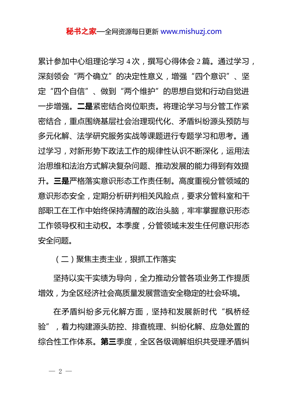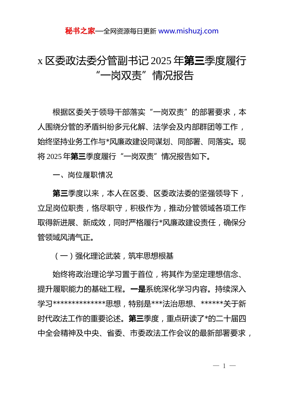 秘书之家—全网资源每日更新 www.mishuzj.comx 区委政法委分管副书记 2025 年第三季度履行“一岗双责”情况报告根据区委关于领导干部落实“一岗双责”的部署要求,本人围绕分管的矛盾纠纷多元化解、法学会及内部群团等工作,始终坚持业务工作与*风廉政建设同谋划、同部署、同落实。现将 2025 年第三季度履行“一岗双责”情况报告如下。一、岗位履职情况第三季度以来,本人在区委、区委政法委的坚强领导下,立足岗位职责,恪尽职守,积极作为,推动分管领域各项工作取得新进展、新成效,同时严格履行*风廉政建设责任,确保分管领域风清气正。(一)强化理论武装,筑牢思想根基始终将政治理论学习置于首位,将其作为坚定理想信念、提升履职能力的基础工程。一是系统深化学习内容。持续深入学习**************思想,特别是***法治思想、******关于新时代政法工作的重要论述。第三季度,重点研读了*的二十届四中全会精神及中央、省委、市委政法工作会议的最新部署要求,— 1 —秘书之家—全网资源每日更新 www.mishuzj.com累计参加中心组理论学习 4 次,撰写心得体会 2 篇。通过学习,深刻领会“两个确立”的决定性意义,增强“四个意识”、坚定“四个自信”、做到“两个维护”的思想自觉和行动自觉进一步增强。二是紧密结合岗位职责。将理论学习与分管工作紧密结合,重点围绕基层社会治理现代化、矛盾纠纷源头预防与多元化解、法学研究服务实战等课题进行专题学习和思考。通过学习,对新形势下政法工作的规律性认识不断深化,运用法治思维和法治方式解决复杂问题、推动发展的能力得到有效提升。三是严格落实意识形态工作责任制。高度重视分管领域的意识形态安全,定期分析研判相关风险点,要求分管科室和干部职工在工作中始终保持清醒的政治头脑,牢牢掌握意识形态工作领导权和主动权。本季度,分管领域未发生任何意识形态安全问题。(二)聚焦主责主业,狠抓工作落实坚持以实干实绩为导向,全力推动分管各项业务工作提质增效,为全区经济社会高质量发展营造安全稳定的社会环境。在矛盾纠纷多元化解方面,坚持和发展新时代“枫桥经验”,着力构建源头防控、排查梳理、纠纷化解、应急处置的综合性工作体系。第三季度,全区各级调解组织共受理矛盾纠— 2 —秘书之家—全网资源每日更新 www.mishuzj.com纷 1,258 件,调解成功 1,239 件,调解成功率达到 98.5%,涉及金额约 4,120 万元。与去年同期相比,受理案件数量增加了 8.2%,但成功率提升了 0.7 个百分点,体现了调解工作质效的稳步提升。工作呈现以下特点:第一,纠纷类型相对集中。从统计数据看,物业管理、劳资 争 议 、 婚 姻 家 庭 三 类 纠 纷 位 居 前 三 , 分 别 占 总 数 的21%、18%和 15%。这反映出当前城市化进程中社区治理、经济下行压力下劳动关系以及社会观念变迁带来的家庭关系等领域的矛盾较为突出。针对此情况,已指导区矛调中心联合住建、人社、妇联等部门,开展了 2 次专项排查和联合调解行动。第二,源头治理初见成效。深入推进“无讼社区(村)”创建活动,指导各镇(街道)完善社会矛盾风险评估预警机制。本季度,全区共排查出各类风险隐患 215 个,通过前置介入、主动调处,90%以上的隐患在萌芽状态得到化解,有效防止了“小矛盾”演变为“大问题”。第三,专业化调解能力增强。积极推动行业性、专业性人民调解委员会建设,本季度重点加强了在医疗、交通、知识产— 3 —秘书之家—全网资源每日更新 www.mishuzj.com权等领域的调解力量。例如,成功调处了一起涉及 xx 高新技术产业园区某企业与外地公司的软件著作权纠纷,避免了长期的诉讼过程,为企业挽回了近 500 万元的经济损失,保障了园区的良好营商环境。第四,智慧调解应用深化。依托市域社会治理现代化平台,积极推广线上“云调解”模式。第三季度,通过线上平台受理并成功调解纠纷 186 件,占总数的 14.8%,极大地方便了群众,提升了调解效率,这一做法顺应了全国范围内推广在线调解的趋势。在法学会工作方面,根据上级关于法学会工作应更加聚焦中心、服务大局的要求,本季度对...