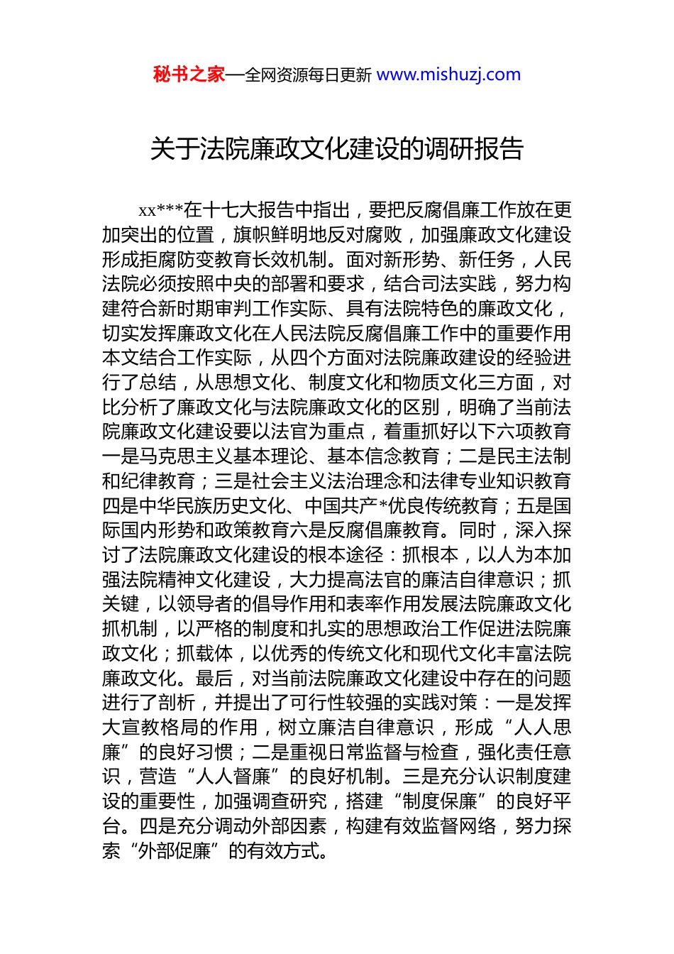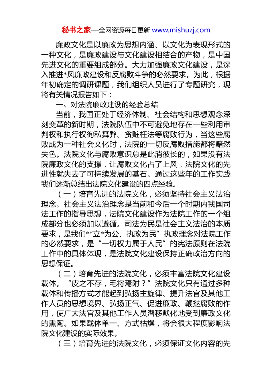 秘书之家—全网资源每日更新 www.mishuzj.com关于法院廉政文化建设的调研报告xx***在十七大报告中指出,要把反腐倡廉工作放在更加突出的位置,旗帜鲜明地反对腐败,加强廉政文化建设形成拒腐防变教育长效机制。面对新形势、新任务,人民法院必须按照中央的部署和要求,结合司法实践,努力构建符合新时期审判工作实际、具有法院特色的廉政文化,切实发挥廉政文化在人民法院反腐倡廉工作中的重要作用本文结合工作实际,从四个方面对法院廉政建设的经验进行了总结,从思想文化、制度文化和物质文化三方面,对比分析了廉政文化与法院廉政文化的区别,明确了当前法院廉政文化建设要以法官为重点,着重抓好以下六项教育一是马克思主义基本理论、基本信念教育;二是民主法制和纪律教育;三是社会主义法治理念和法律专业知识教育四是中华民族历史文化、中国共产*优良传统教育;五是国际国内形势和政策教育六是反腐倡廉教育。同时,深入探讨了法院廉政文化建设的根本途径:抓根本,以人为本加强法院精神文化建设,大力提高法官的廉洁自律意识;抓关键,以领导者的倡导作用和表率作用发展法院廉政文化抓机制,以严格的制度和扎实的思想政治工作促进法院廉政文化;抓载体,以优秀的传统文化和现代文化丰富法院廉政文化。最后,对当前法院廉政文化建设中存在的问题进行了剖析,并提出了可行性较强的实践对策:一是发挥大宣教格局的作用,树立廉洁自律意识,形成“人人思廉”的良好习惯;二是重视日常监督与检查,强化责任意识,营造“人人督廉”的良好机制。三是充分认识制度建设的重要性,加强调查研究,搭建“制度保廉”的良好平台。四是充分调动外部因素,构建有效监督网络,努力探索“外部促廉”的有效方式。秘书之家—全网资源每日更新 www.mishuzj.com廉政文化是以廉政为思想内涵、以文化为表现形式的一种文化,是廉政建设与文化建设相结合的产物,是中国先进文化的重要组成部分。大力加强廉政文化建设,是深入推进*风廉政建设和反腐败斗争的必然要求。为此,根据年初确定的调研课题,我们组织人员进行了专题研究,现将有关情况报告如下:一、对法院廉政建设的经验总结当前,我国正处于经济体制、社会结构和思想观念深刻变革的新时期,法院队伍中不可避免地存在一些利用审判权和执行权徇私舞弊、贪赃枉法等腐败行为,当这些腐败成为一种社会文化时,法院的一切反腐败措施都将黯然失色。法院文化与腐败意识总是此消彼长的,如果没有法院廉政文化的支撑,让腐败文化占了上风,法院文化的先进性就失去了可持续发展的基石。通过这些年的工作实践我们逐渐总结出法院文化建设的四点经验。(一)培育先进的法院文化,必须坚持社会主义法治理念。社会主义法治理念是当前和今后一个时期内我国司法工作的指导思想,法院文化建设作为法院工作的一个组成部分也必须加以遵循。司法为民是社会主义法治的本质要求,是我们*“立*为公、执政为民”执政理念对法院工作的必然要求,是“一切权力属于人民”的宪法原则在法院工作中的具体体现,是法院文化建设保持正确政治方向的思想保证。(二)培育先进的法院文化,必须丰富法院文化建设载体。“皮之不存,毛将焉附?”法院文化只有通过多种载体和传播方式才能起到弘扬主旋律、提升法官及其他工作人员的思想境界、弘扬正气、促进廉政、鞭挞腐败的作用,使广大法官及其他工作人员潜移默化地受到廉政文化的熏陶。如果载体单一、方式枯燥,将会很大程度影响法院文化建设的实际效果。(三)培育先进的法院文化,必须保证文化内容的先秘书之家—全网资源每日更新 www.mishuzj.com进性。通过各种艺术形式和传播方式,用先进的文化、先进的理念、先进的思想教育、熏陶广大法官及其他人员,使大家在获得知识、得到艺术享受的过程中不知不觉地受到廉政文化的教育,思想得到升华,充分发挥法官廉政文化在*风廉政建设和反腐败工作中的教育作用,以演讲、歌咏、书画展等为载体,对广大法官及其他工作人员进行廉政文化教育,使干警们在接受先进文化熏陶的同时,自觉形成“以廉为美、以廉为荣”的良好风尚。(四)培育先进的法院文化,必须充分认识制度建设的重要性。法...