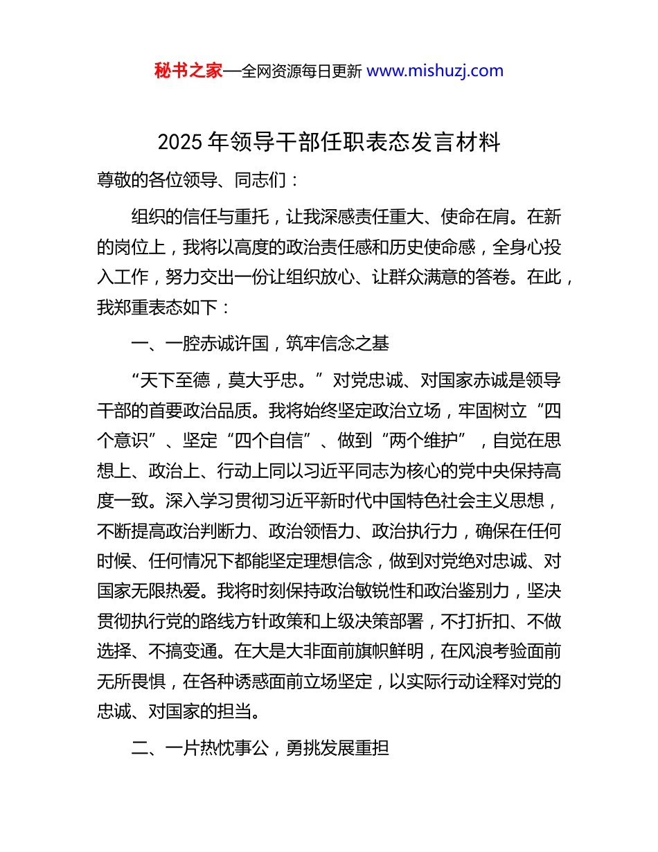 秘书之家—全网资源每日更新 www.mishuzj.com2025 年领导干部任职表态发言材料尊敬的各位领导、同志们:组织的信任与重托,让我深感责任重大、使命在肩。在新的岗位上,我将以高度的政治责任感和历史使命感,全身心投入工作,努力交出一份让组织放心、让群众满意的答卷。在此,我郑重表态如下:一、一腔赤诚许国,筑牢信念之基“天下至德,莫大乎忠。”对党忠诚、对国家赤诚是领导干部的首要政治品质。我将始终坚定政治立场,牢固树立“四个意识”、坚定“四个自信”、做到“两个维护”,自觉在思想上、政治上、行动上同以习近平同志为核心的党中央保持高度一致。深入学习贯彻习近平新时代中国特色社会主义思想,不断提高政治判断力、政治领悟力、政治执行力,确保在任何时候、任何情况下都能坚定理想信念,做到对党绝对忠诚、对国家无限热爱。我将时刻保持政治敏锐性和政治鉴别力,坚决贯彻执行党的路线方针政策和上级决策部署,不打折扣、不做选择、不搞变通。在大是大非面前旗帜鲜明,在风浪考验面前无所畏惧,在各种诱惑面前立场坚定,以实际行动诠释对党的忠诚、对国家的担当。二、一片热忱事公,勇挑发展重担秘书之家—全网资源每日更新 www.mishuzj.com“为官避事平生耻。”强烈的事业心和责任感是领导干部做好工作的前提和基础。我将以对事业高度负责的态度,全身心投入到工作中去,把心思用在干事业上,把精力放在抓落实上。面对新的岗位、新的任务,我将加强学习,不断提高自身的领导能力和业务水平,努力成为工作的行家里手。深入研究工作中的重点、难点问题,积极探索解决问题的新思路、新方法,勇于创新、敢于突破,以创新的思维和举措推动工作取得新进展。我将以“功成不必在我”的境界和“功成必定有我”的担当,咬定青山不放松,一张蓝图绘到底。围绕中心工作和发展目标,精心谋划、科学决策,团结带领广大干部群众,攻坚克难、奋勇前行,努力开创工作新局面,为推动事业发展贡献自己的力量。三、一心一意服务,践行为民初心“民为邦本,本固邦宁。”为人民服务是我们党的根本宗旨,也是领导干部的初心和使命。我将始终牢记这一宗旨,把人民放在心中最高位置,坚持以人民为中心的发展思想,用心用情用力解决好群众的操心事、烦心事、揪心事。我将深入基层、深入群众,倾听群众呼声,了解群众需求,关心群众疾苦。坚持问政于民、问需于民、问计于民,从群众中来、到群众中去,使各项决策和工作更加符合群众的意愿和利益。我将不断提高服务群众的能力和水平,优化服务流程、提升服务质量,秘书之家—全网资源每日更新 www.mishuzj.com让群众办事更方便、更快捷、更舒心。以实际行动赢得群众的信任和支持,不断增强群众的获得感、幸福感、安全感。四、一以贯之实干,确保工作落地“空谈误国,实干兴邦。”执行力是领导干部的重要能力,抓落实是领导干部的重要职责。我将大力弘扬求真务实、真抓实干的工作作风,以钉钉子精神抓工作落实,确保各项工作任务按时、高质量完成。我将建立健全工作责任制,明确目标任务、责任分工和工作时限,加强对工作的跟踪督促和检查考核,确保工作有人抓、有人管、有人落实。对重点工作和重大项目,我将亲自研究、亲自部署、亲自推动,做到事事有回音、件件有着落。我将勇于担当、敢于负责,面对困难和挑战不退缩、不推诿,主动承担起应尽的责任。以踏石留印、抓铁有痕的劲头,一抓到底、善始善终,确保各项工作取得实实在在的成效。五、一身正气履职,严守纪律红线“公生明,廉生威。”廉洁自律是领导干部的为政之本、立身之基。我将严格遵守党的纪律和规矩,自觉遵守廉洁自律的各项规定,做到心有所畏、言有所戒、行有所止。我将加强自身修养,树立正确的权力观、地位观、利益观,自觉抵制各种腐朽思想的侵蚀。坚持依法用权、秉公用权、廉洁用权,不搞特权、不以权谋私,做到清清白白做人、干干净净做事。我将自觉接受组织和群众的监督,主动把权力关进制度的笼子里,秘书之家—全网资源每日更新 www.mishuzj.com让权力在阳光下运行。加强对亲属和身边工作人员的教育管理,严格要求他们遵守法律法规和廉洁自律的各项规定,共同维...