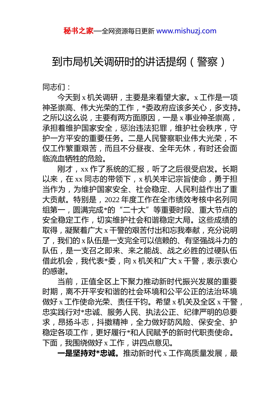 秘书之家—全网资源每日更新 www.mishuzj.com到市局机关调研时的讲话提纲(警察)同志们:今天到 x 机关调研,主要是来看望大家。x 工作是一项神圣崇高、伟大光荣的工作,*委政府应该多关心,多支持。之所以这么说,主要有两方面原因,一是 x 事业神圣崇高,承担着维护国家安全,惩治违法犯罪,维护社会秩序,守护一方平安的重要任务。二是人民警察职业伟大光荣,不仅工作繁重艰苦,而且不分昼夜、全年无休,有时还会面临流血牺牲的危险。刚才,xx 作了系统的汇报,听了之后很受启发。长期以来,在 xx 同志的带领下,x 机关牢记宗旨使命,勇于担当作为,为维护国家安全、社会稳定、人民利益作出了重大贡献。特别是,2022 年度工作在全市绩效考核中名列同组第一,圆满完成*的“二十大”等重要时段、重大节点的安全稳定工作,切实维护社会和谐稳定大局。这些成绩的取得,凝聚着广大 x 干警的艰苦付出和忘我奉献,充分说明了,我们的 x 队伍是一支完全可以信赖的、有坚强战斗力的队伍,是一支召之即来、来之能战、战之必胜的过硬队伍借此机会,我代表*委,向 x 机关和广大 x 干警,表示衷心的感谢。当前,正值全区上下聚力推动新时代振兴发展的重要时期,离不开平安和谐的社会环境和公平公正的法治环境做好 x 工作使命光荣、责任千钧。希望 x 机关及全区 x 干警,忠实践行对*忠诚、服务人民、执法公正、纪律严明的总要求,昂扬斗志,抖擞精神,全力做好防风险、保安全、护稳定各项工作,更好履行*和人民赋予的新时代职责使命。下面,我围绕做好 x 工作,讲四点意见。一是坚持对*忠诚。推动新时代 x 工作高质量发展,最秘书之家—全网资源每日更新 www.mishuzj.com根本的保证是坚持*的领导。要坚定理想信念,牢牢把握“x 姓*”的根本政治属性,坚持以*的旗帜为旗帜、以*的方向为方向、以*的意志为意志,永葆绝对忠诚、绝对纯洁、绝对可靠的政治本色。要强化理论武装,坚持不懈用**************思想凝心铸魂,深刻领悟“两个确立”的决定性意义,坚决做到“两个维护”,始终在思想上、政治上、行动上同以***同志为核心的*中央保持高度一致。要强化责任担当,主动对接服务*委重大决策、重点工作,围绕建设更高水平的“平安中国”当先锋、作表率,在捍卫政治安全方面树样板,在维护社会稳定方面求突破,在健全基层治理方面谋创新,全面护航新时代振兴发展。二是坚持服务人民。坚定贯彻执行*的群众路线,聚焦人民群众对平安中国的更高期待,严格落实打防管控各项措施,让人民群众感到安全触手可及,就在身边。要织密“防”的网络。坚定不移贯彻总体国家安全观,始终把防范政治安全风险置于首位,深化反邪教斗争,多措并举开展警示教育宣传,筑牢防恶祛邪的铜墙铁壁。探索建立立体化信息化社会治安防控体系,健全快速反应警务机制,提高街面见警率,强化重点区域、时段巡防巡控,保障公共安全形势保持总体稳定。要攥紧“打”的拳头。深入开展常态化扫黑除恶斗争,针对人民群众深恶痛绝的违法犯罪,坚持依法严打方针。着力破解打击治理电信网络诈骗违法犯罪难题,有力推进反诈宣传、专案攻坚,全力夺取反诈人民战争新胜利。依法维护信访秩序,对借维权之名以非法手段表达诉求,构成违反治安管理行为甚至犯罪的坚决依法处置。要强化“治”的合力。坚持共建共治共享持续推进“五员”基层治理新模式,把社区干部发展成为我们的情报信息员、矛盾纠纷化解员、法治宣传员、平安守护员、基层治理参谋员,完善群防群治机制,强化力量统筹、部门协同,形成警群结合共保平安良好局面。三是坚持执法公正。坚持以严格执法、公正司法守望秘书之家—全网资源每日更新 www.mishuzj.com公平正义,不断提升 x 工作法治化水平和执法公信力。要持续深化执法规范化建设,以宪法和法律为活动准则,让人民群众在每一起案件办理、每一件事情处理中都能感受到公平正义。研究制定我区现场执法活动、治安管理处罚裁量等具体指导意见,为一线执法提供精准指导、有力支撑要完善管理监督制约体系,持续推进受立案制度和刑事案件“两统一”改革,探索建立并完善案件评查、执法责任追究、常...