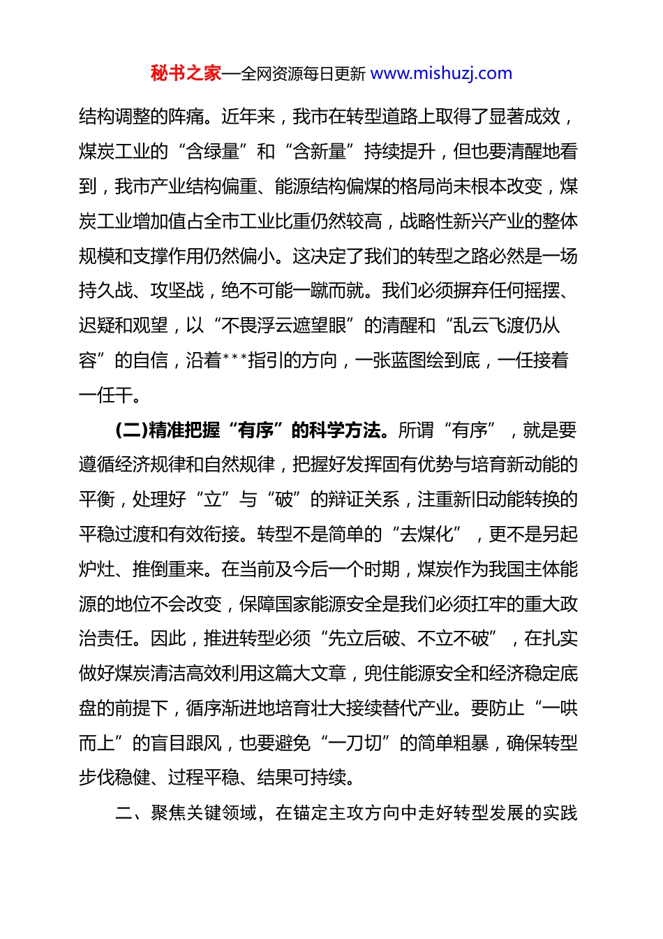 秘书之家—全网资源每日更新 www.mishuzj.com关于坚定有序推进转型发展的研讨材料同志们: 根据本次研讨交流安排,我围绕“坚定有序推进转型发展”这一****要求,联系思想和工作实际,作如下发言。秉纲而目自张,执本而末自从。在全省上下深入推进国家资源型经济转型综合配套改革试验区建设的关键时期,***亲临我省考察并作出****,特别强调了“坚定”和“有序”两个关键词,为我们破解转型难题、实现高质量发展指明了科学路径、提供了根本遵循。省委、市委相继召开全会,对标对表*******精神,细化了转型发展的“施工图”和“任务书”。我们必须深化思想认识,保持战略定力,以“功成不必在我”的精神境界和“功成必定有我”的历史担当,将宏伟蓝图一步步变为美好现实。一、深化思想认识,在把握核心要义中筑牢转型发展的理论根基转型发展是资源型地区实现可持续发展的必由之路,也是一道世界性难题。***提出的“坚定有序”四字方针,蕴含着深邃的战略考量和科学的方法论,是我们应对挑战、把握机遇的行动指南。(一)深刻领会“坚定”的战略定力。所谓“坚定”,就是要咬定青山不放松,锚定高质量发展和全方位转型这一核心目标,保持强大的战略定力,经得起短期经济波动的考验,受得住产业秘书之家—全网资源每日更新 www.mishuzj.com结构调整的阵痛。近年来,我市在转型道路上取得了显著成效,煤炭工业的“含绿量”和“含新量”持续提升,但也要清醒地看到,我市产业结构偏重、能源结构偏煤的格局尚未根本改变,煤炭工业增加值占全市工业比重仍然较高,战略性新兴产业的整体规模和支撑作用仍然偏小。这决定了我们的转型之路必然是一场持久战、攻坚战,绝不可能一蹴而就。我们必须摒弃任何摇摆、迟疑和观望,以“不畏浮云遮望眼”的清醒和“乱云飞渡仍从容”的自信,沿着***指引的方向,一张蓝图绘到底,一任接着一任干。(二)精准把握“有序”的科学方法。所谓“有序”,就是要遵循经济规律和自然规律,把握好发挥固有优势与培育新动能的平衡,处理好“立”与“破”的辩证关系,注重新旧动能转换的平稳过渡和有效衔接。转型不是简单的“去煤化”,更不是另起炉灶、推倒重来。在当前及今后一个时期,煤炭作为我国主体能源的地位不会改变,保障国家能源安全是我们必须扛牢的重大政治责任。因此,推进转型必须“先立后破、不立不破”,在扎实做好煤炭清洁高效利用这篇大文章,兜住能源安全和经济稳定底盘的前提下,循序渐进地培育壮大接续替代产业。要防止“一哄而上”的盲目跟风,也要避免“一刀切”的简单粗暴,确保转型步伐稳健、过程平稳、结果可持续。二、聚焦关键领域,在锚定主攻方向中走好转型发展的实践秘书之家—全网资源每日更新 www.mishuzj.com路径市委全会明确提出了深入实施“融入 xx 区域、打造桥头堡”重大战略,扎实推动转型“四步走”,持续深耕“四大赛道”,努力建设能源之城、算力之城、文化之城的目标。这为我们“坚定有序推进转型发展”提供了清晰的实践载体。(一)以建设“能源之城”为牵引,大力推动能源革命迈出新步伐。能源是我们的传统优势,也是转型发展必须抓好的“牛鼻子”。我们要坚决扛牢保障国家能源安全的重大使命,持续深化能源革命综合改革试点。一是做优做强煤炭产业。加快推进煤矿智能化建设,力争到 2025 年底,全市大型煤矿智能化工作面建成率达到 100%。深入推动煤炭分质分级梯级利用,大力发展现代煤化工,推动煤炭从单一燃料向原料、材料和终端产品转变,不断延伸产业链、提升价值链。二是加速发展新能源和清洁能源。抓住国家大力发展绿色能源的机遇,统筹推进风电、光伏、氢能、地热能和储能产业发展。预计到 2025 年底,全市新能源和清洁能源装机占比有望达到 42%,绿电交易规模继续保持全国前列,加快构建清洁低碳、安全高效的新型能源体系,为建设全国重要绿色能源和综合能源基地奠定坚实基础。(二)以建设“算力之城”和产业升级为核心,着力构建现代化产业体系。产业升级是转型发展的重中之重。我们要坚持高端化、智能化、绿色化方向,推动科技创新与产业创新深度融合。秘书之家—全网资源每日更新 www.mishuzj.com一是...